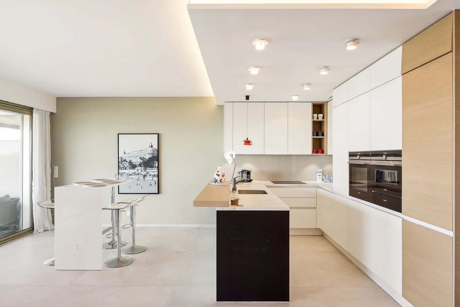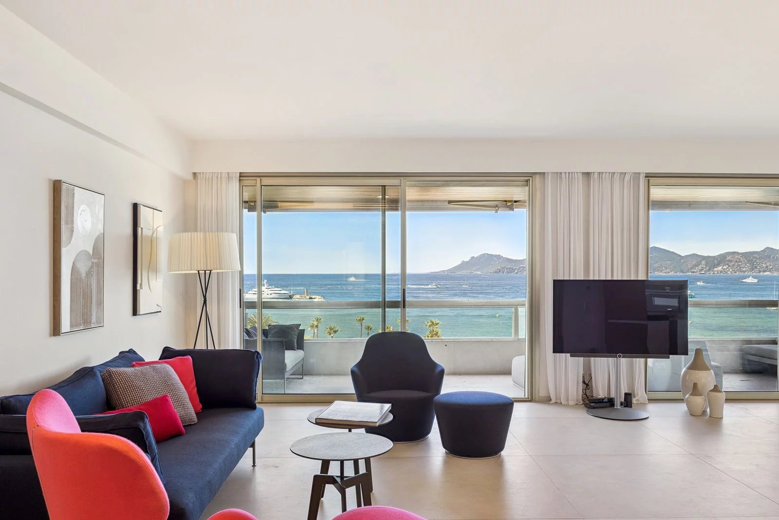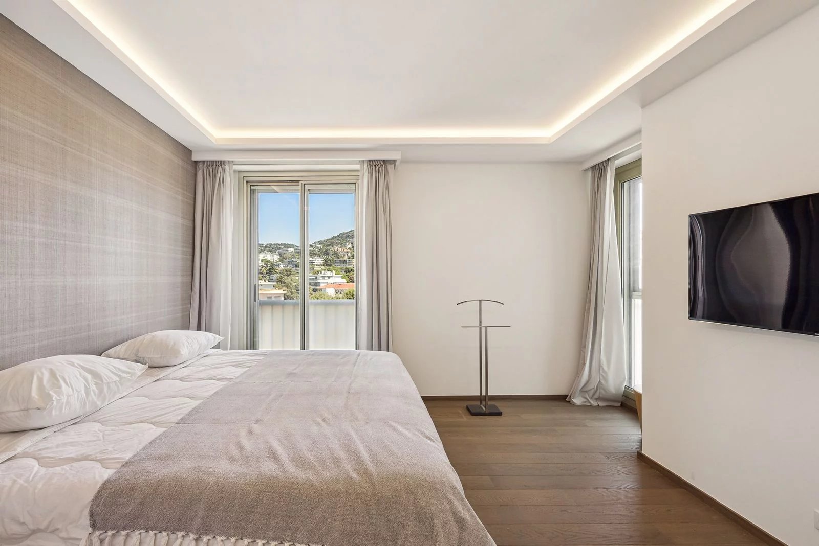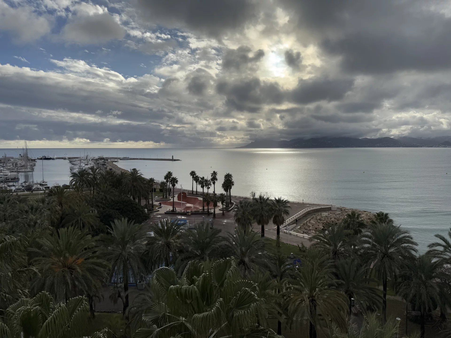 Ideally located on the Croisette, this apartment of approximately 110 m² includes: a large living room, dining room opening onto a terrace, an American-style kitchen and 2 en-suite bedrooms with shower room and bathroom. Very bright apartment. High floor.