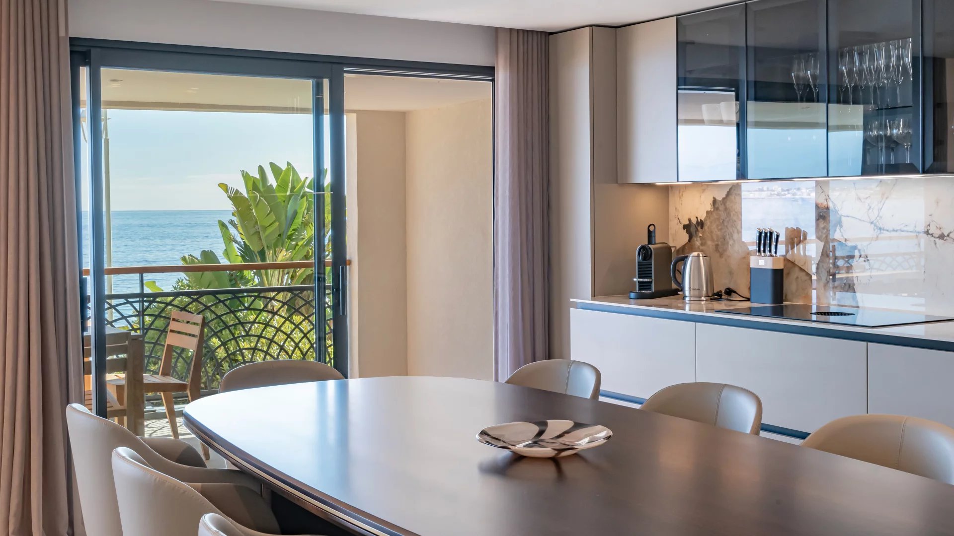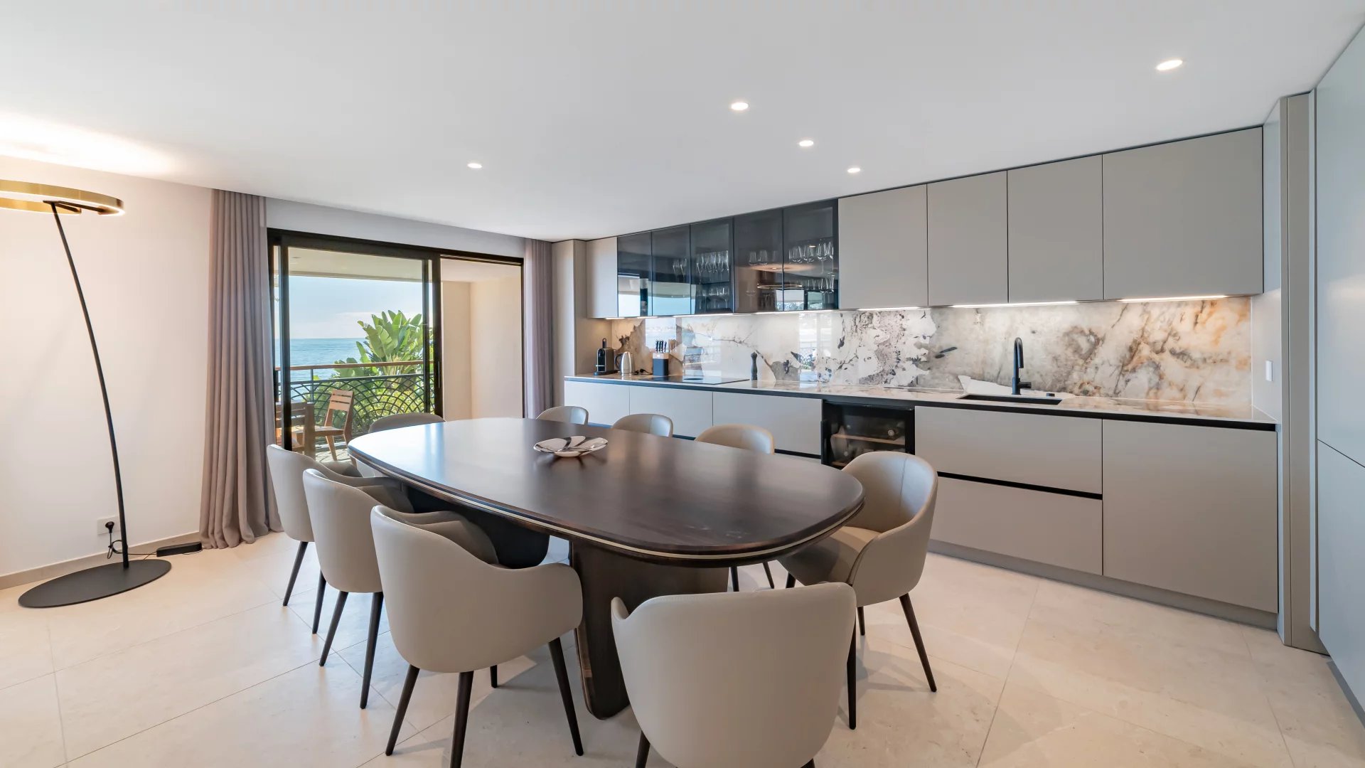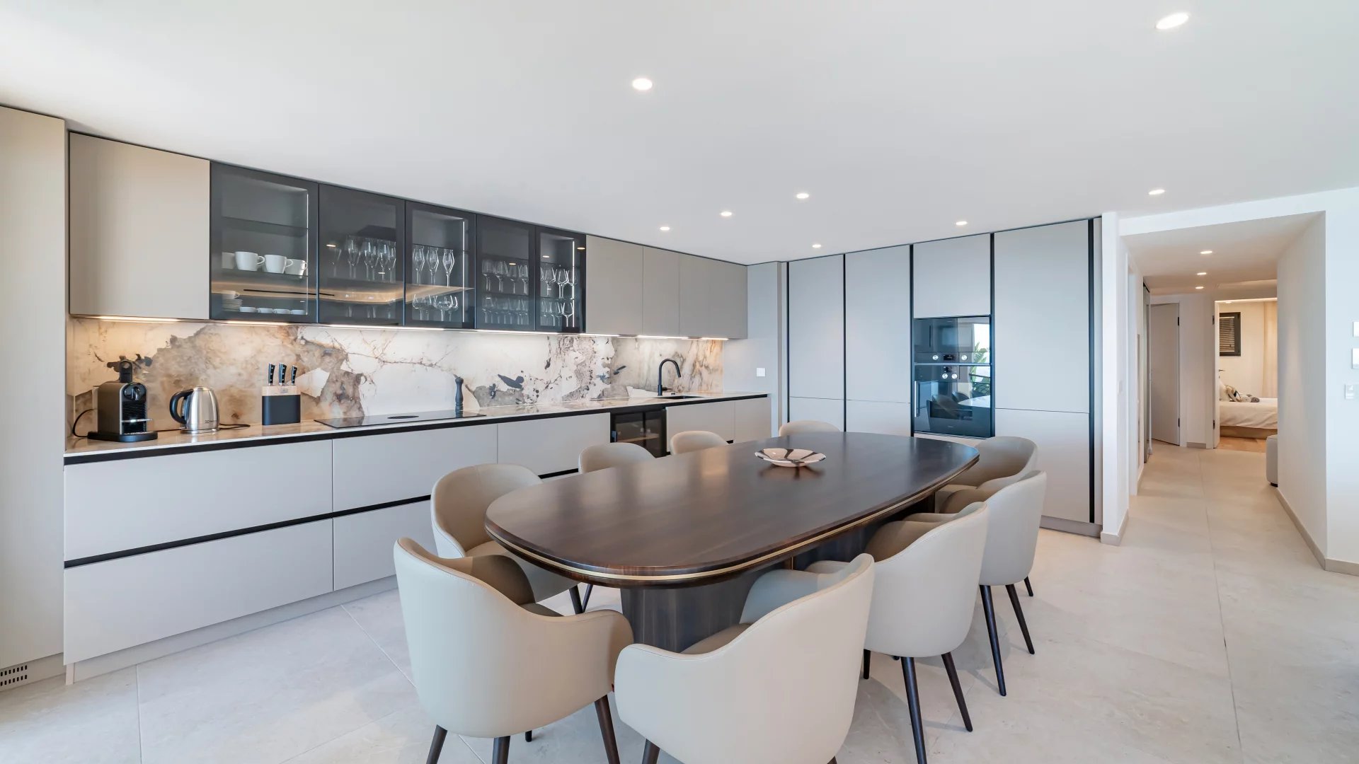 The entrance opens into a spacious living area with lounge, dining room, and a fully equipped open kitchen, all leading onto a large terrace facing the sea.