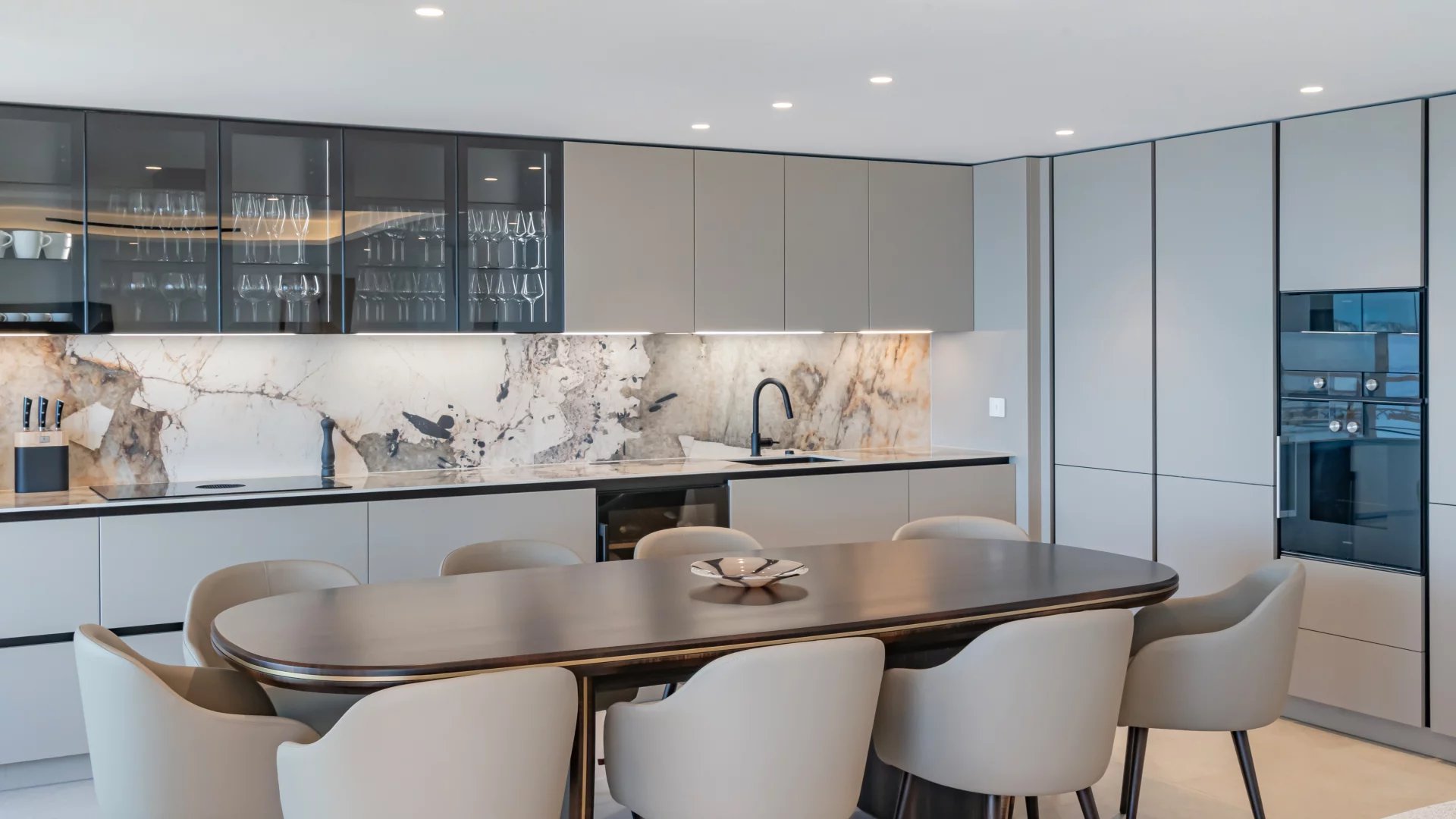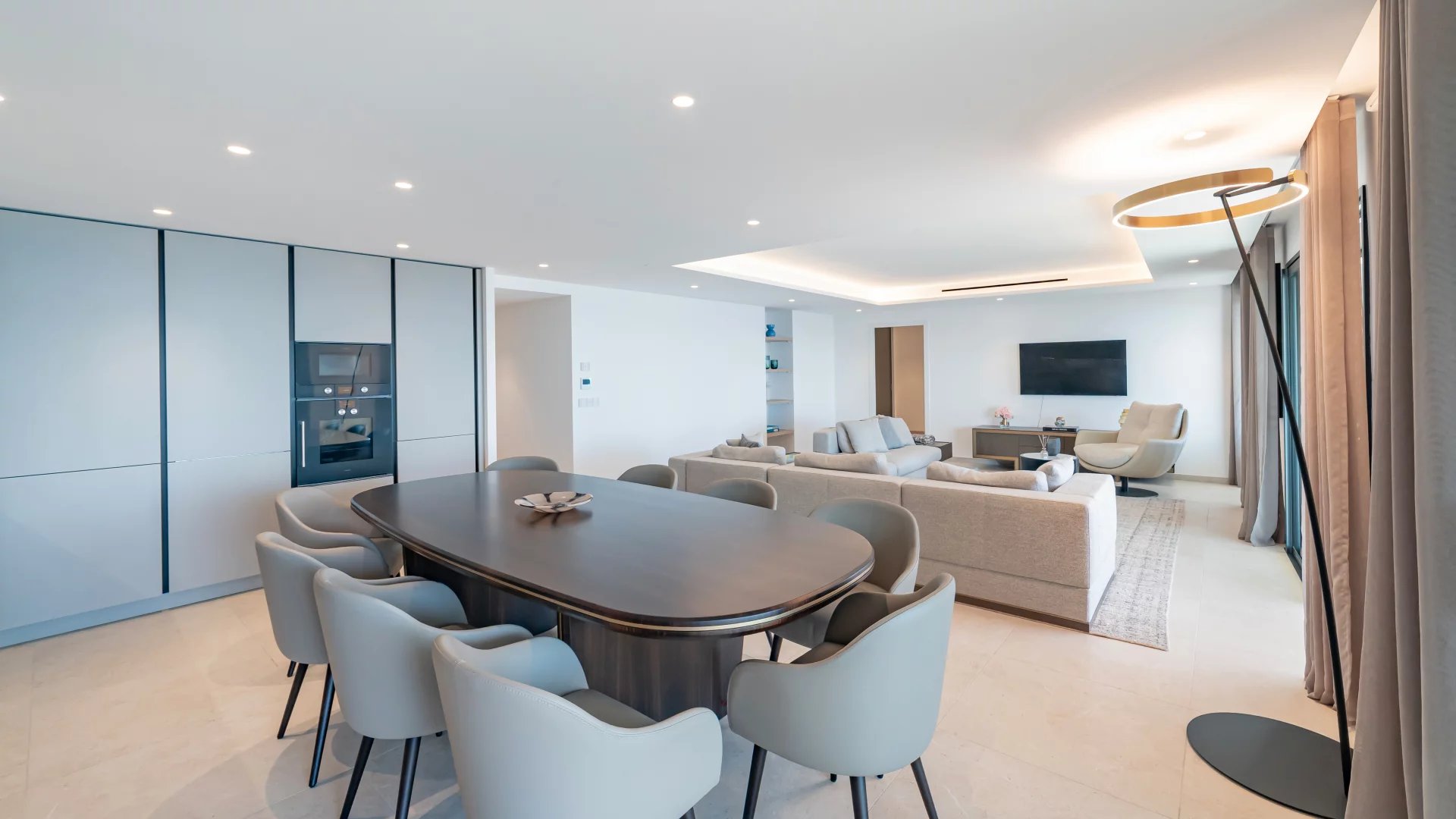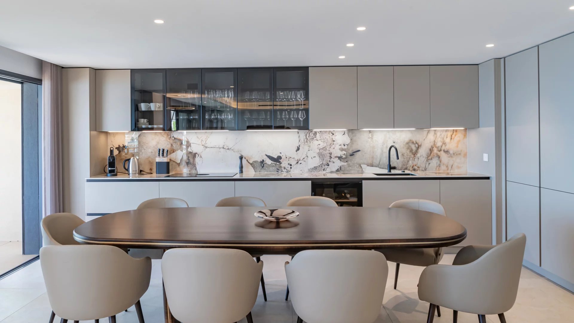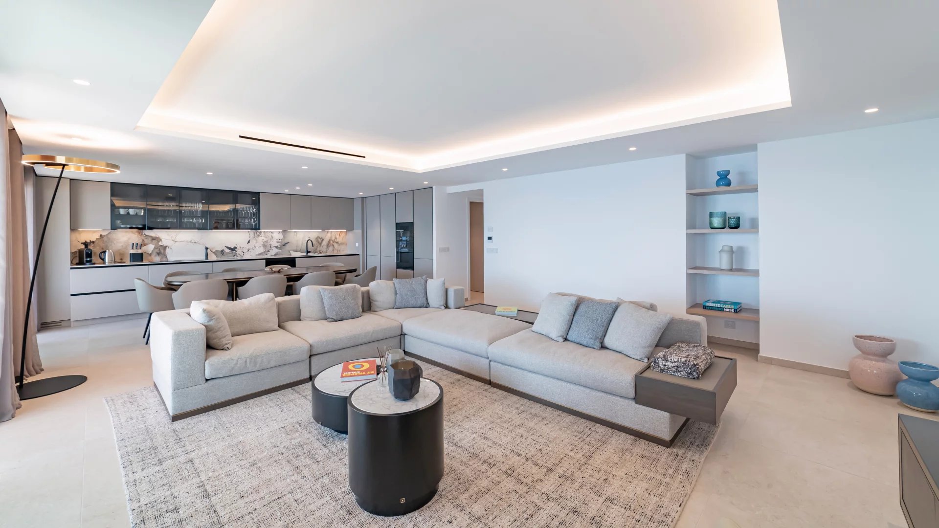 The entrance opens into a spacious living area with lounge, dining room, and a fully equipped open kitchen, all leading onto a large terrace facing the sea.
