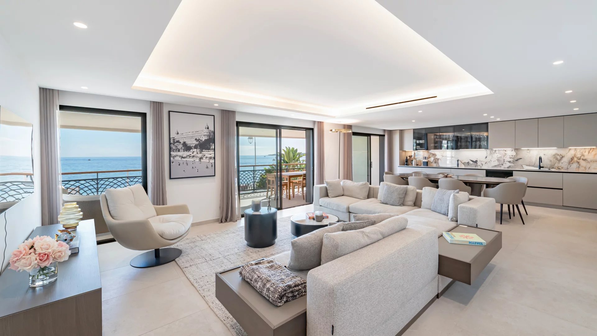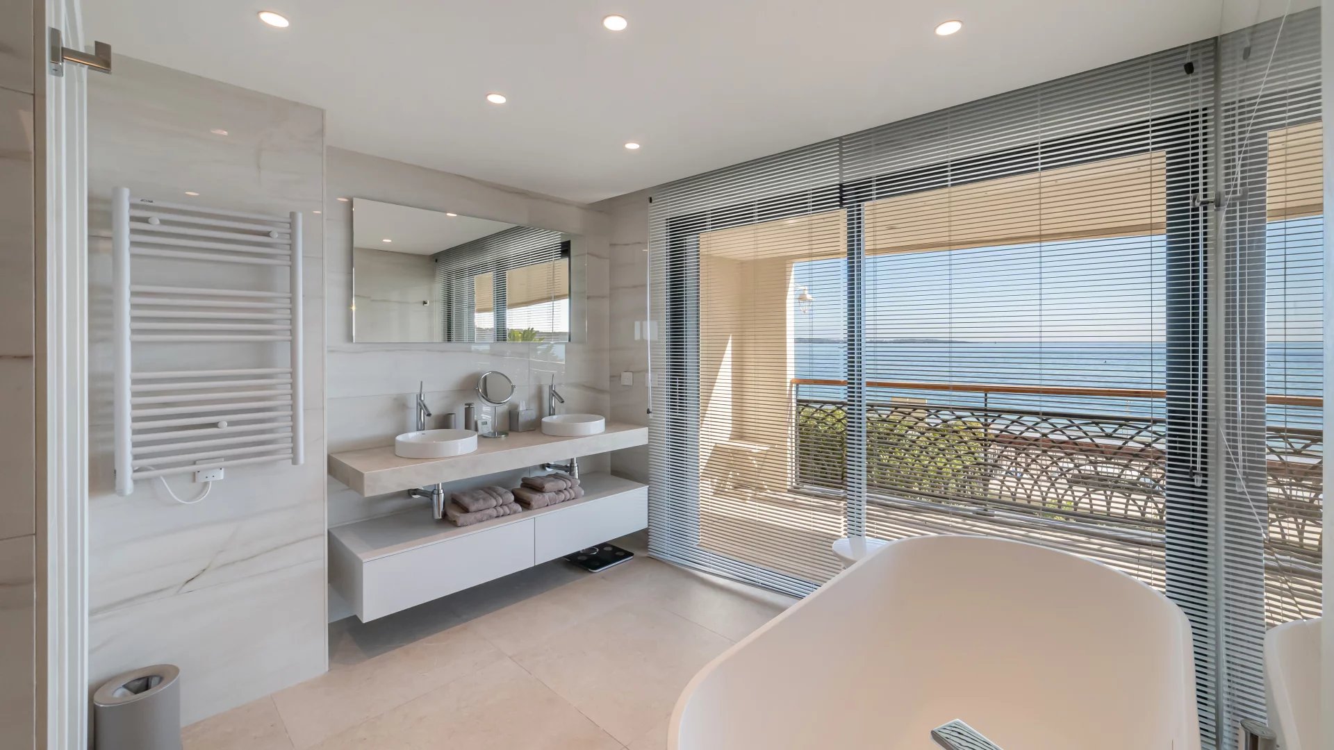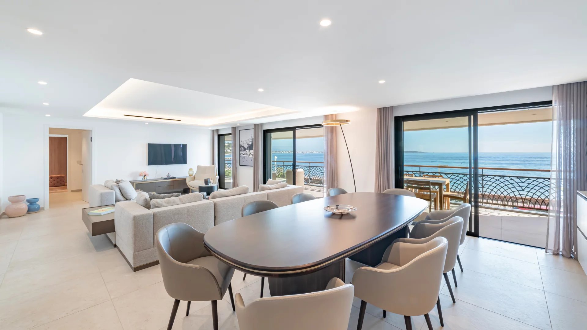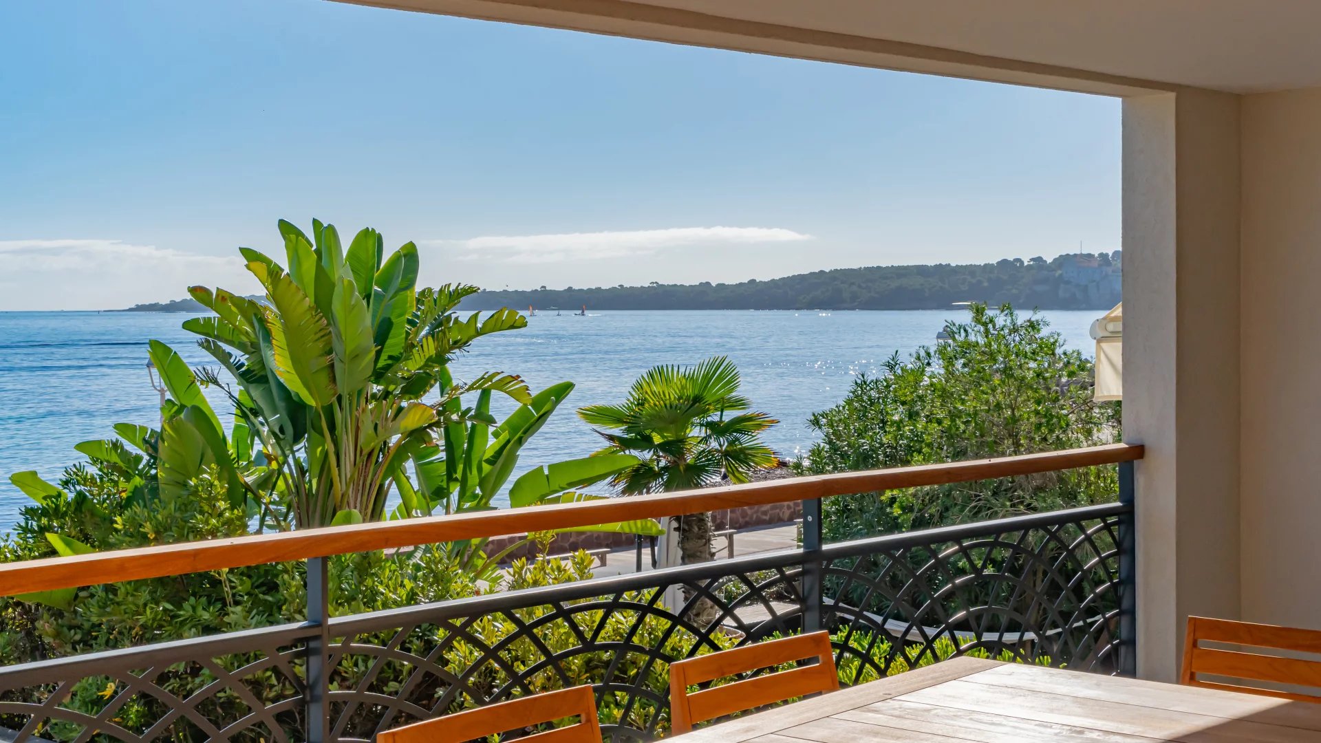 Set on the seafront, on the first floor of a modern residence, the apartment enjoys a stunning view over the sea, the Lérins Islands, and Cap d’Antibes.