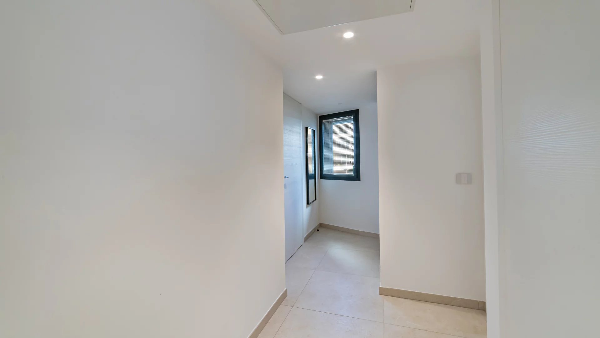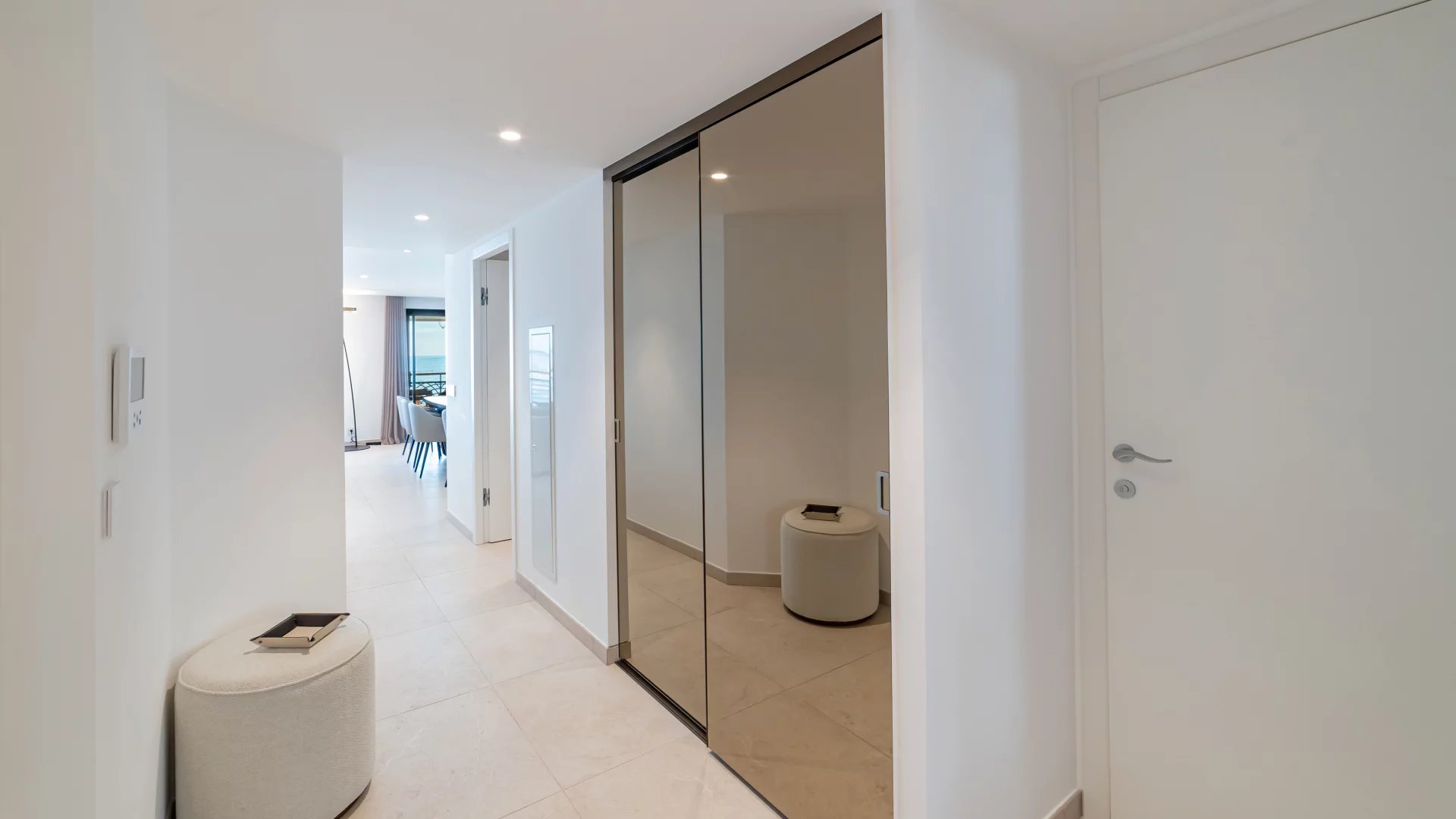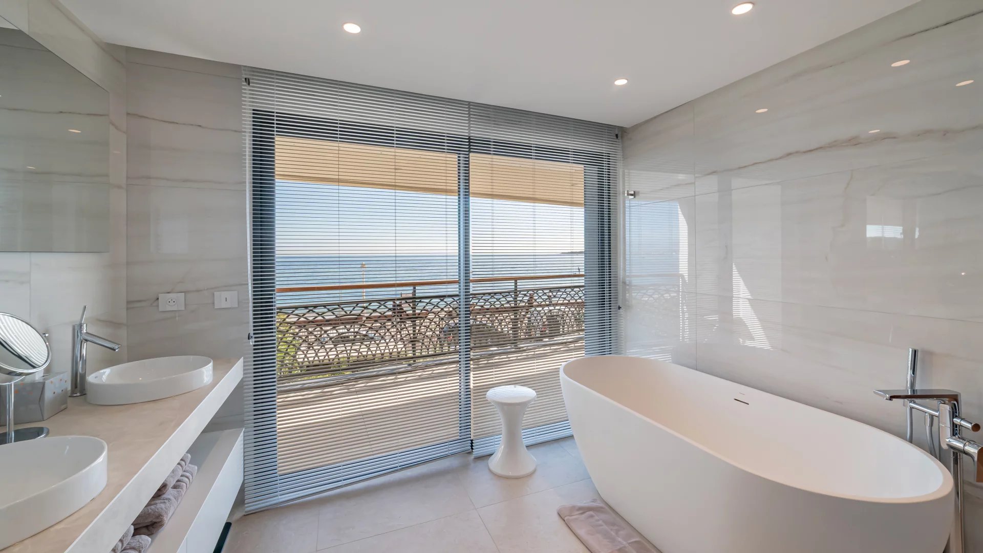 Set on the seafront, on the first floor of a modern residence, the apartment enjoys a stunning view over the sea, the Lérins Islands, and Cap d’Antibes.