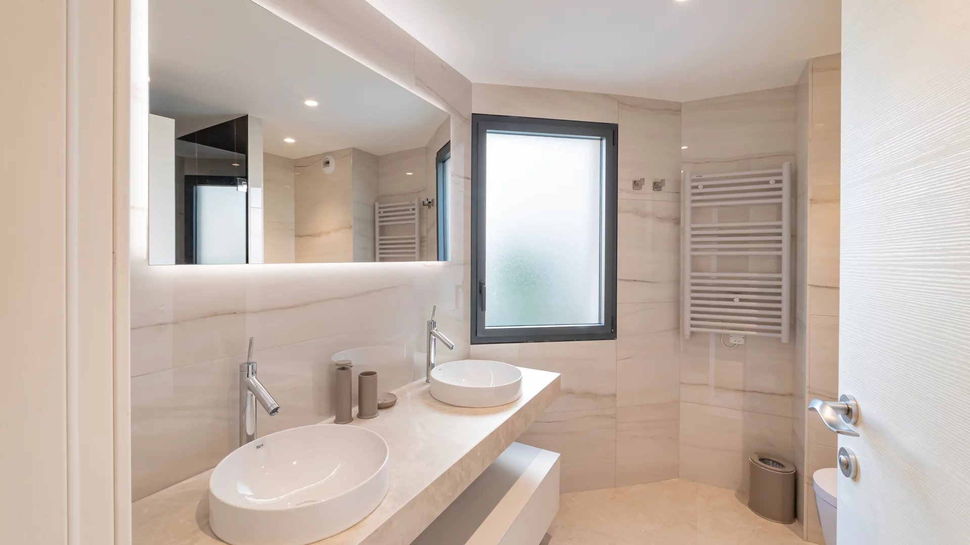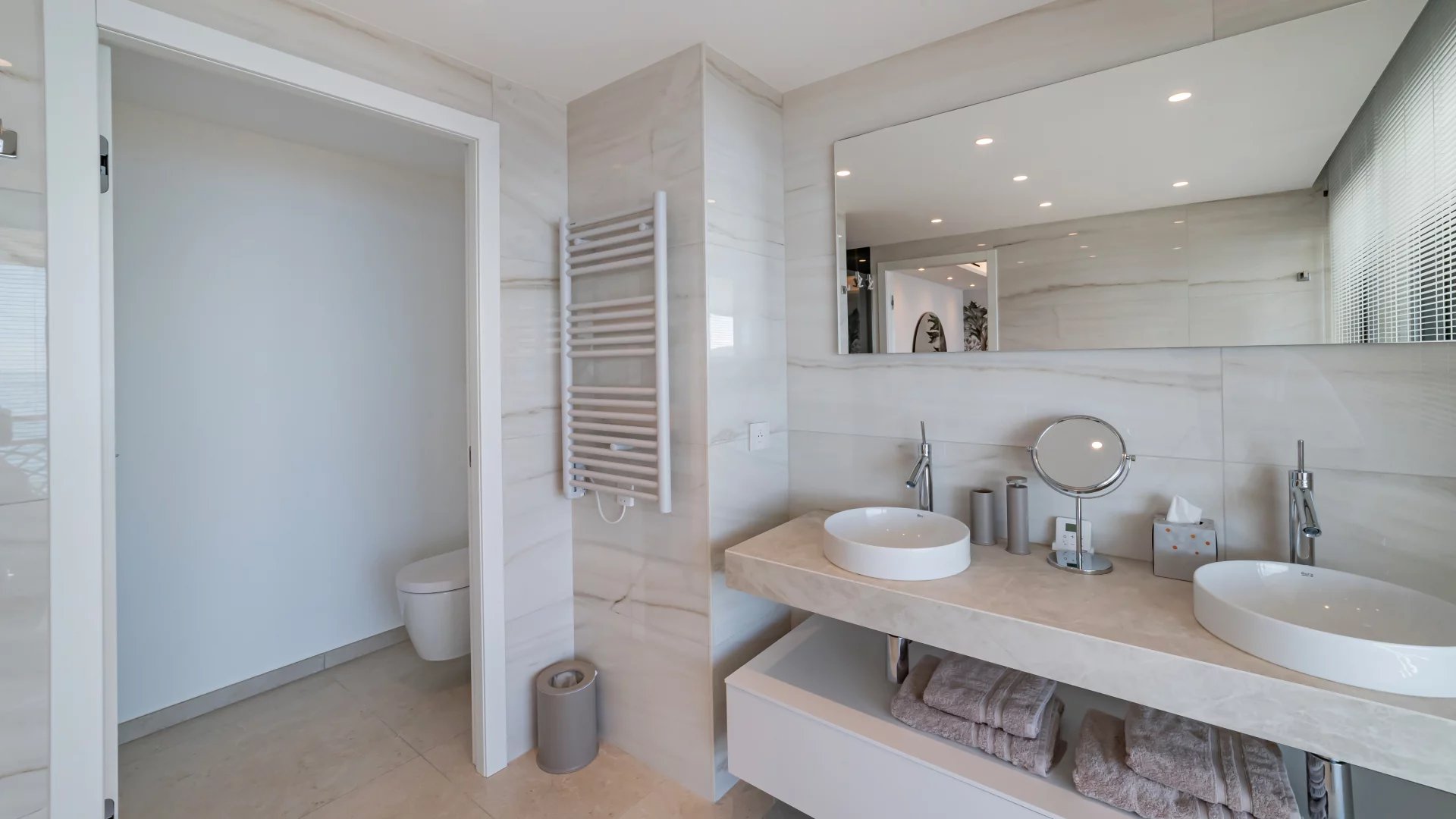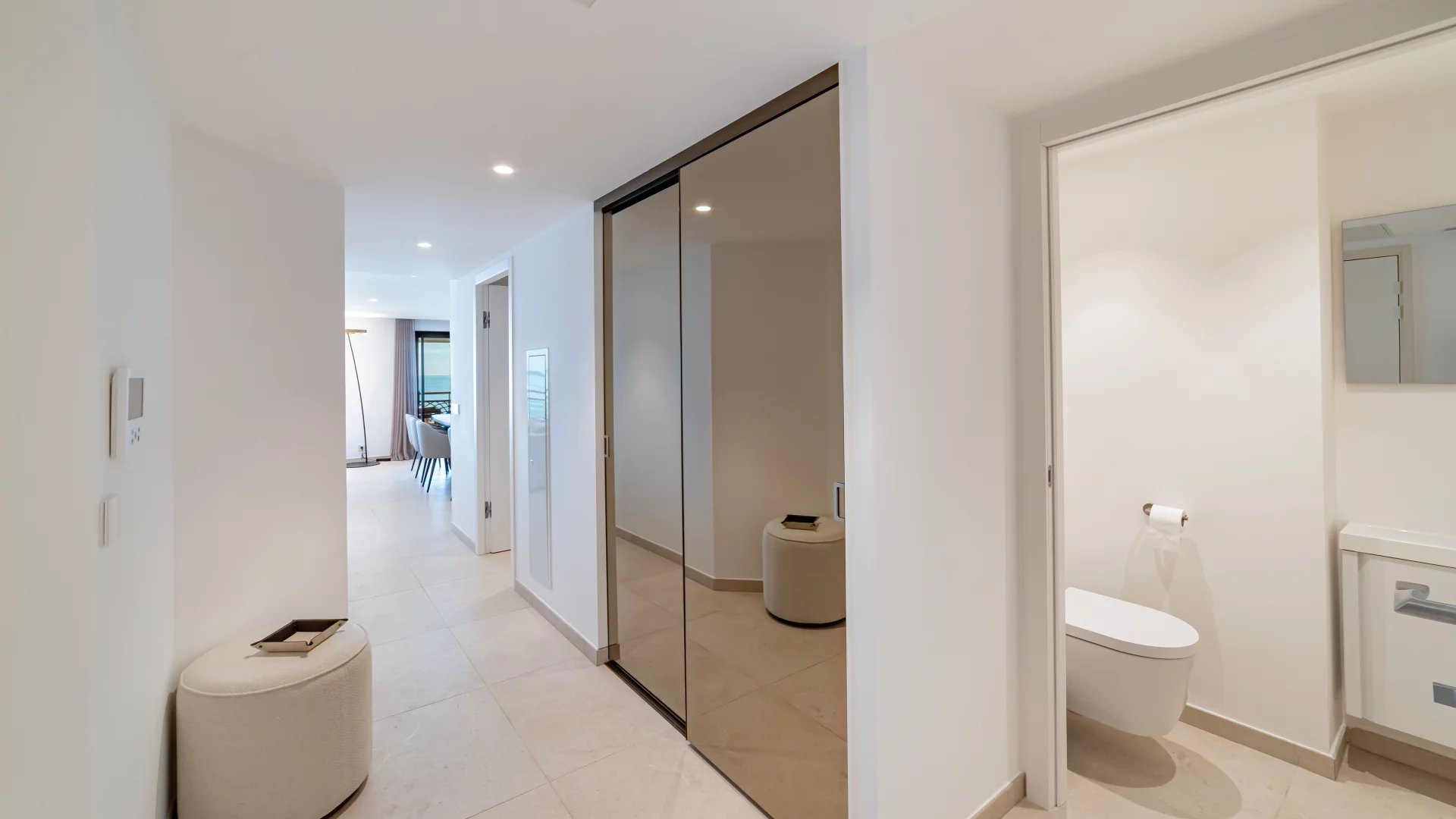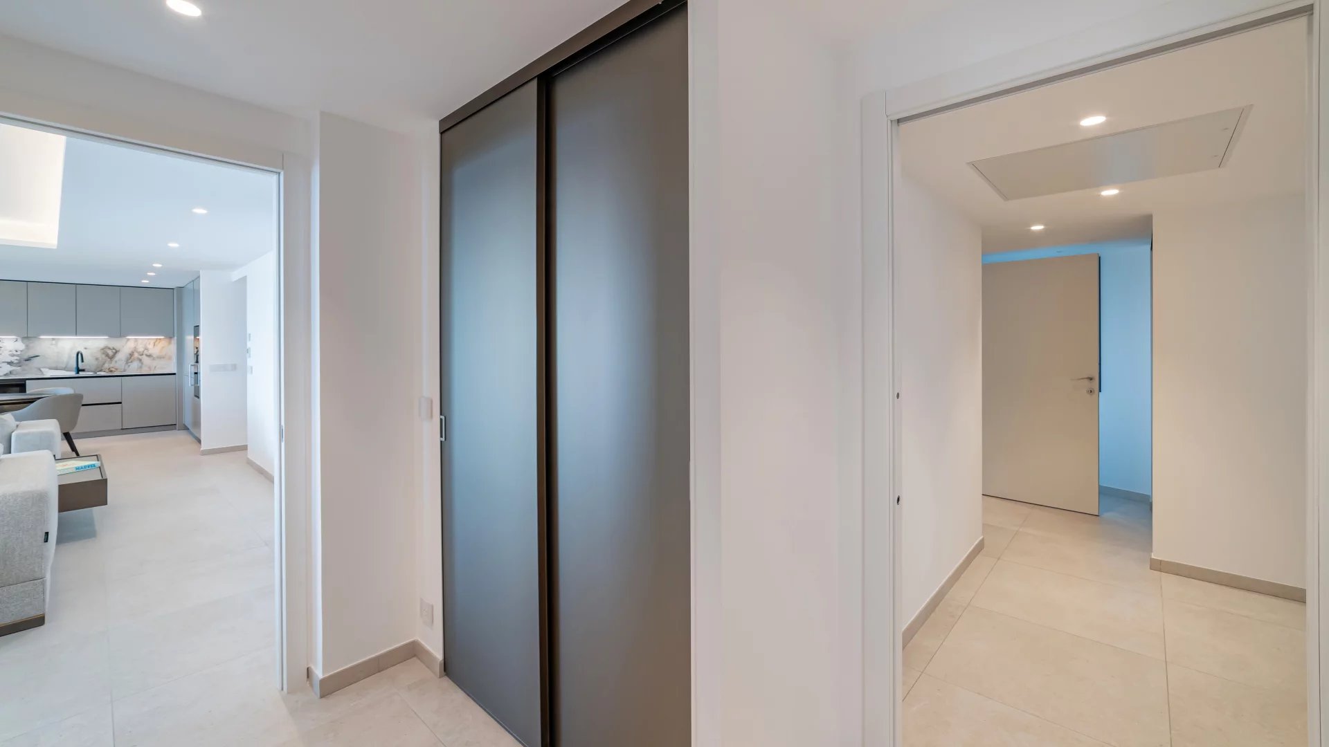 Set on the seafront, on the first floor of a modern residence, the apartment enjoys a stunning view over the sea, the Lérins Islands, and Cap d’Antibes.