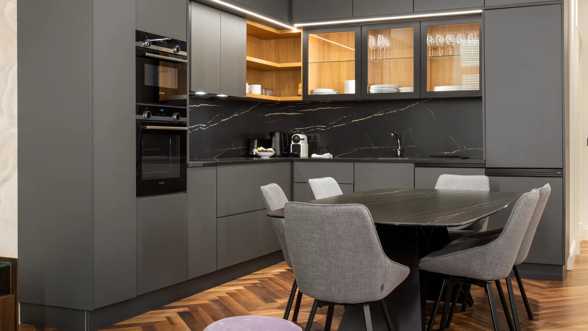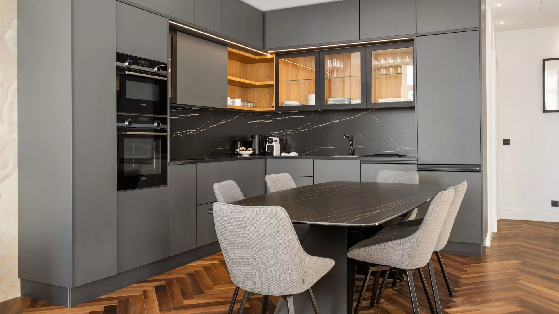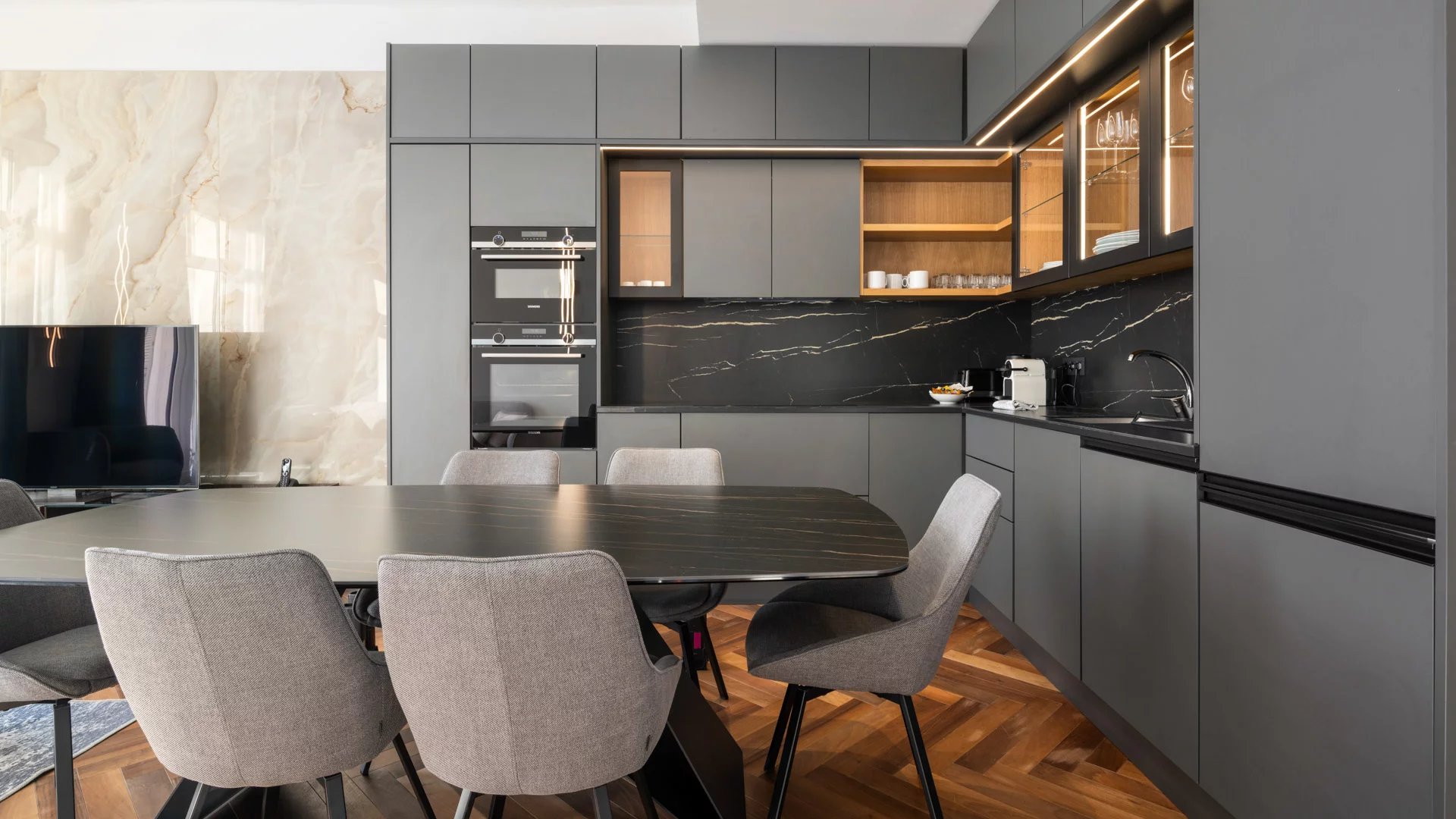 Entrance leading to the reception room opening onto a balcony, comprising lounge, dining area and fully-equipped open-plan kitchen