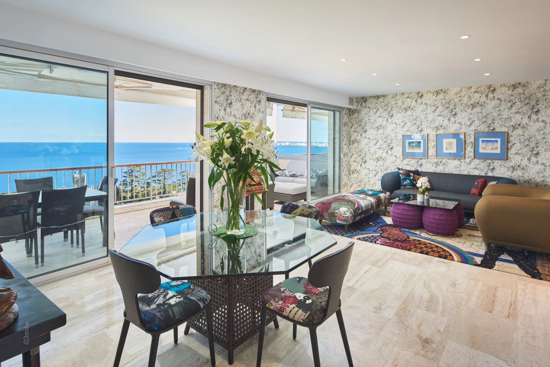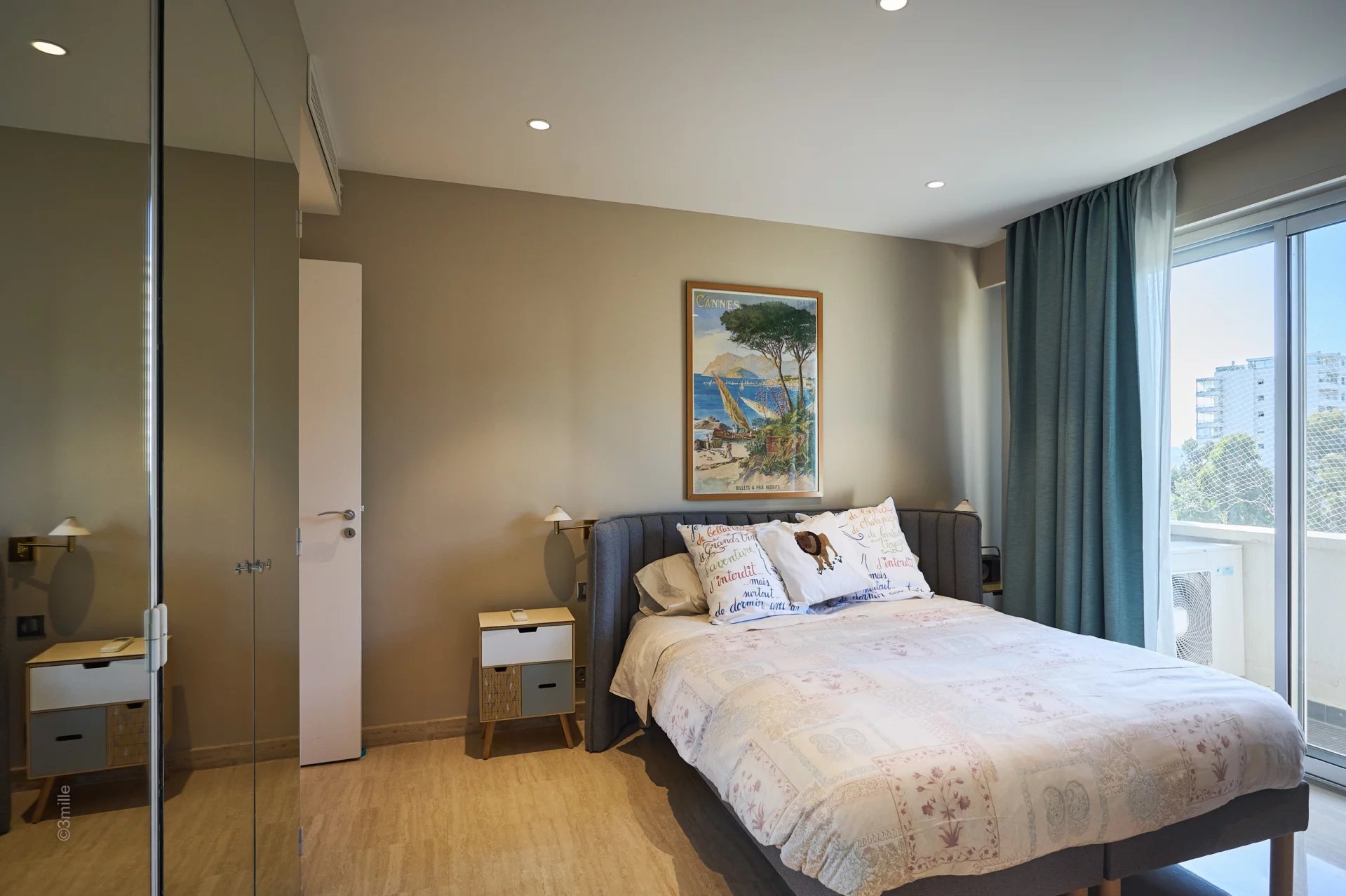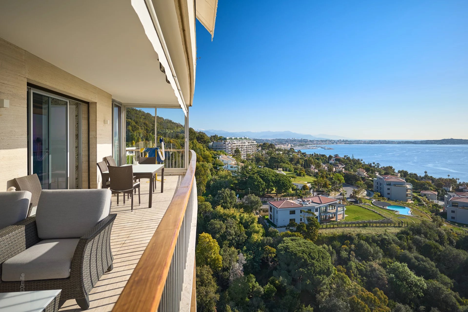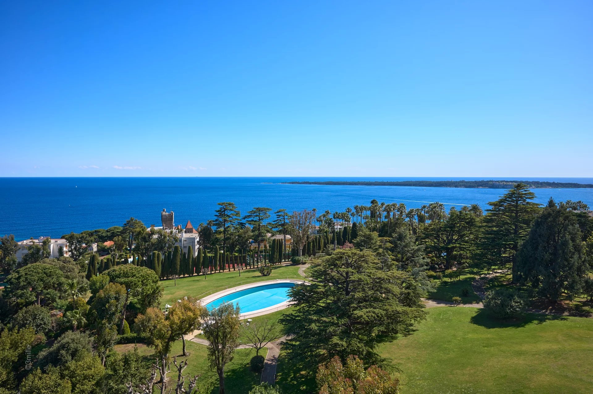 On the top of Cannes, in a high standing residence with swimming-pool, tennis, fitness room and park of 11 ha, apartment enjoying magnificent view on the Bay of Cannes and Lerins Islands.