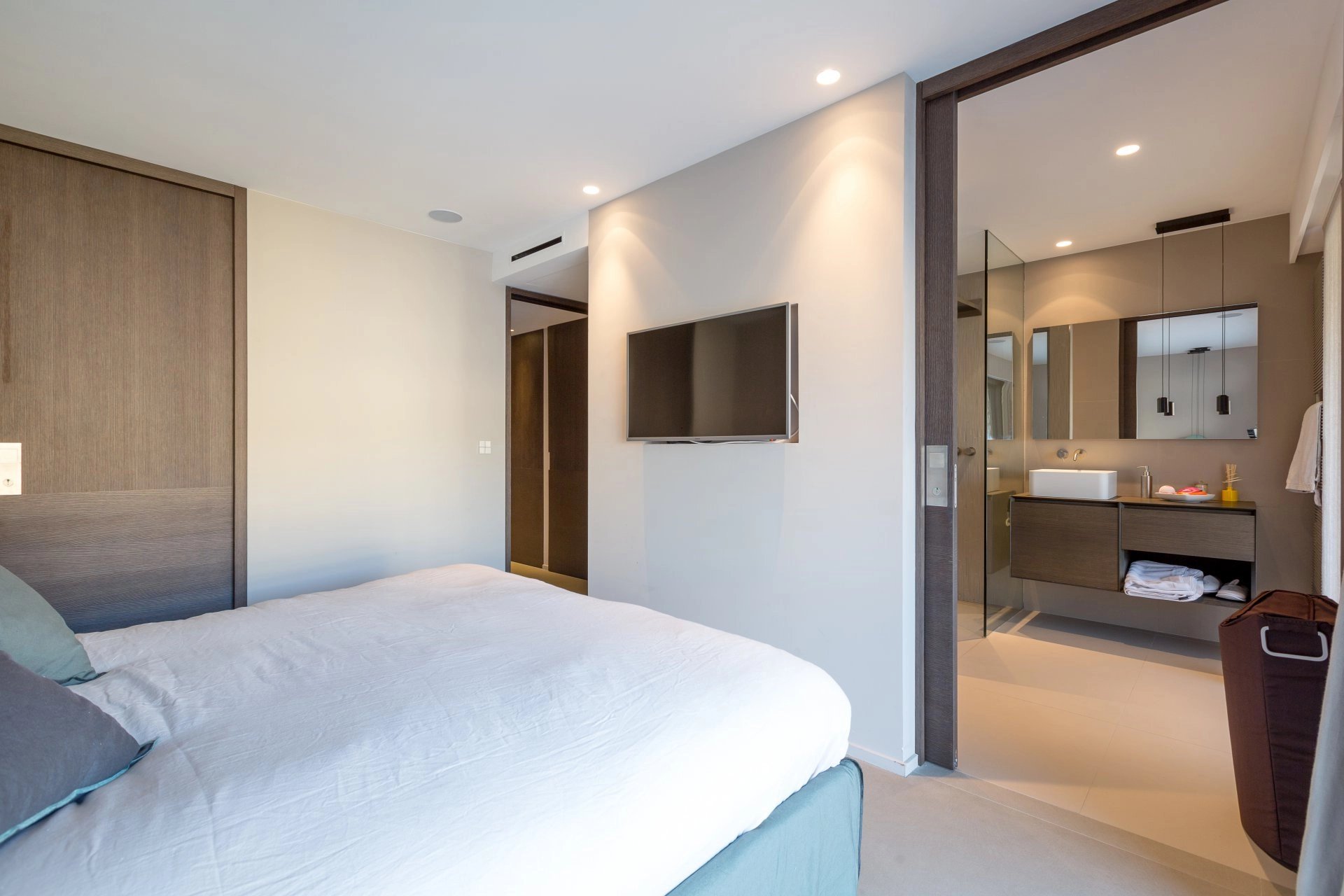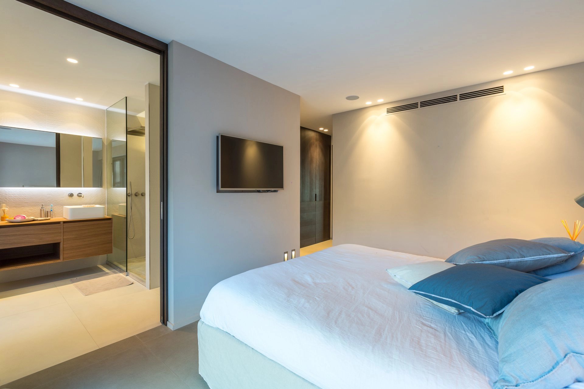 South Side: Master bedroom (king size bed) opening onto the terrace, sea view, full bathroom, dressing room and TV.