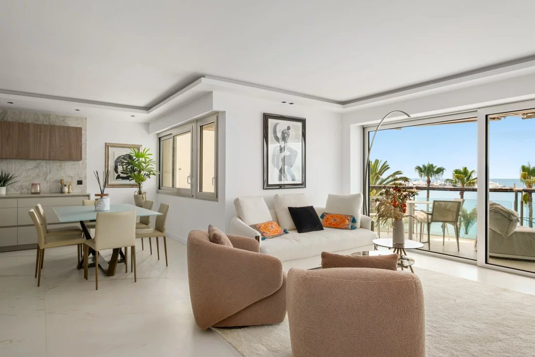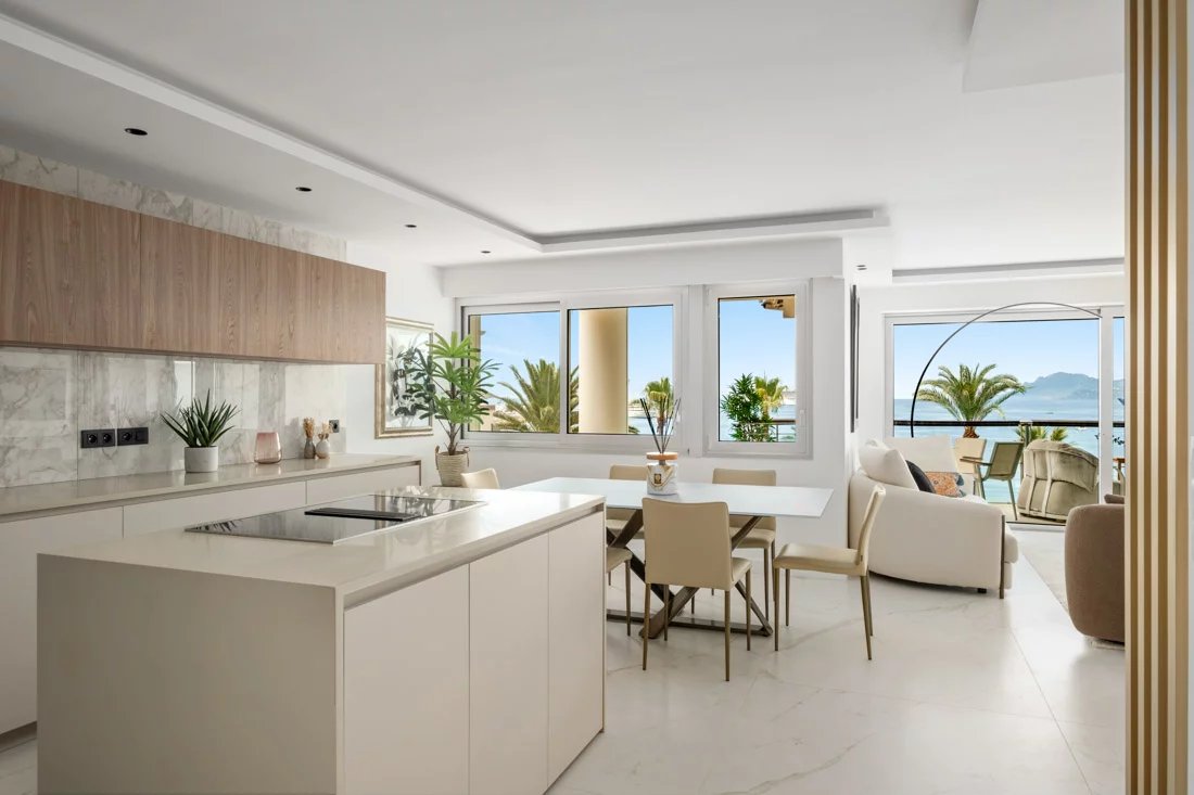Located on the 6th floor of one of the Croisette’s most prestigious residences, this stunning two-bedroom apartment boasts a breathtaking panoramic sea view over the Bay of Cannes.