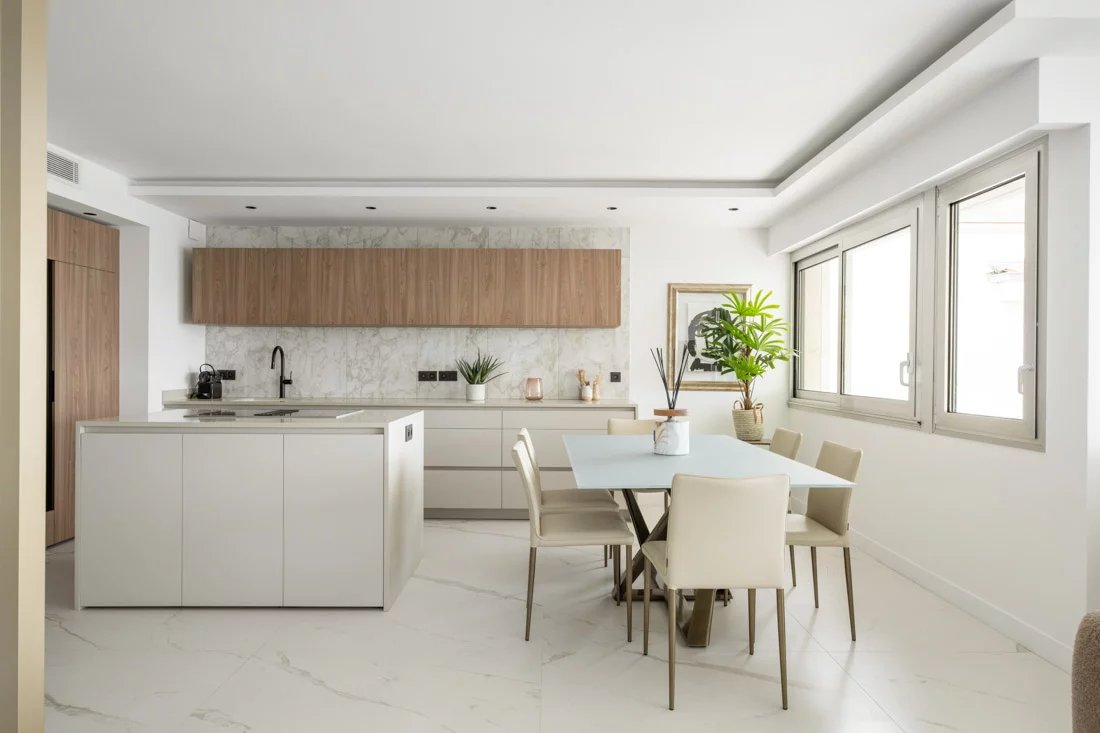 A bright and spacious living room with a fully fitted high-end kitchen