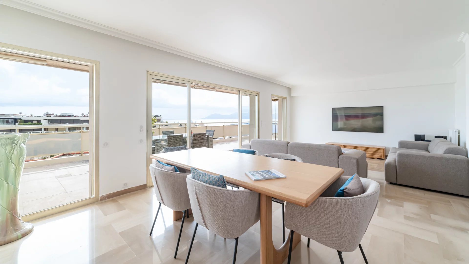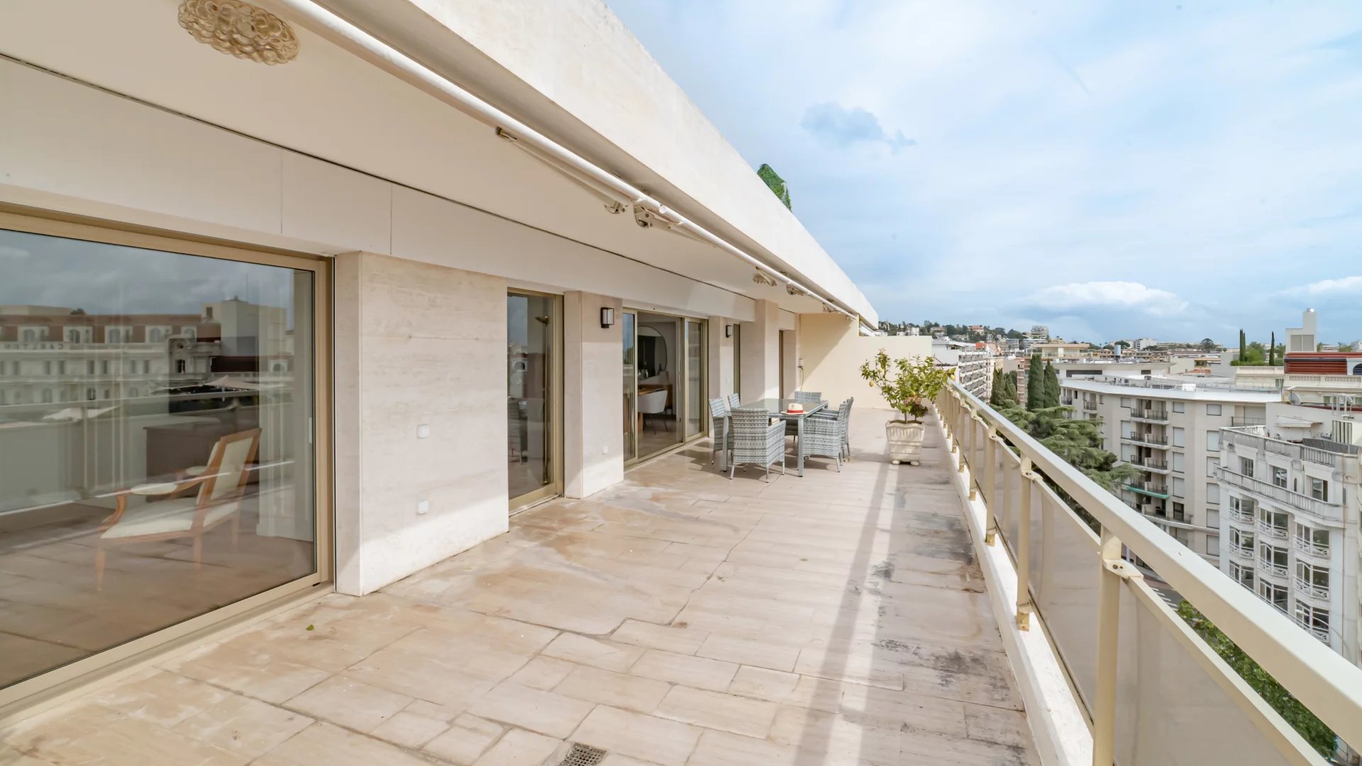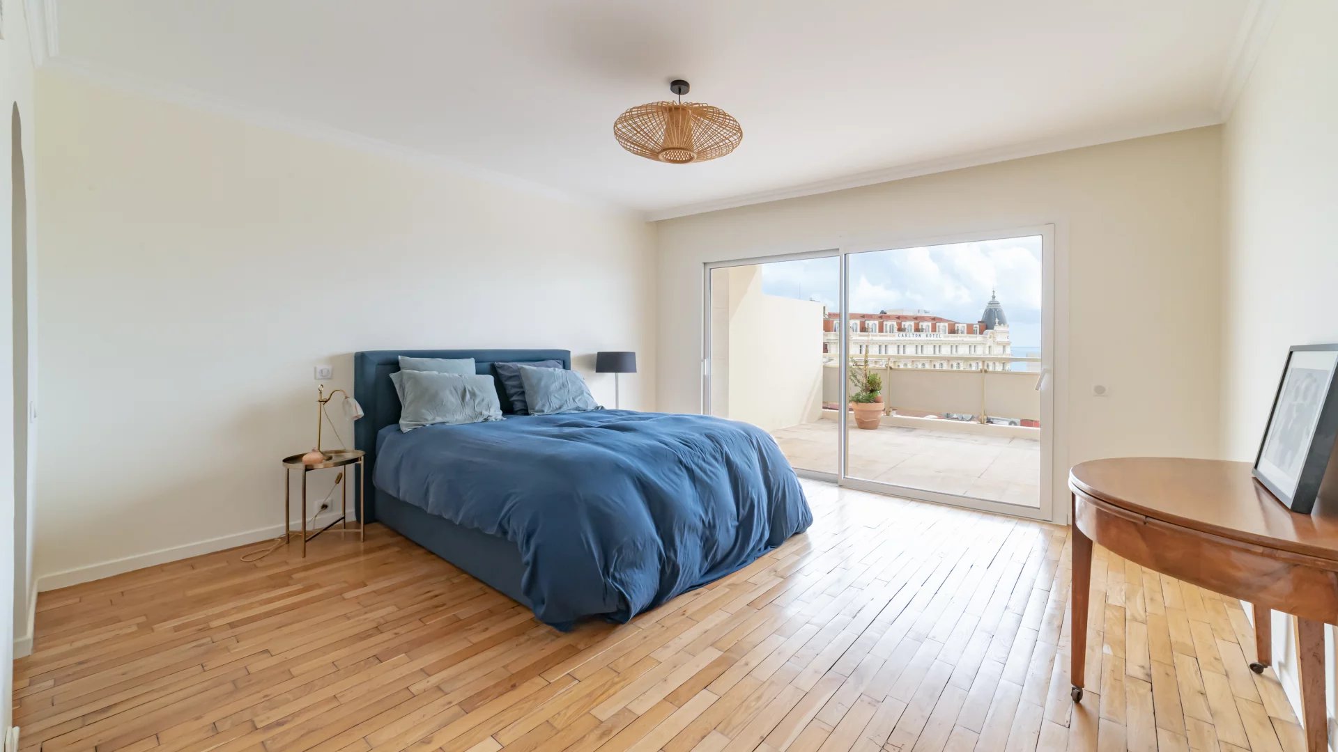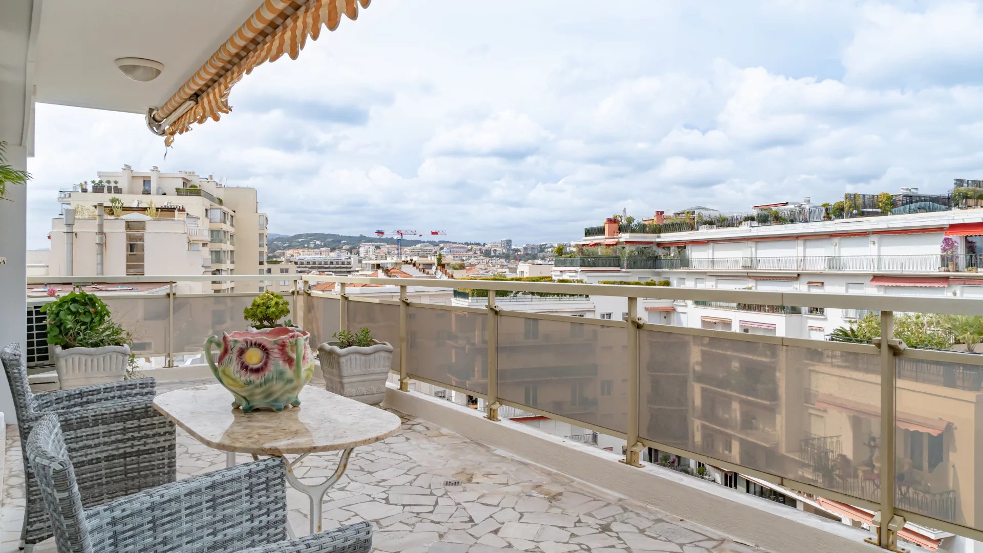 South-facing, fully air-conditioned 140 sq.m apartment on the top floor (8th) of a downtown residence, just a few minutes' walk from the beaches and the Palais des Festivals.