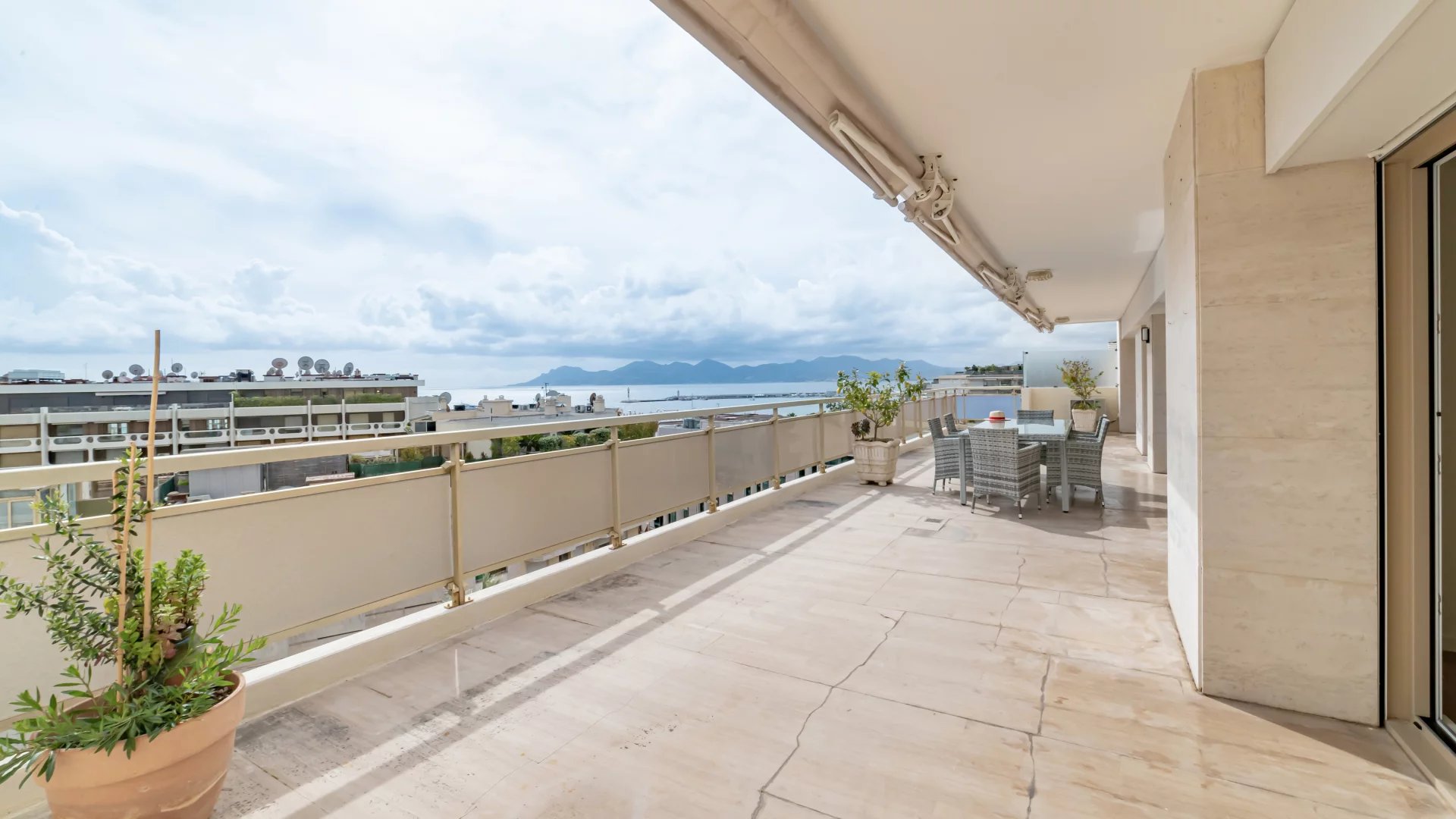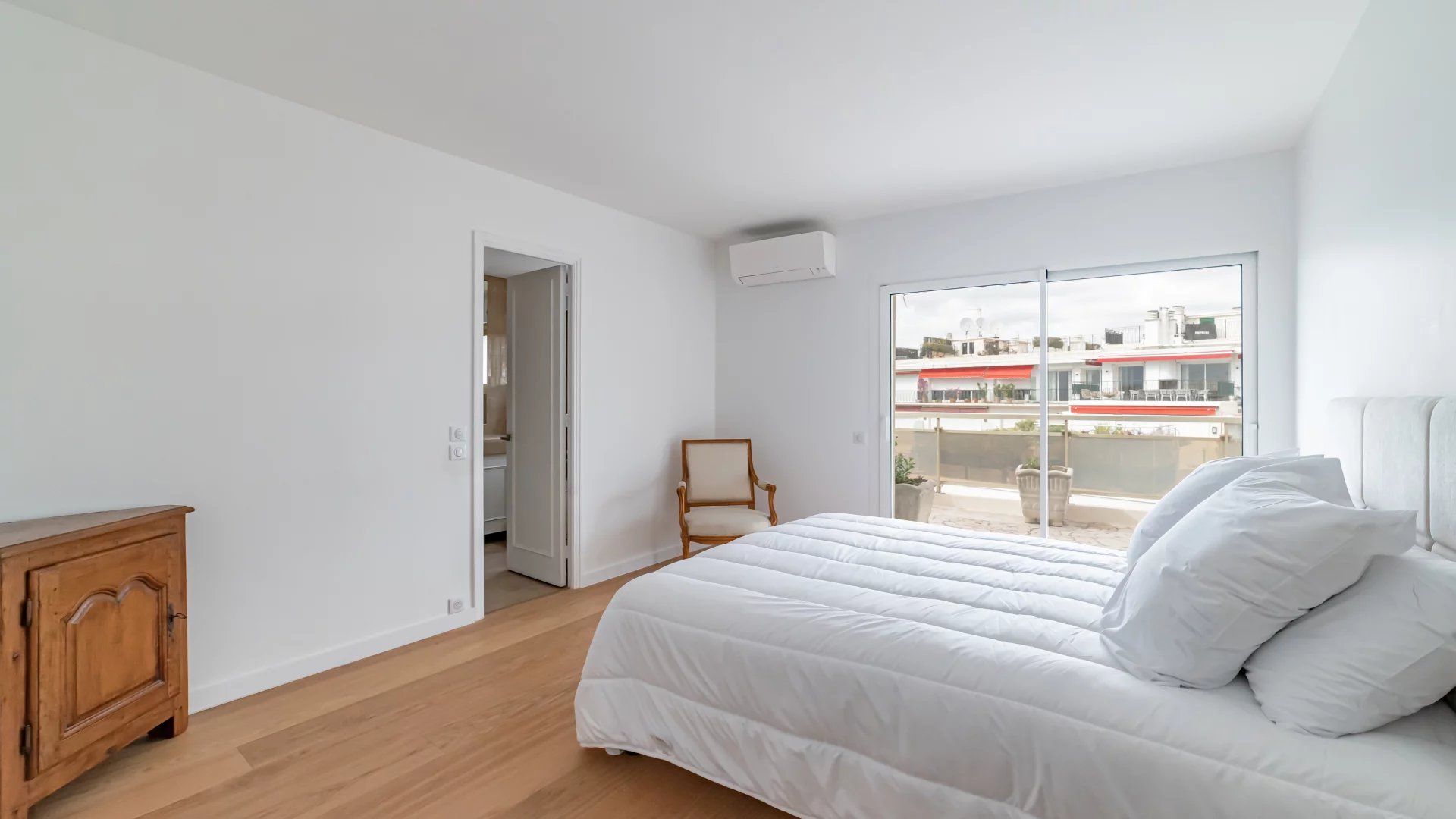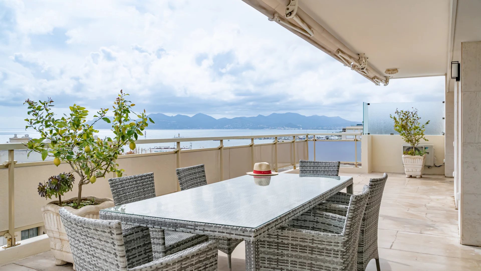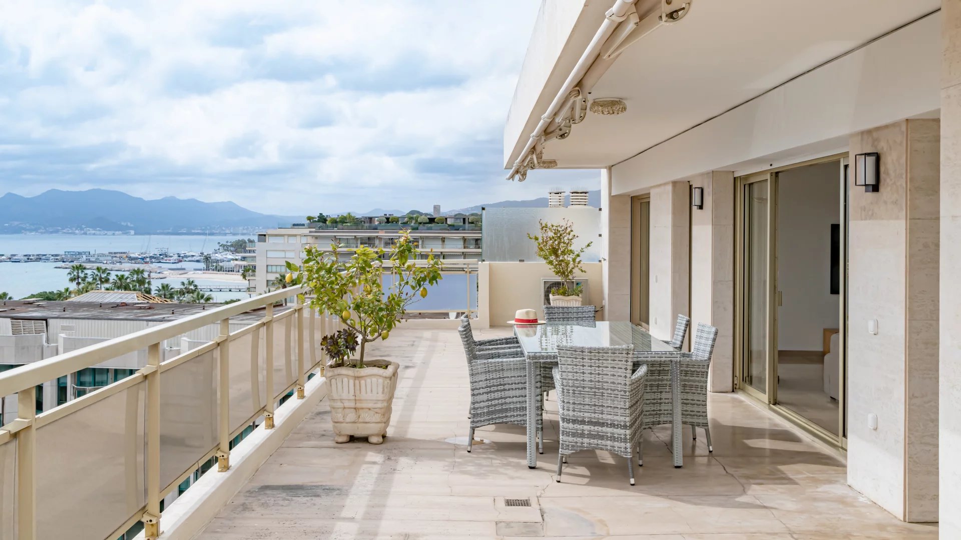 South-facing, fully air-conditioned 140 sq.m apartment on the top floor (8th) of a downtown residence, just a few minutes' walk from the beaches and the Palais des Festivals.