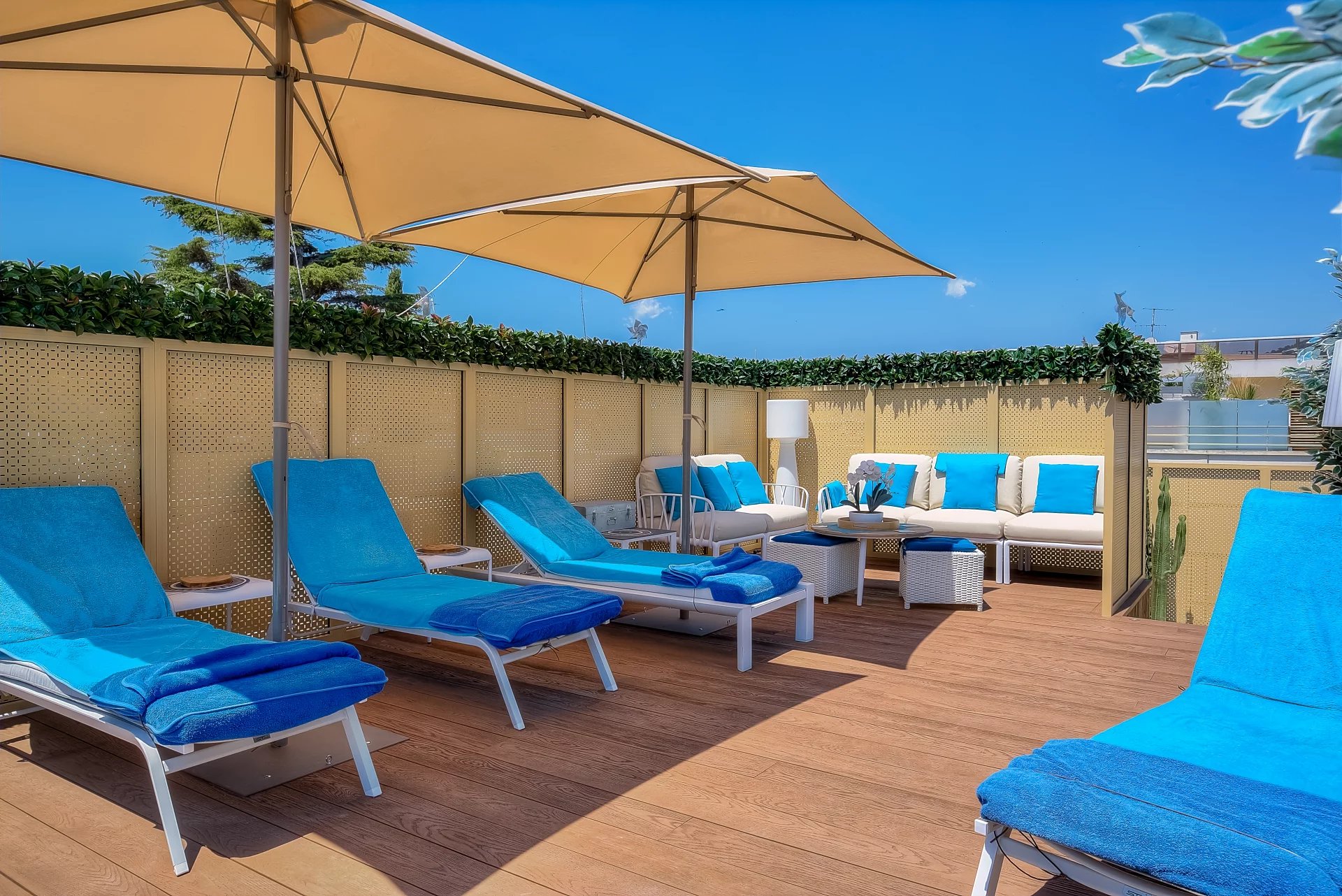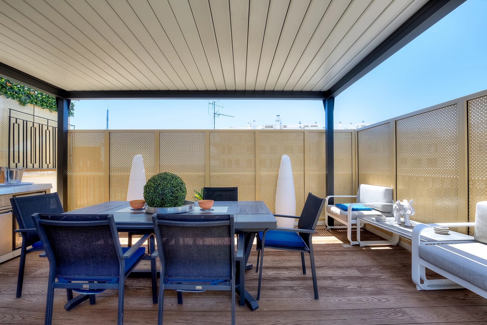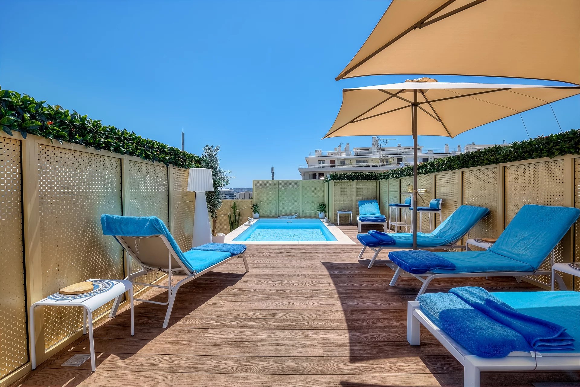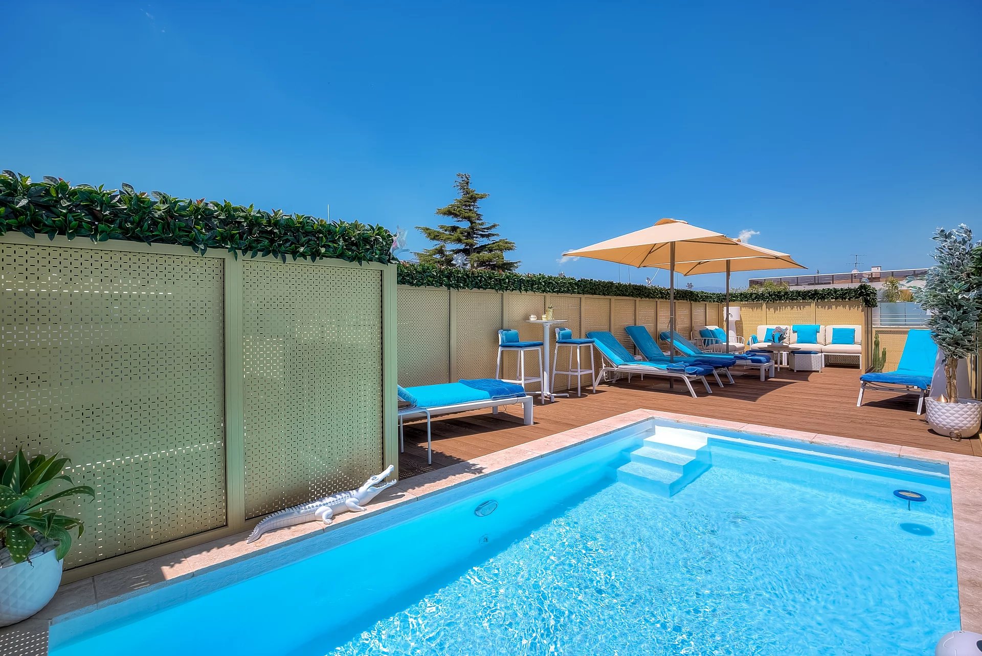 In a high standing residence, 2nd row of the Croisette, attractive contemporary apartment of 100 sq.m enhanced with a roof terrace of 176 sq.m equipped with a private swimming pool (5,5m x 3m), deckchairs, lounge, dining area and summer kitchen with BBQ.