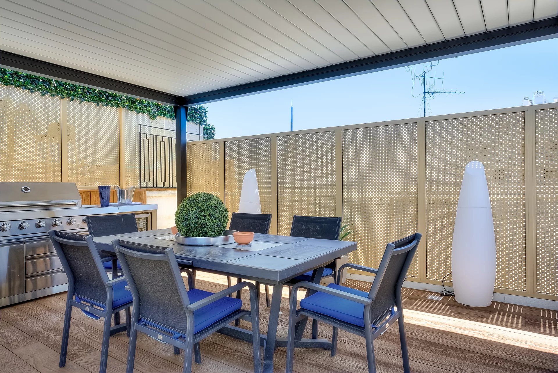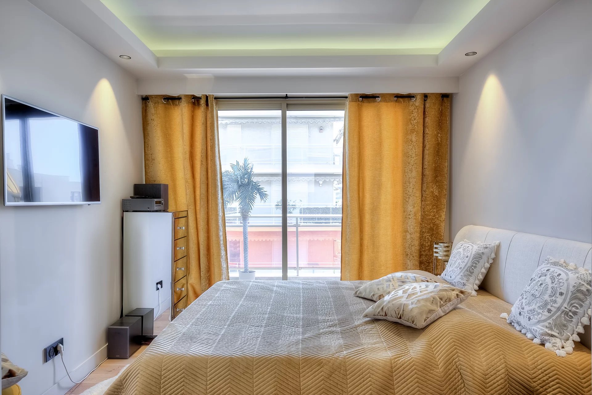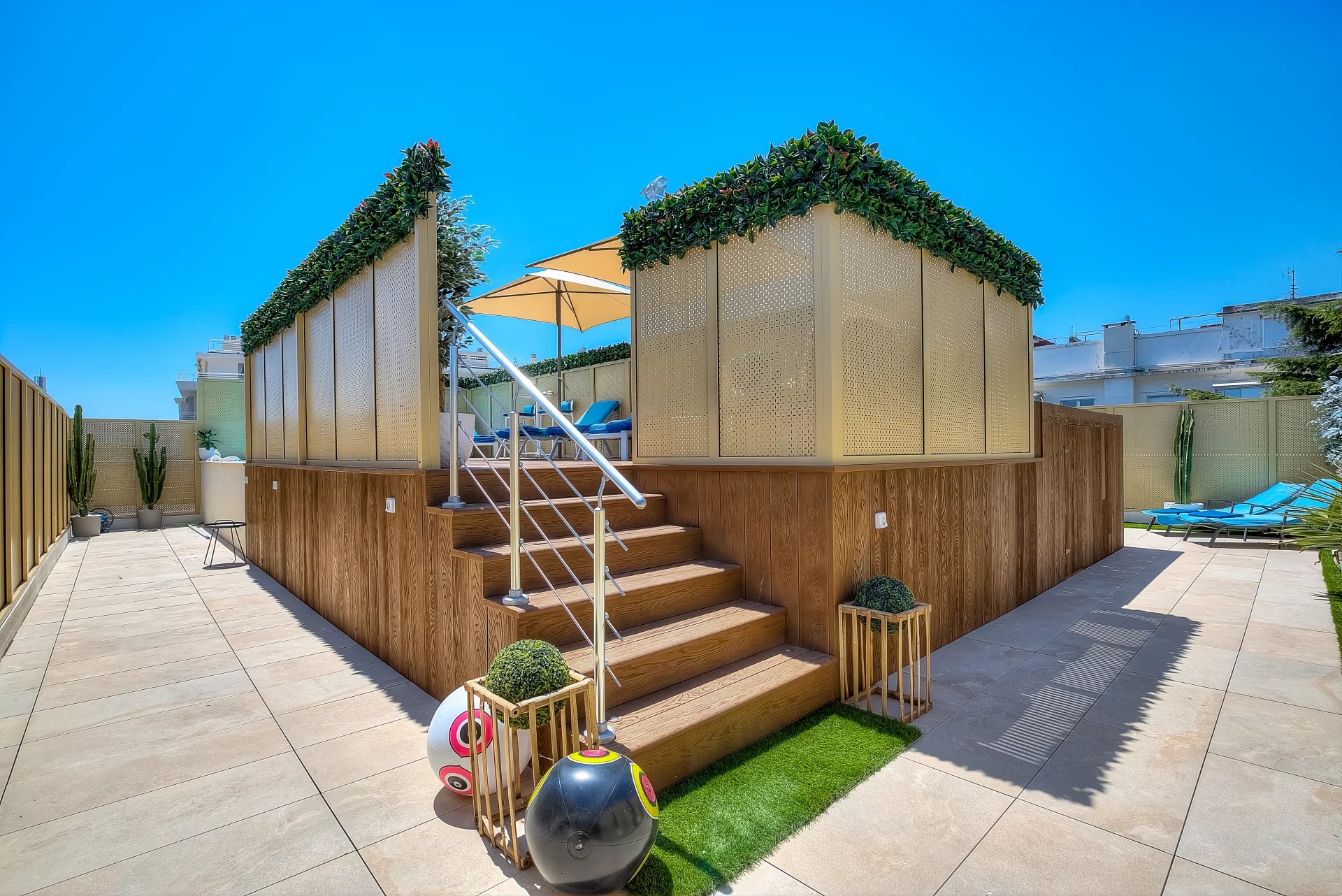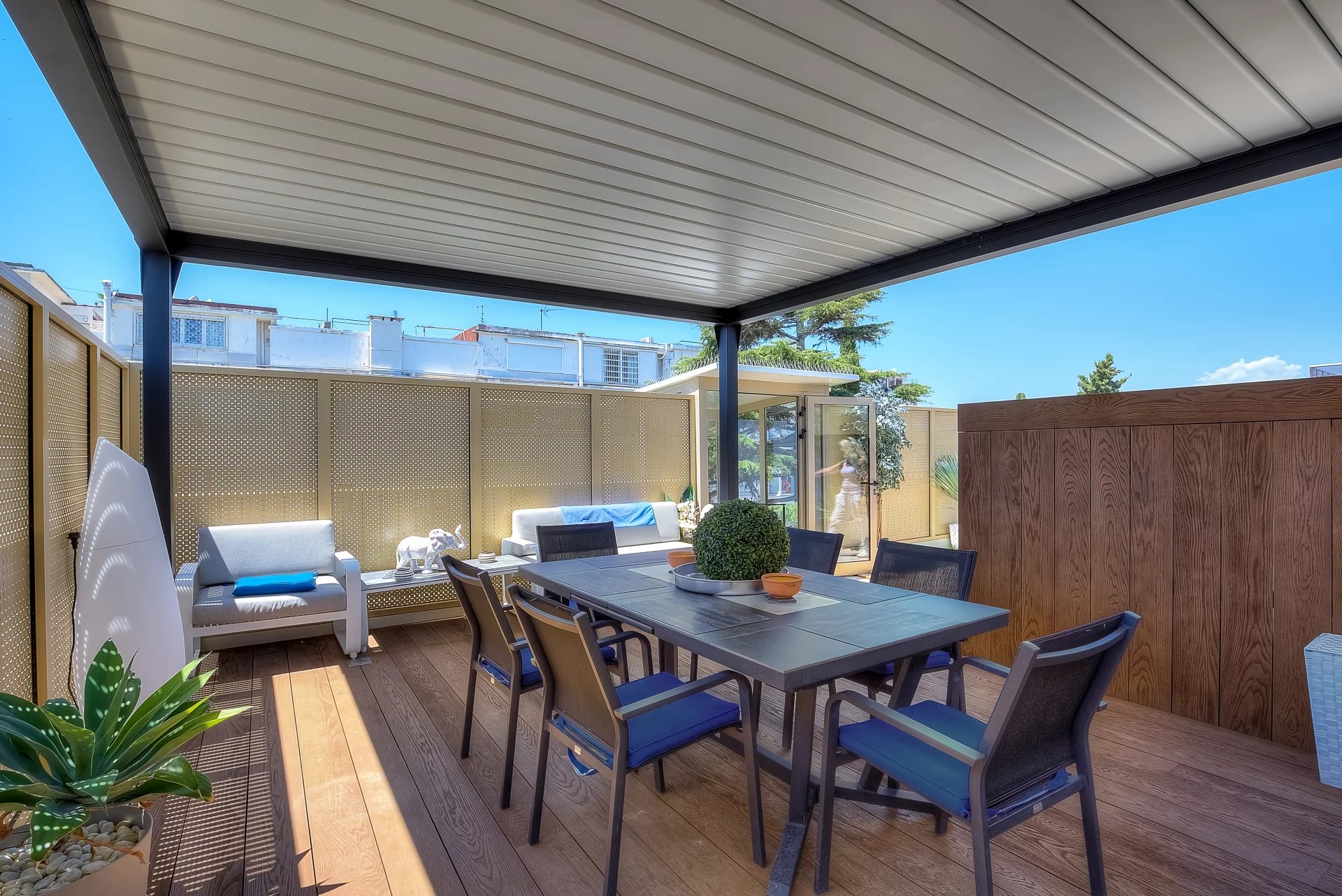 In a high standing residence, 2nd row of the Croisette, attractive contemporary apartment of 100 sq.m enhanced with a roof terrace of 176 sq.m equipped with a private swimming pool (5,5m x 3m), deckchairs, lounge, dining area and summer kitchen with BBQ.
