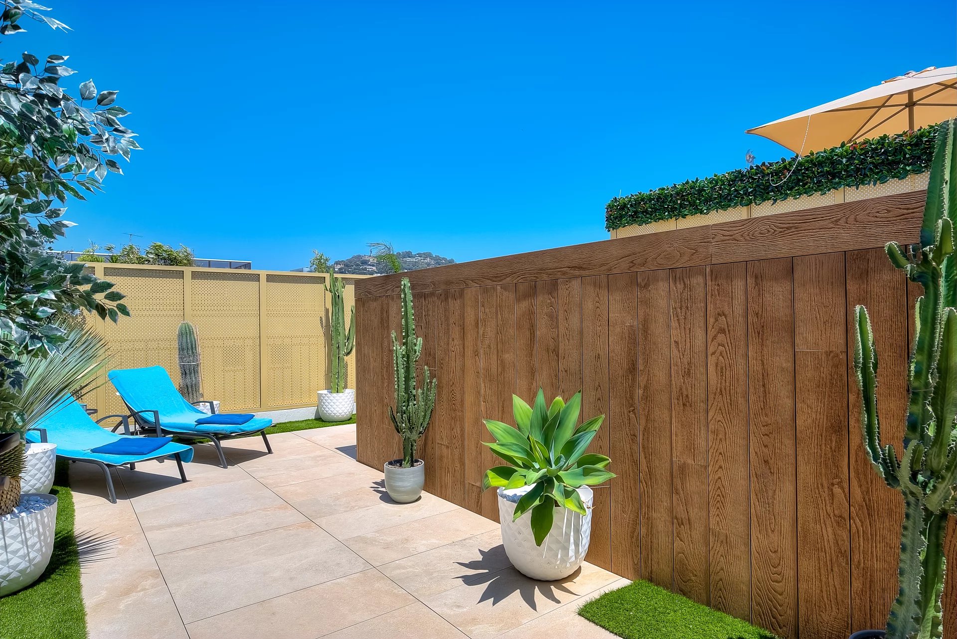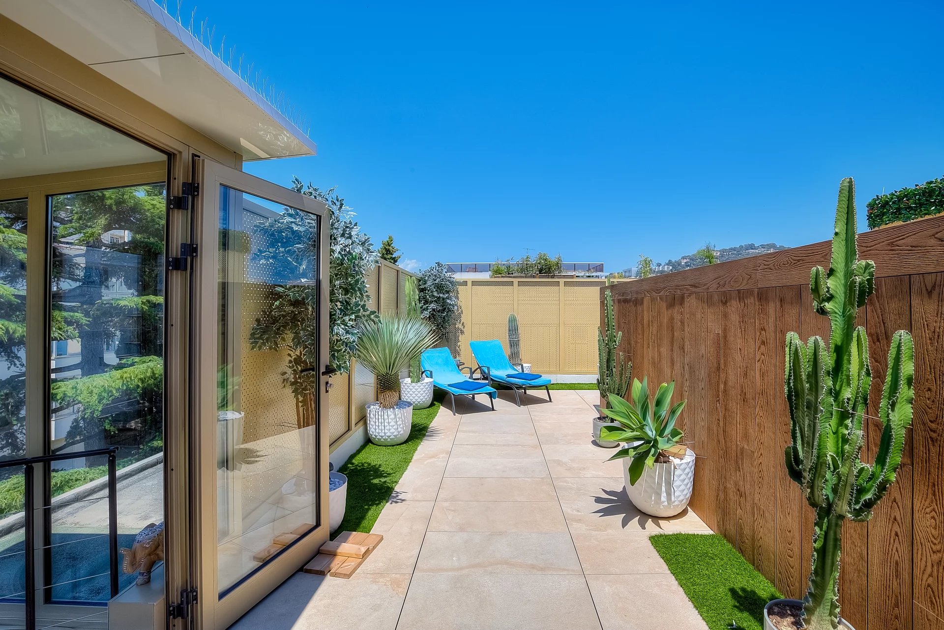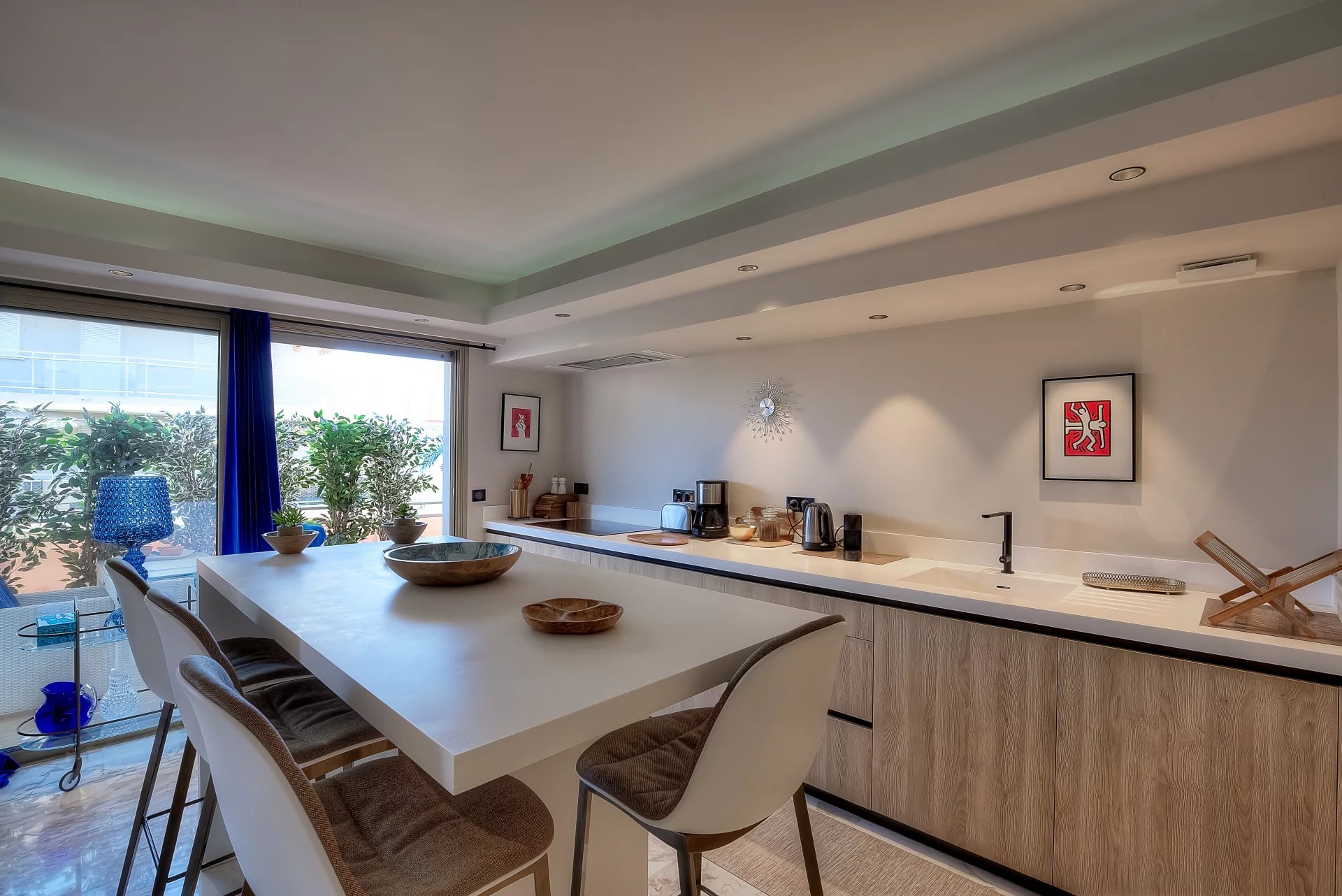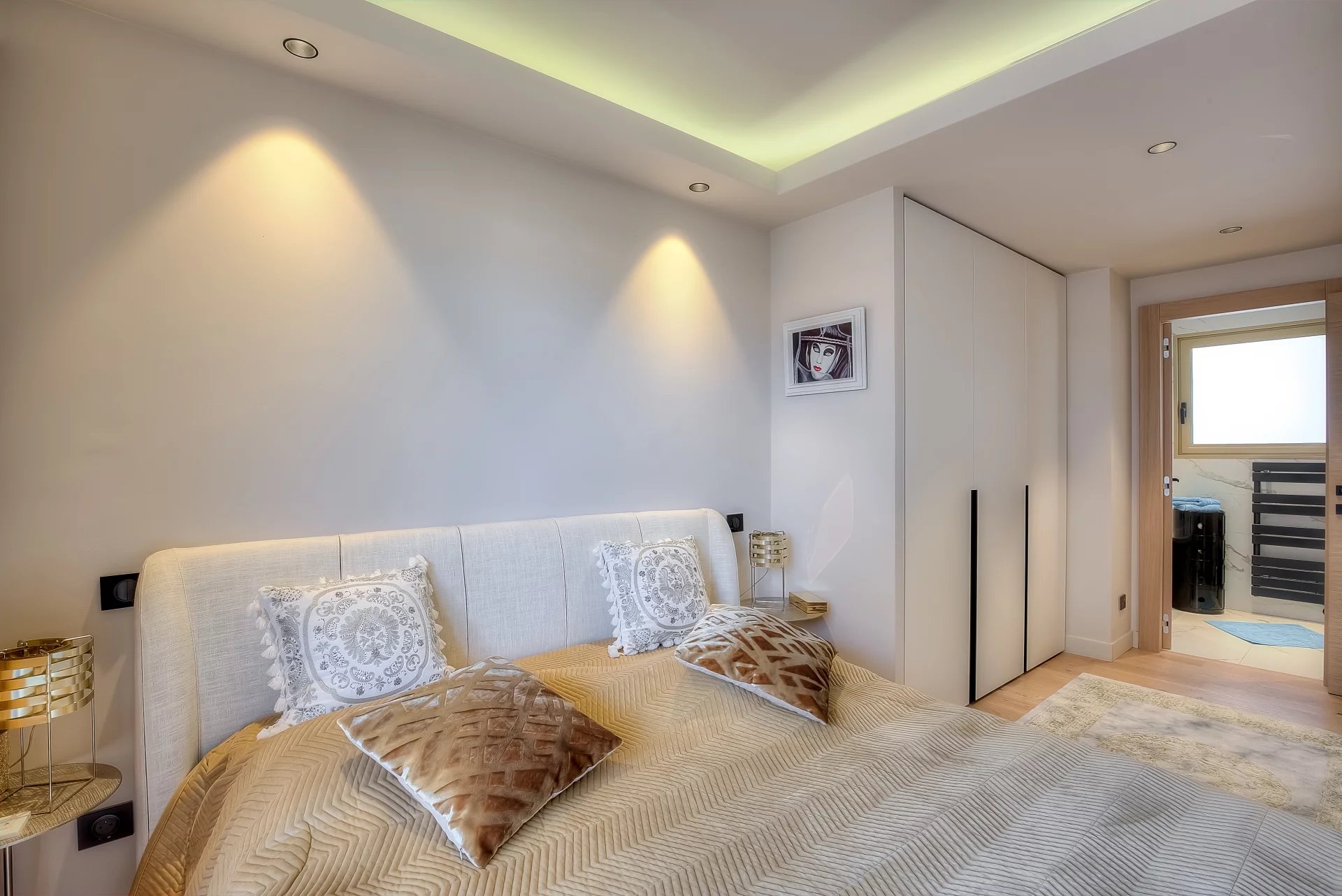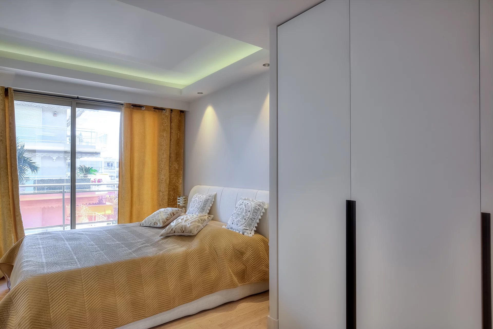 In a high standing residence, 2nd row of the Croisette, attractive contemporary apartment of 100 sq.m enhanced with a roof terrace of 176 sq.m equipped with a private swimming pool (5,5m x 3m), deckchairs, lounge, dining area and summer kitchen with BBQ.