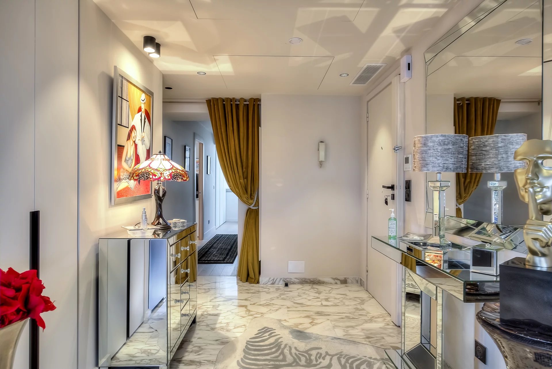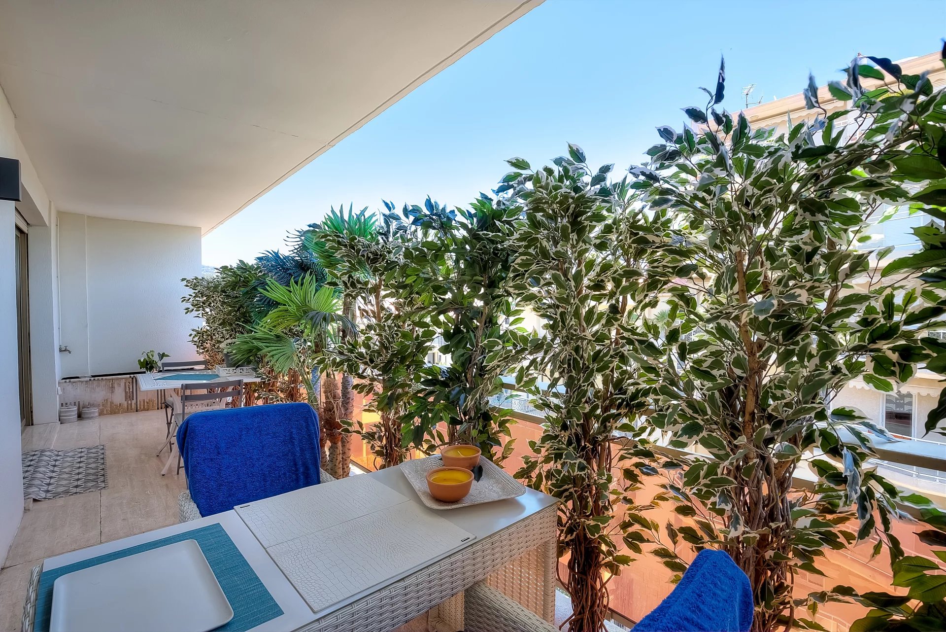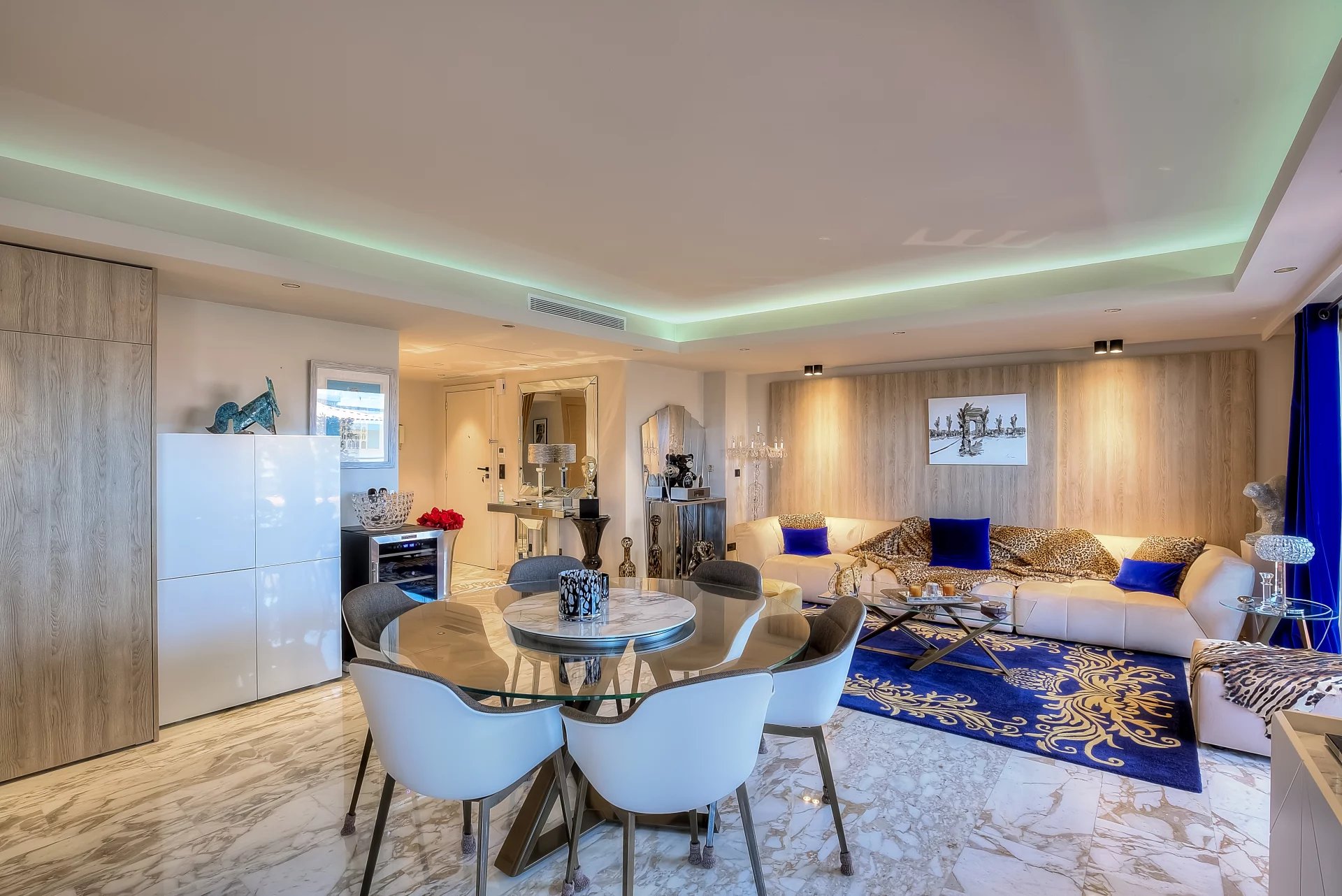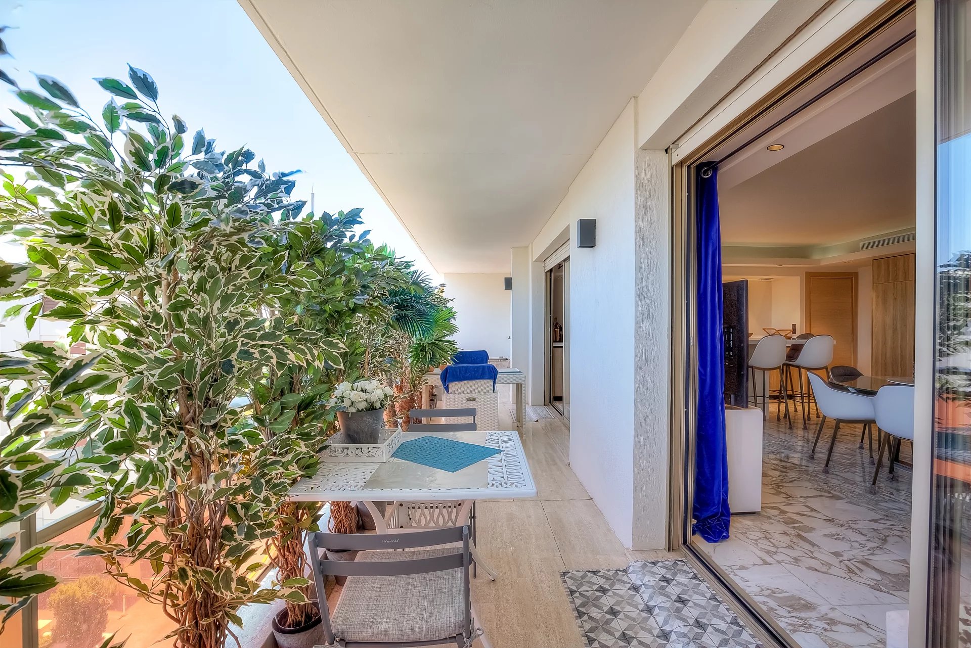 In a high standing residence, 2nd row of the Croisette, attractive contemporary apartment of 100 sq.m enhanced with a roof terrace of 176 sq.m equipped with a private swimming pool (5,5m x 3m), deckchairs, lounge, dining area and summer kitchen with BBQ.