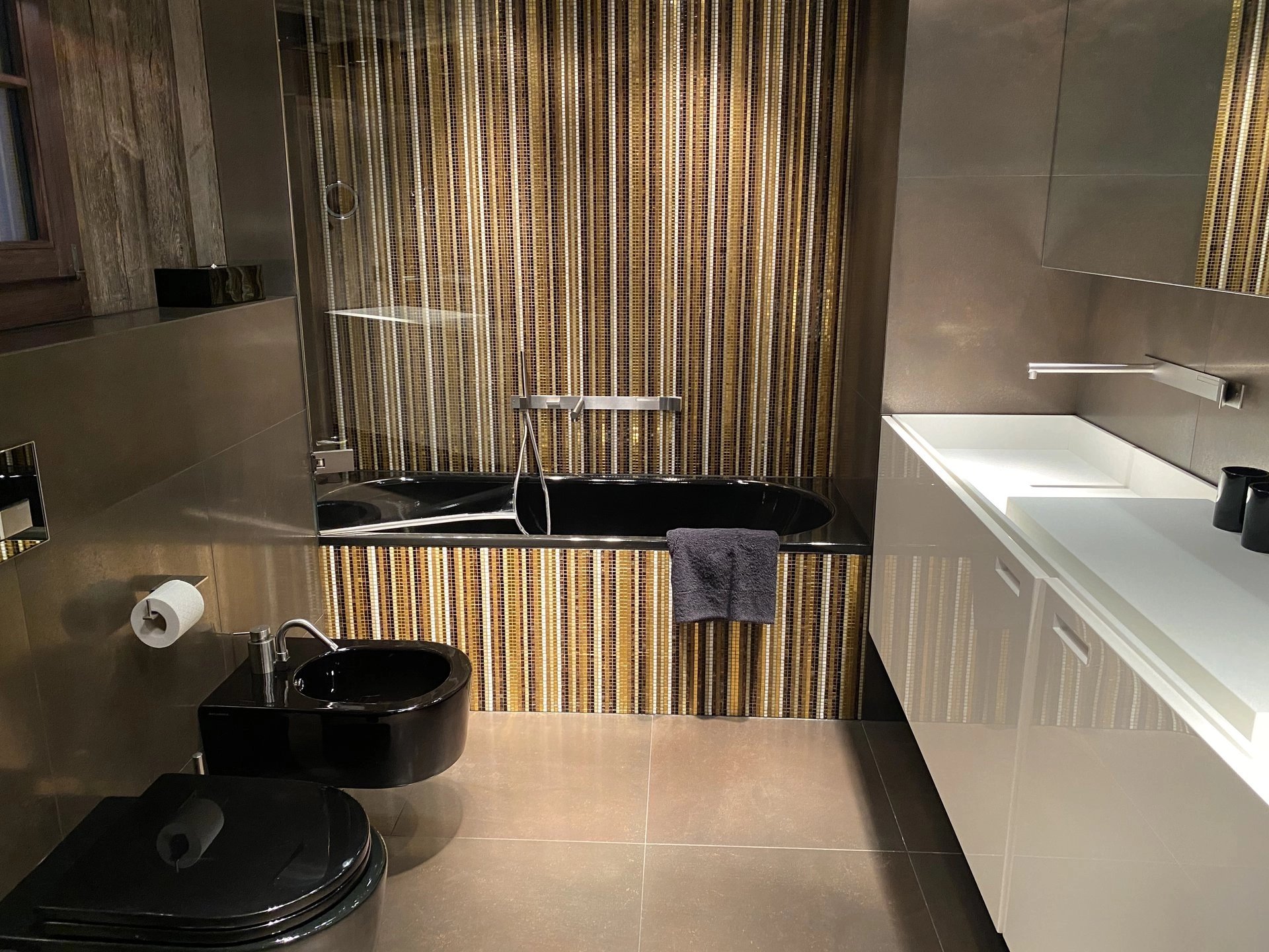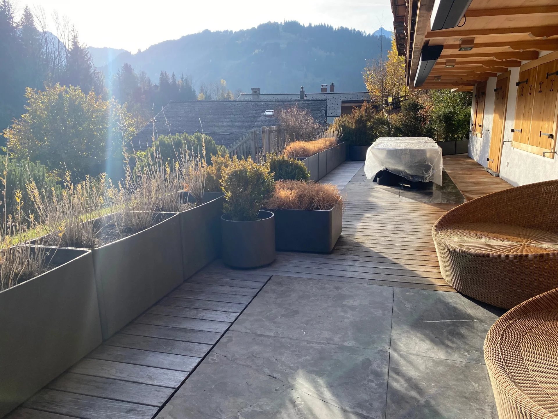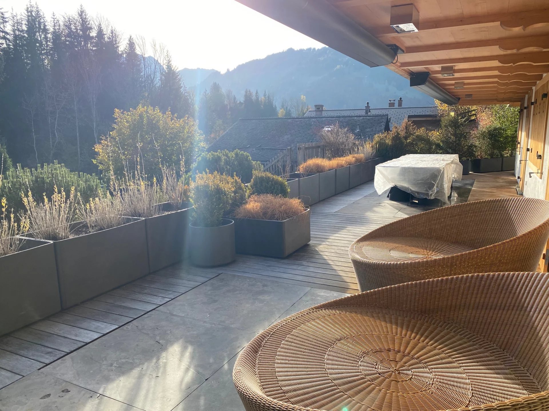 Luxury apartment in Gstaad with the large terrace all around.