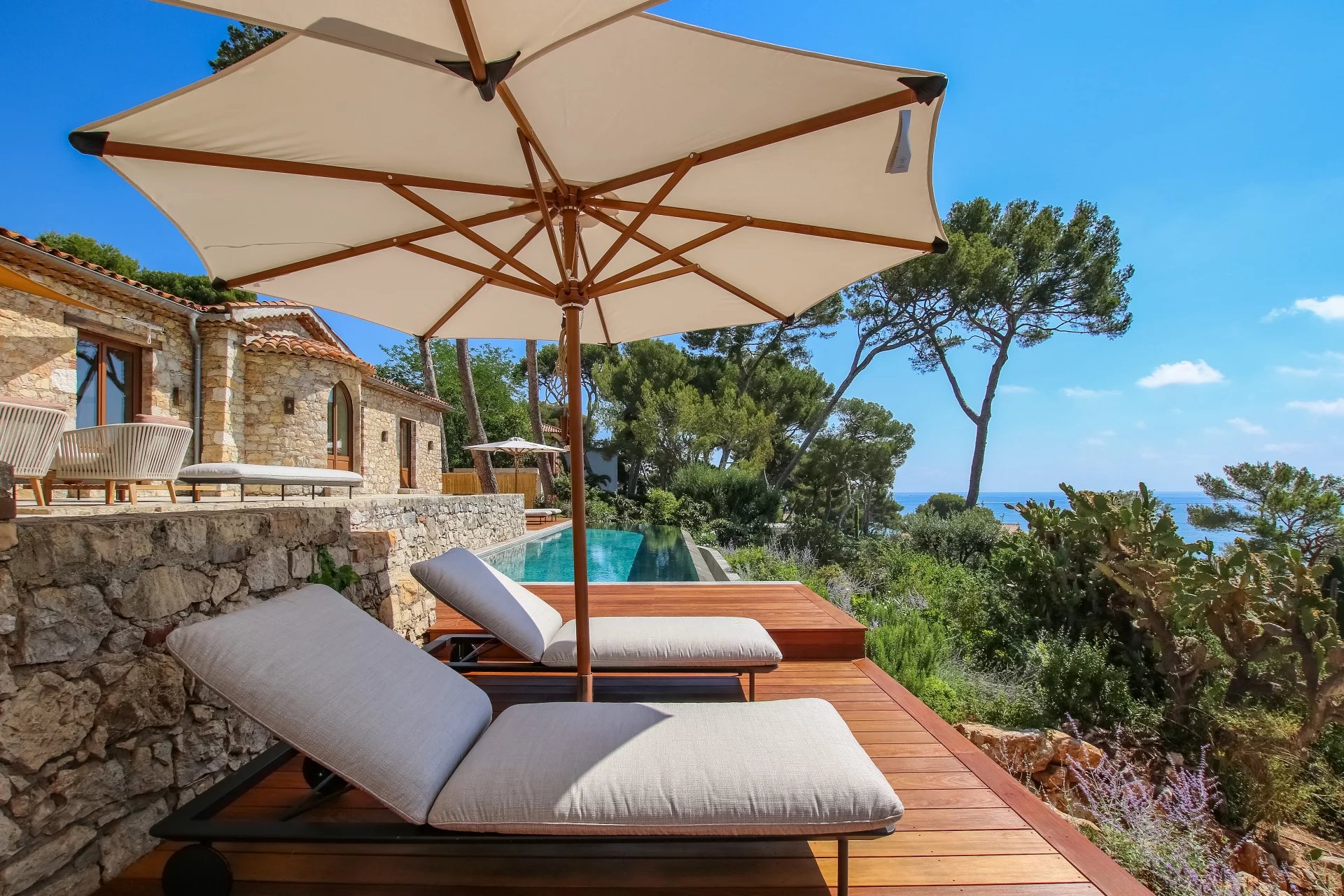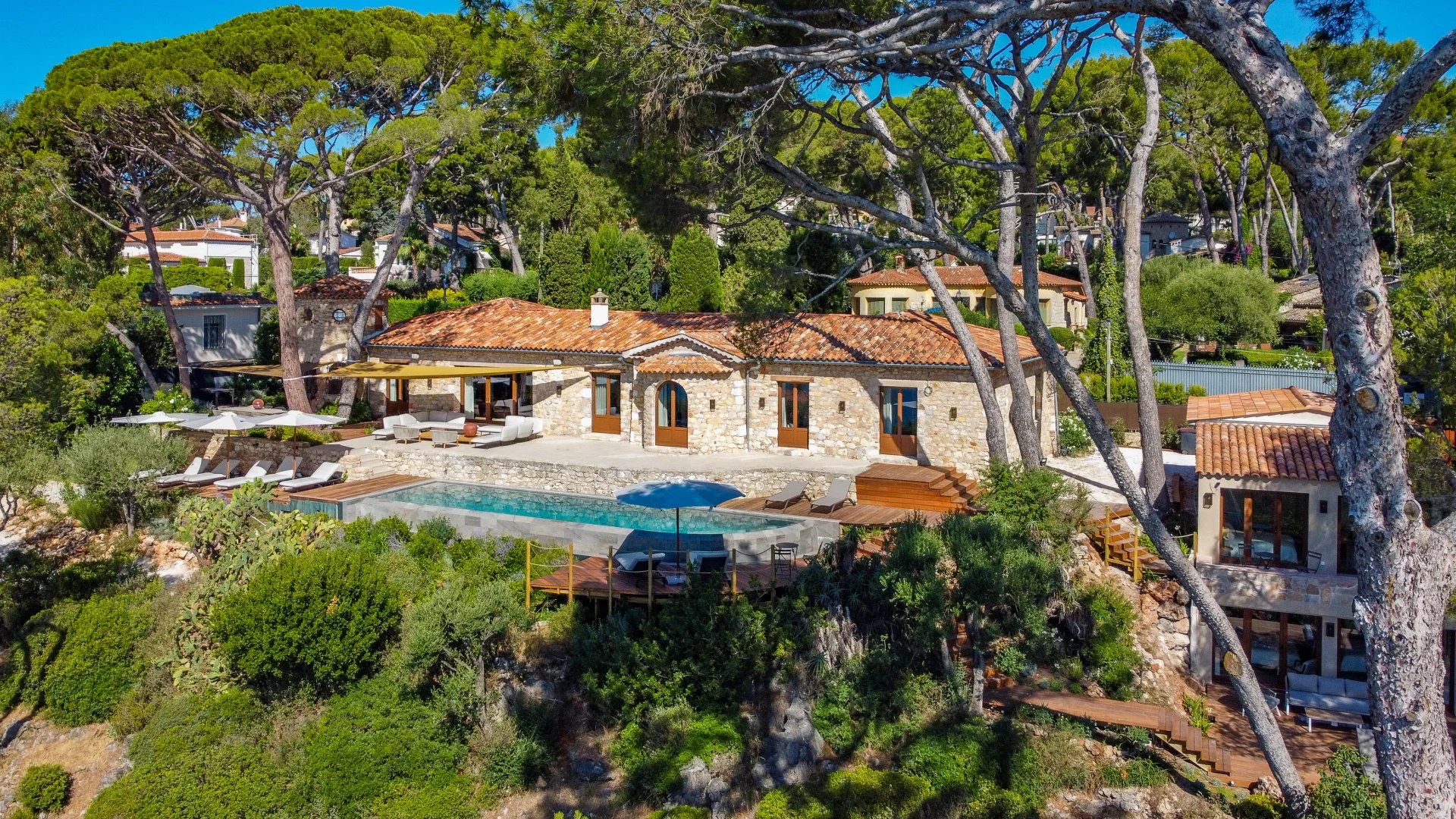 Superb and rare stone bastide-type property of approximately 360 sqm on one level, benefiting from a magnificent landscaped park of 3050 sqm. Large terrace with shaded corners, BBQ, 14 meter infinity pool with panoramic view. Main house of 280 sqm consisting of a large entrance, living space with living room, fitted kitchen, dining room, all opening onto the swimming pool. 4 en-suite bedrooms. The 80 sqm guest house consists of 3 en-suite bedrooms. Garage for 2 cars.