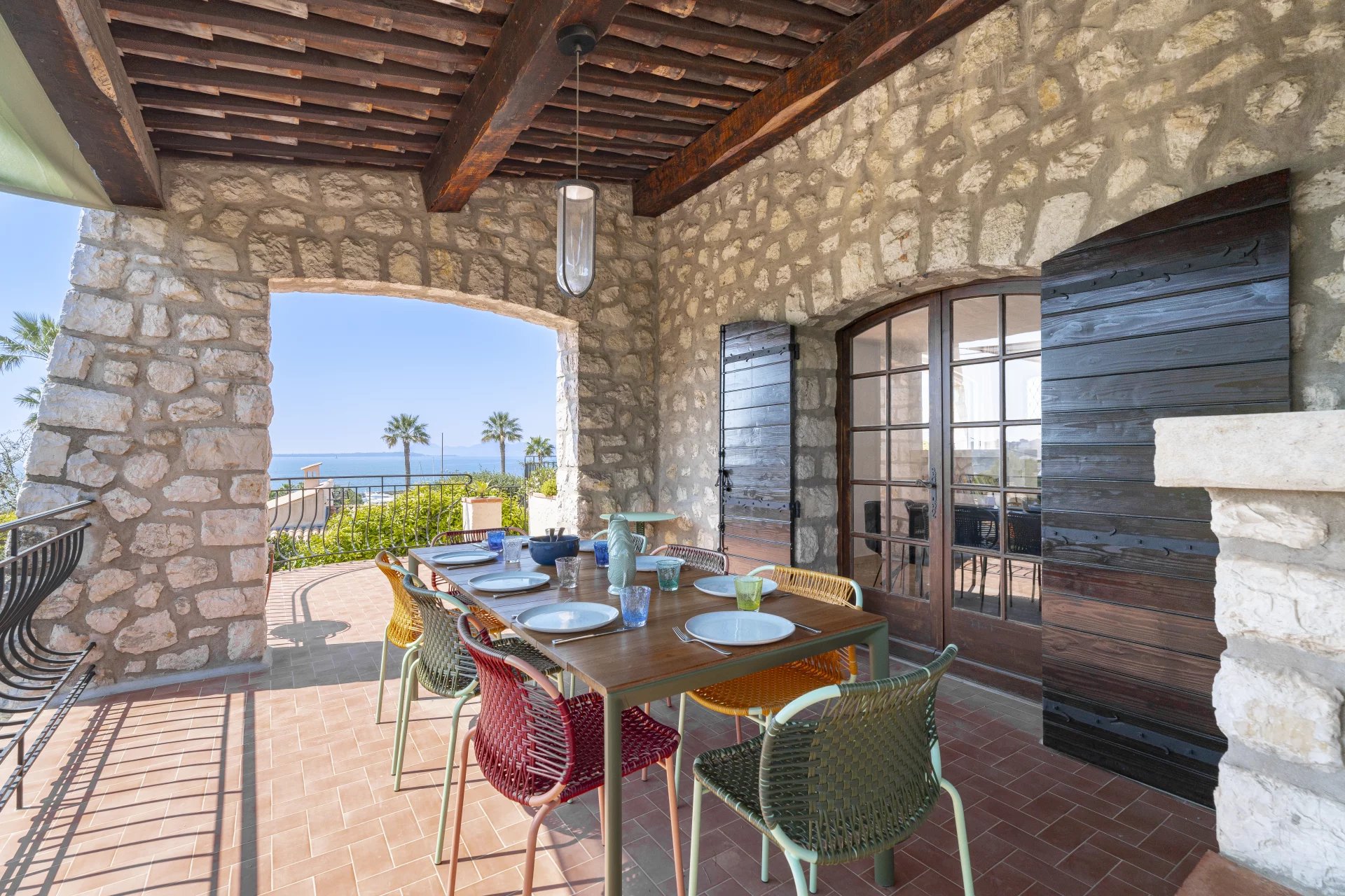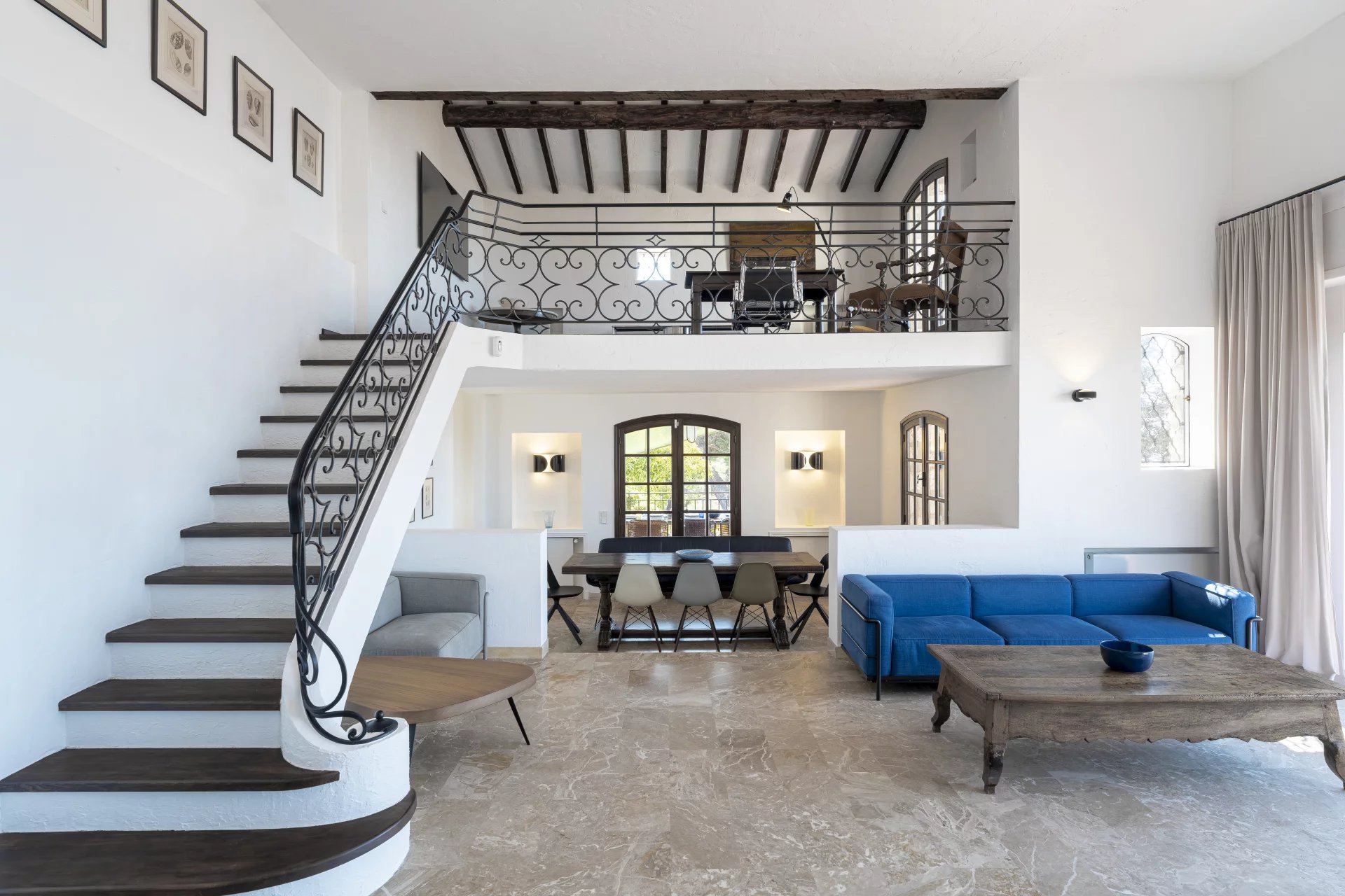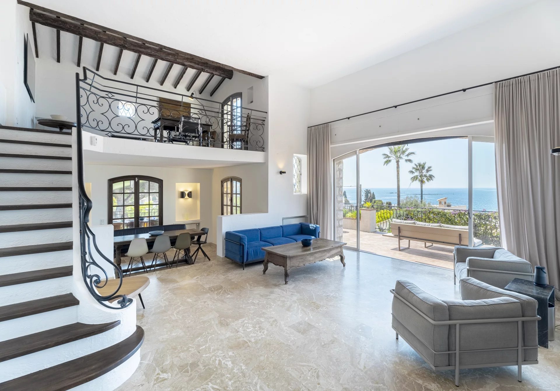 It consists of an entrance, fitted kitchen, large living room with sea view, office on the mezzanine, fireplace area, dining room. All opening on to shaded or sunny terraces.