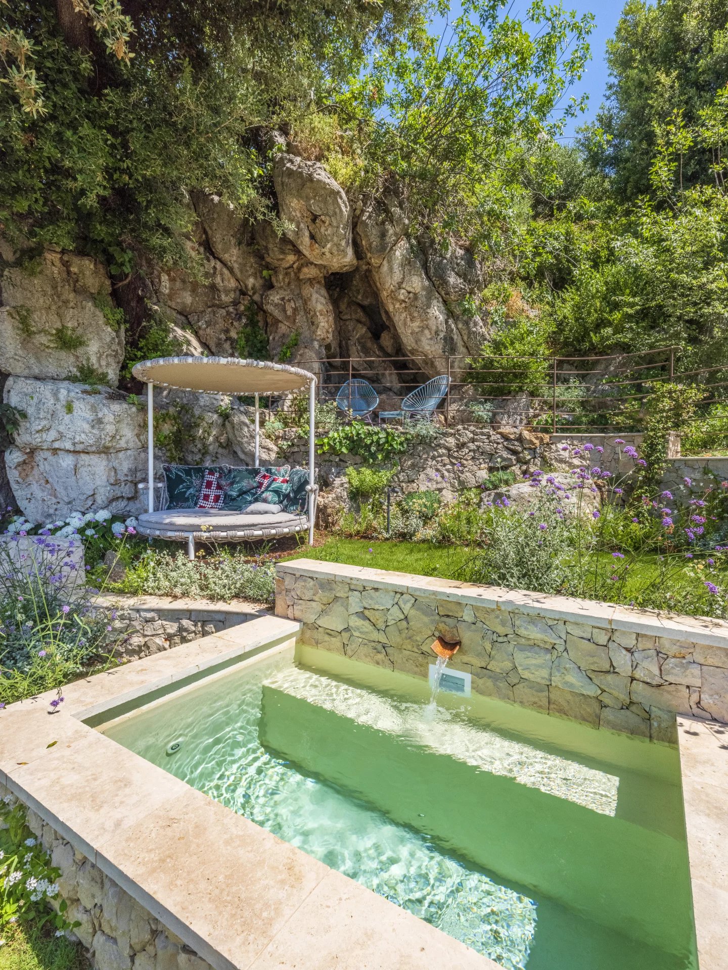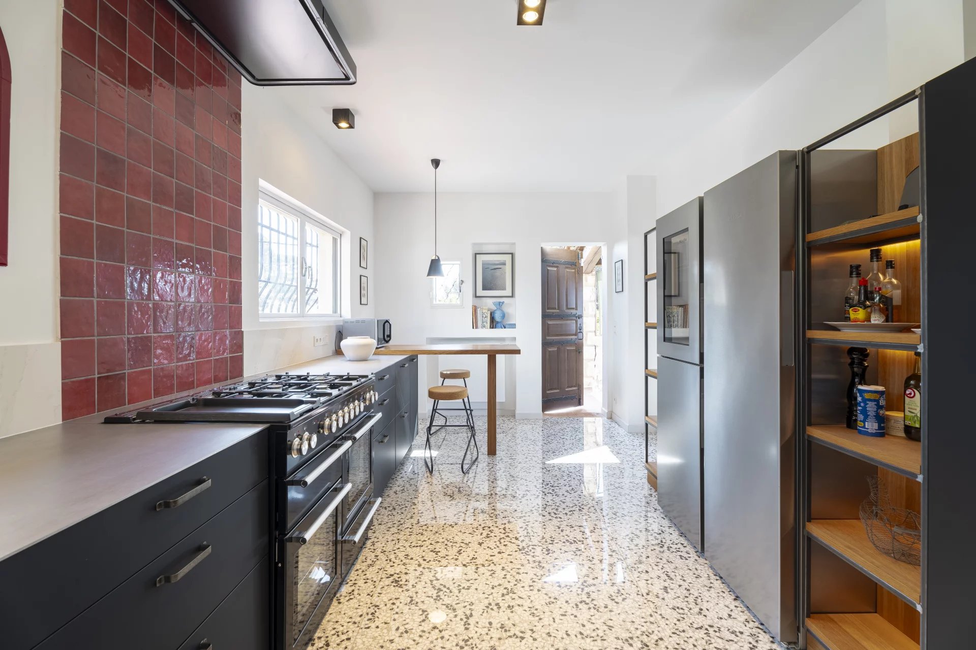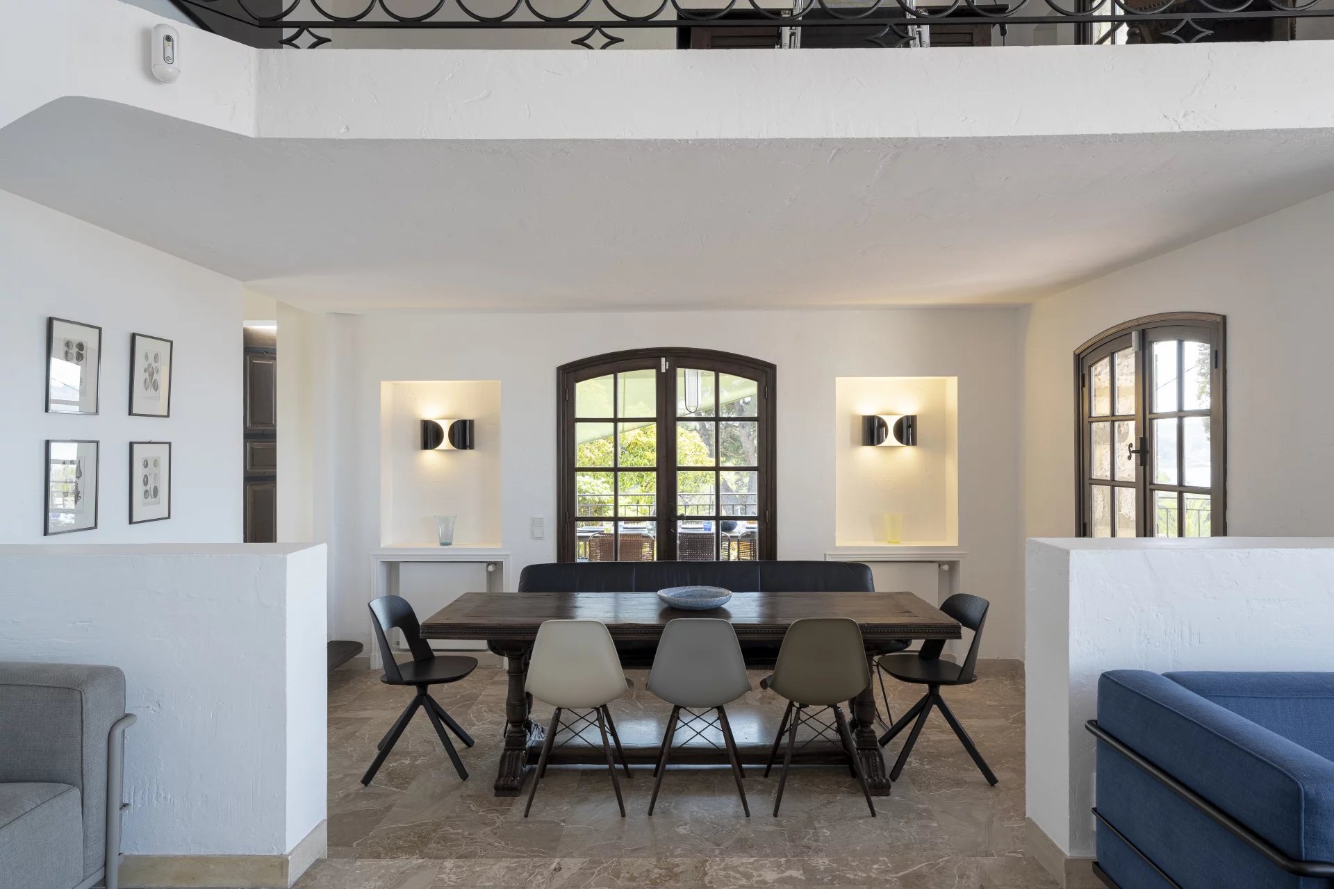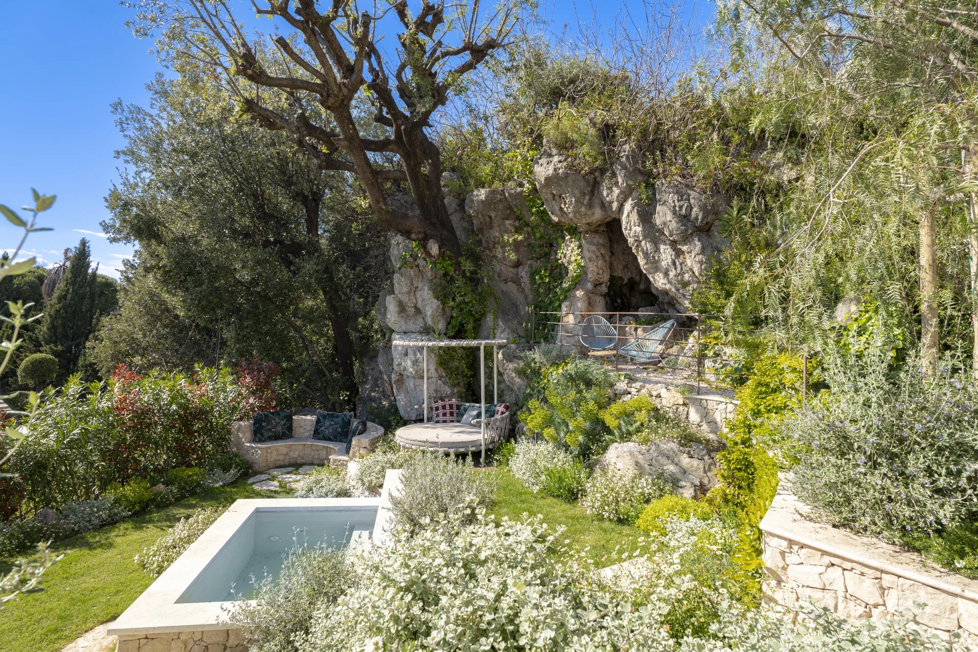 It consists of an entrance, fitted kitchen, large living room with sea view, office on the mezzanine, fireplace area, dining room. All opening on to shaded or sunny terraces.