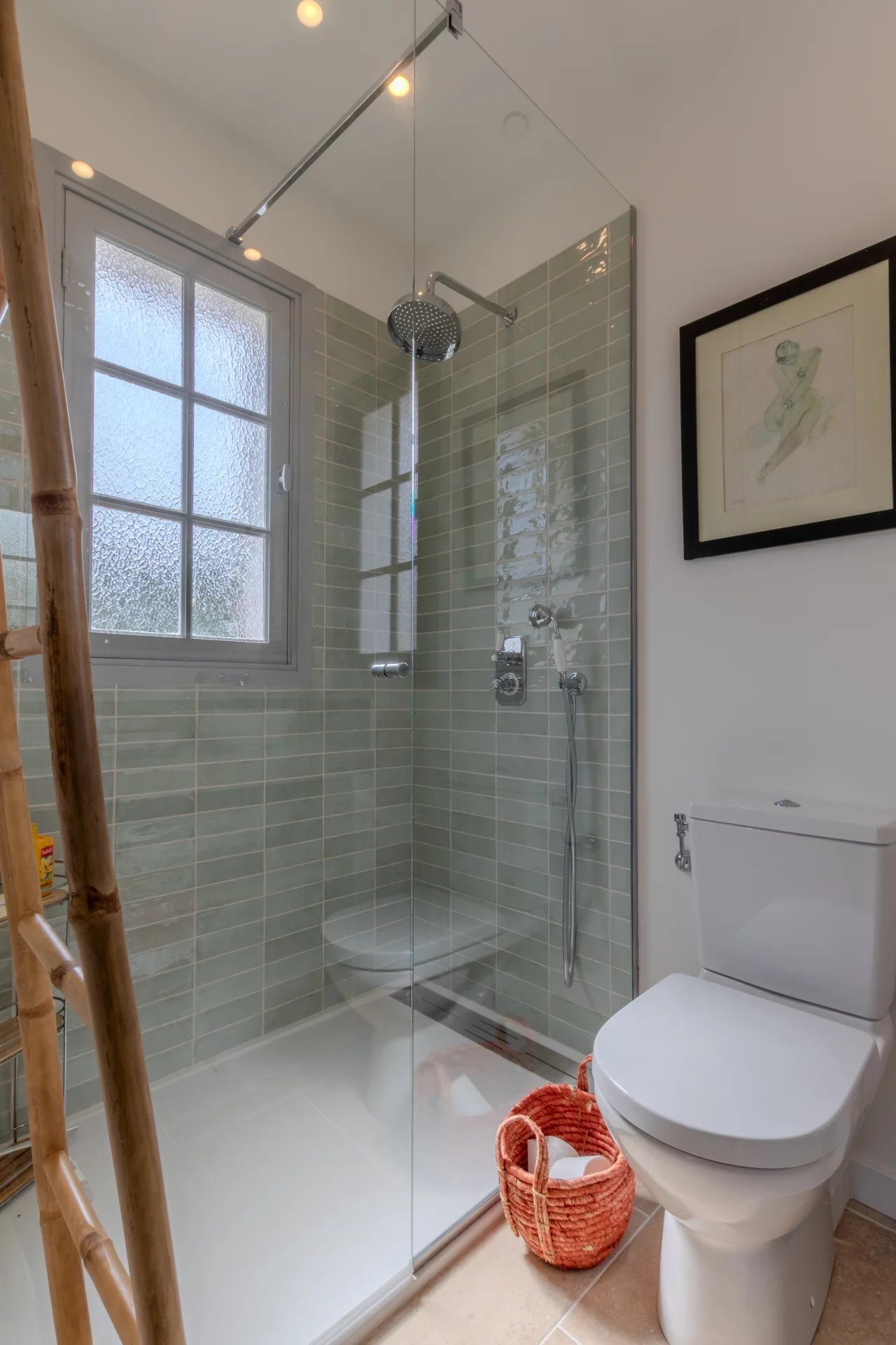 Upstairs, a bedroom with shower room and terrace, two bedrooms and a large shower room.