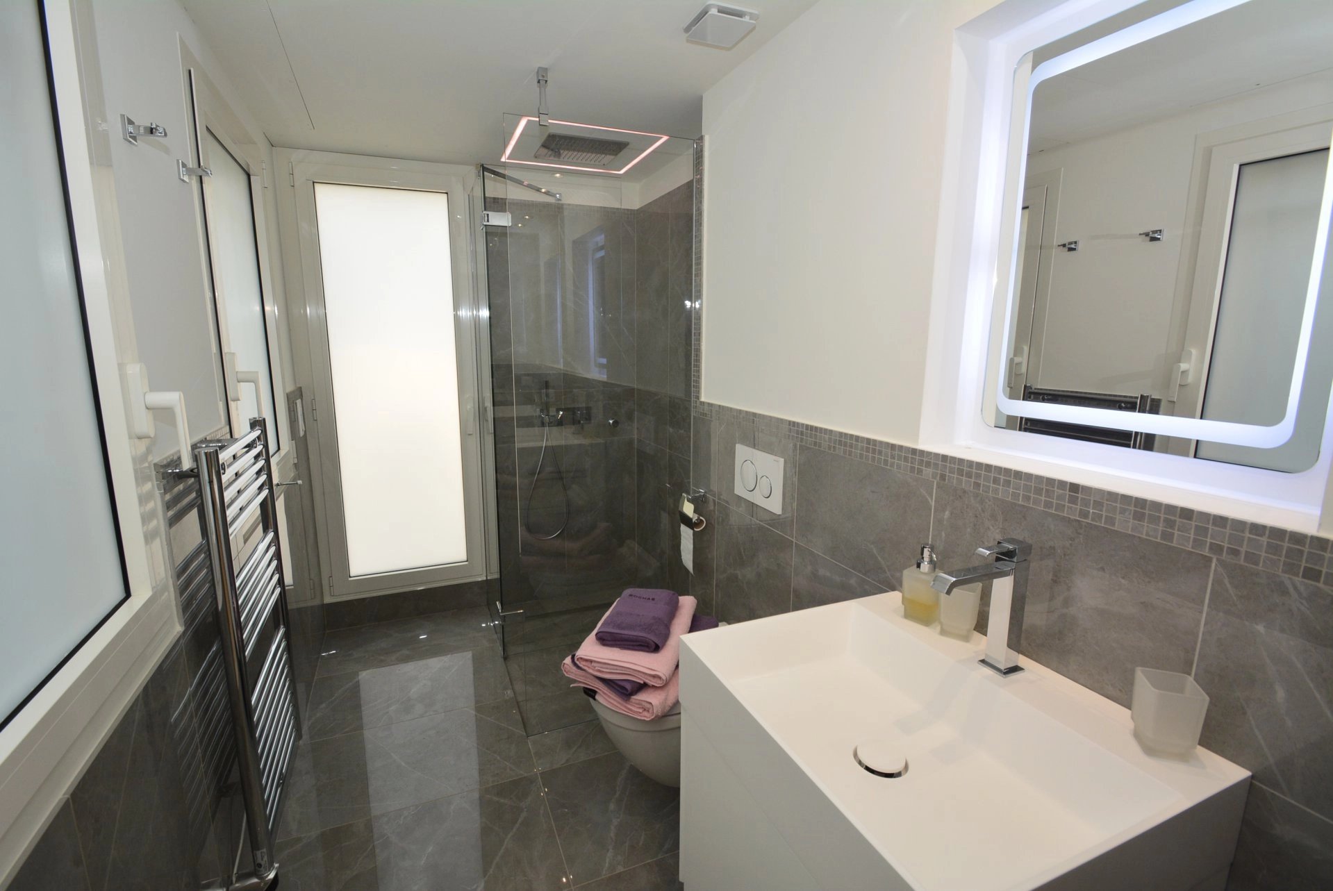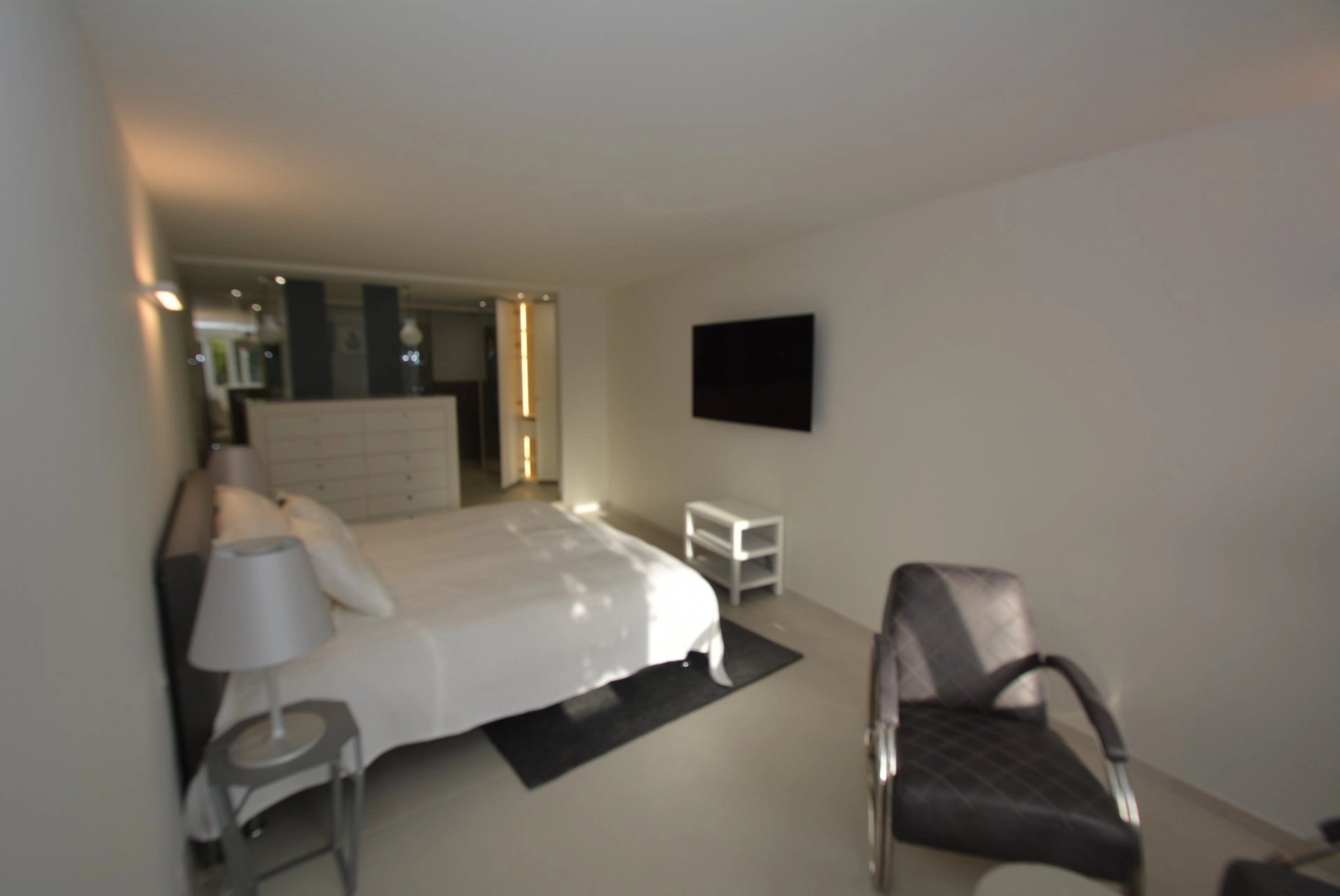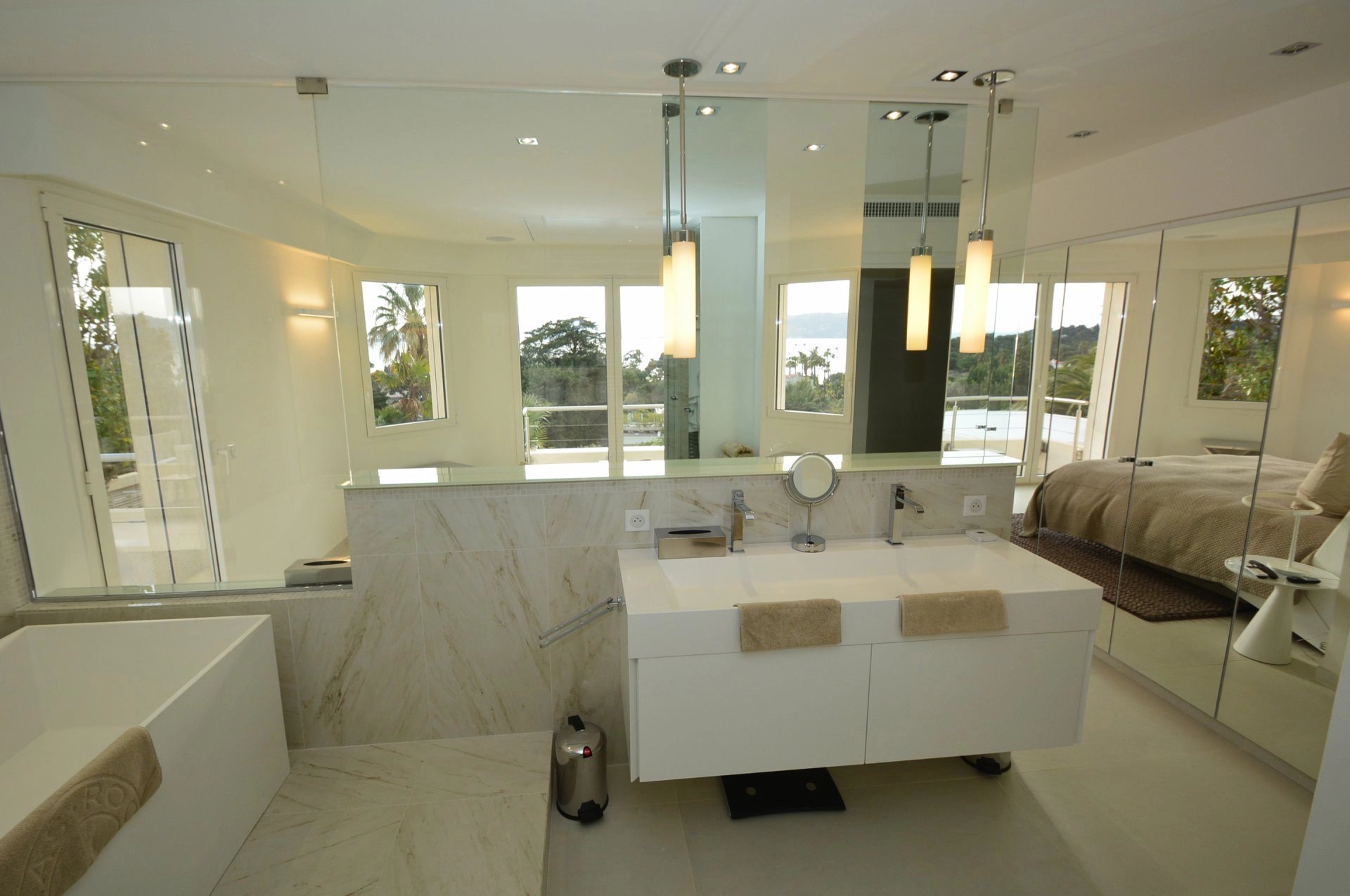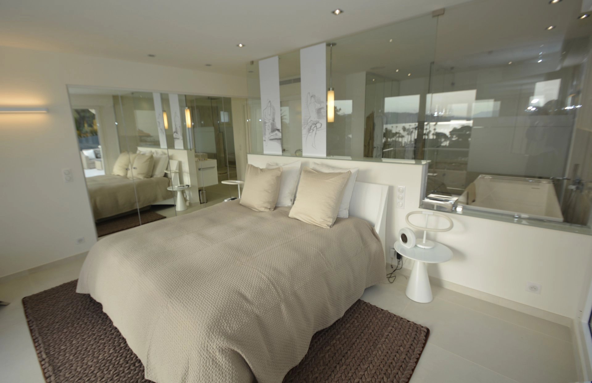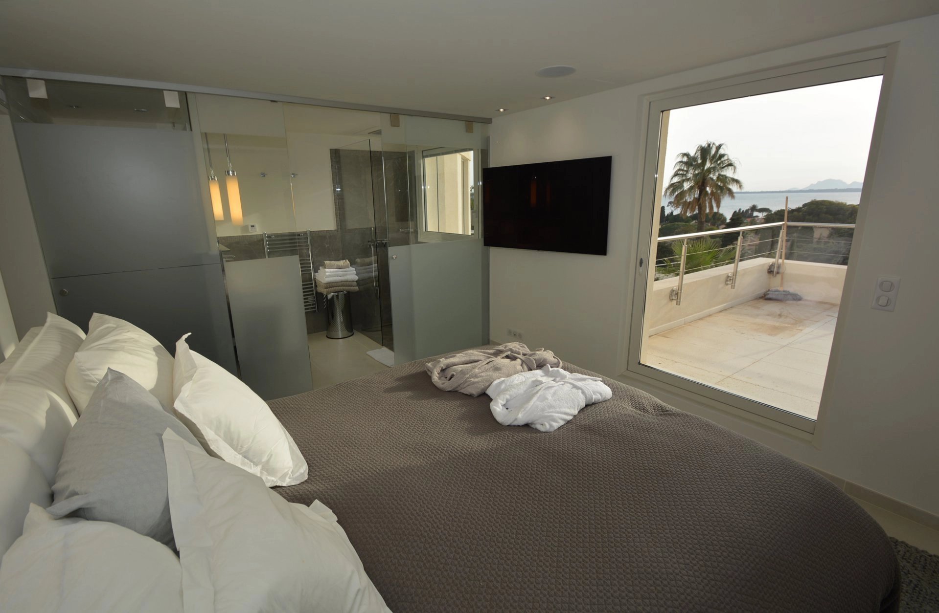 Master bedroom (double bed - safe), TV, opening onto terrace with summer lounge, bar area, jacuzzi and access to the solarium, sea view - Full bathroom / WC