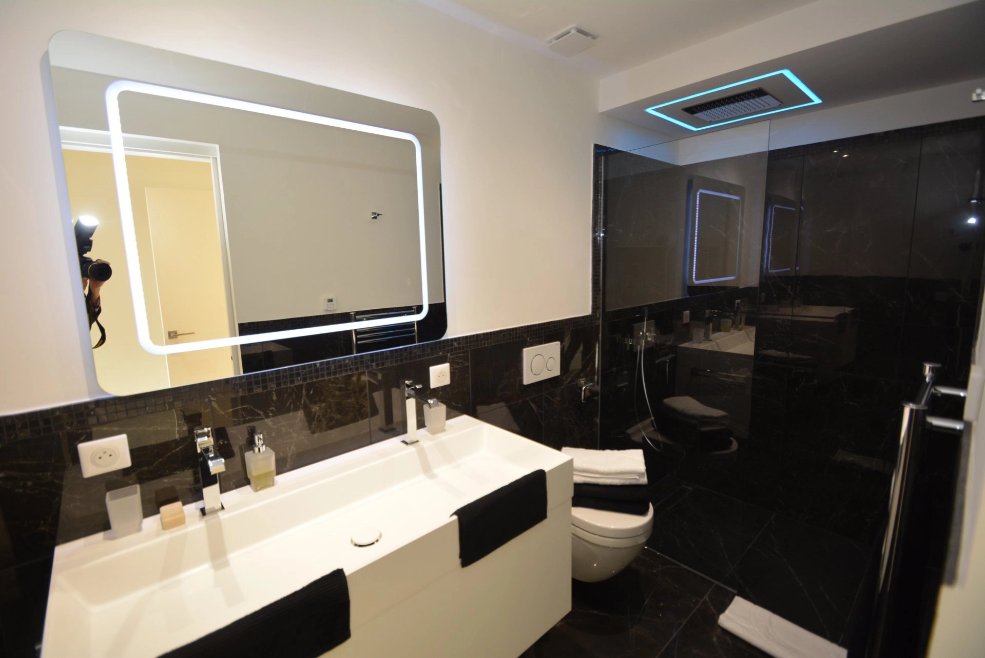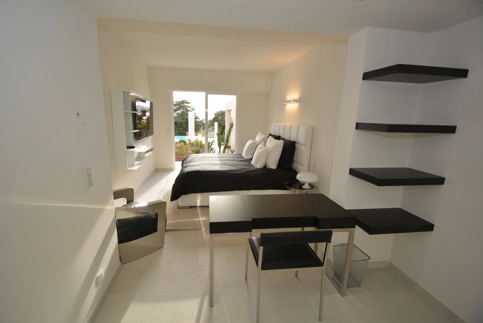 Bedroom (double bed - safe), TV, opening onto the terrace, sea-view - Shower room / WC