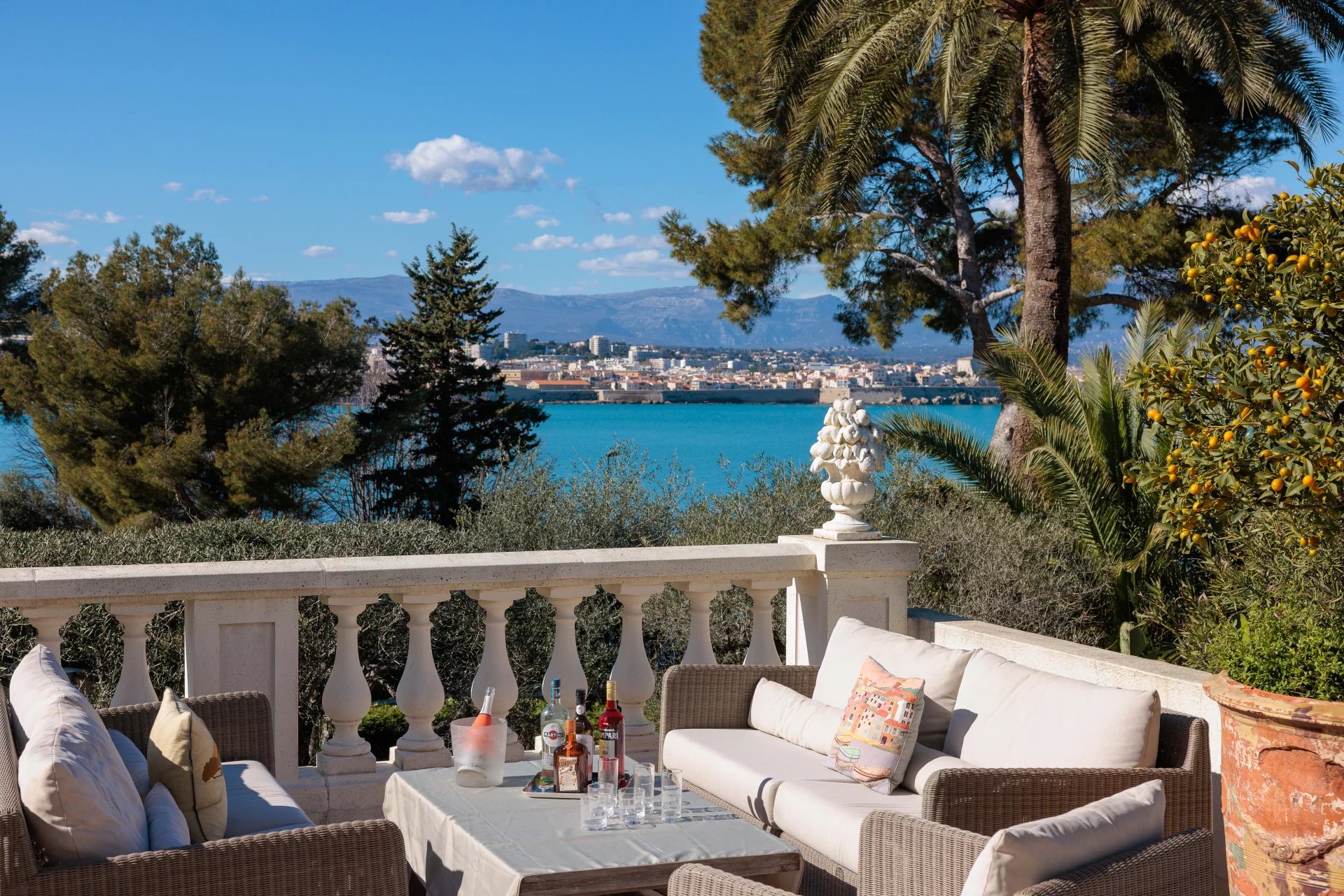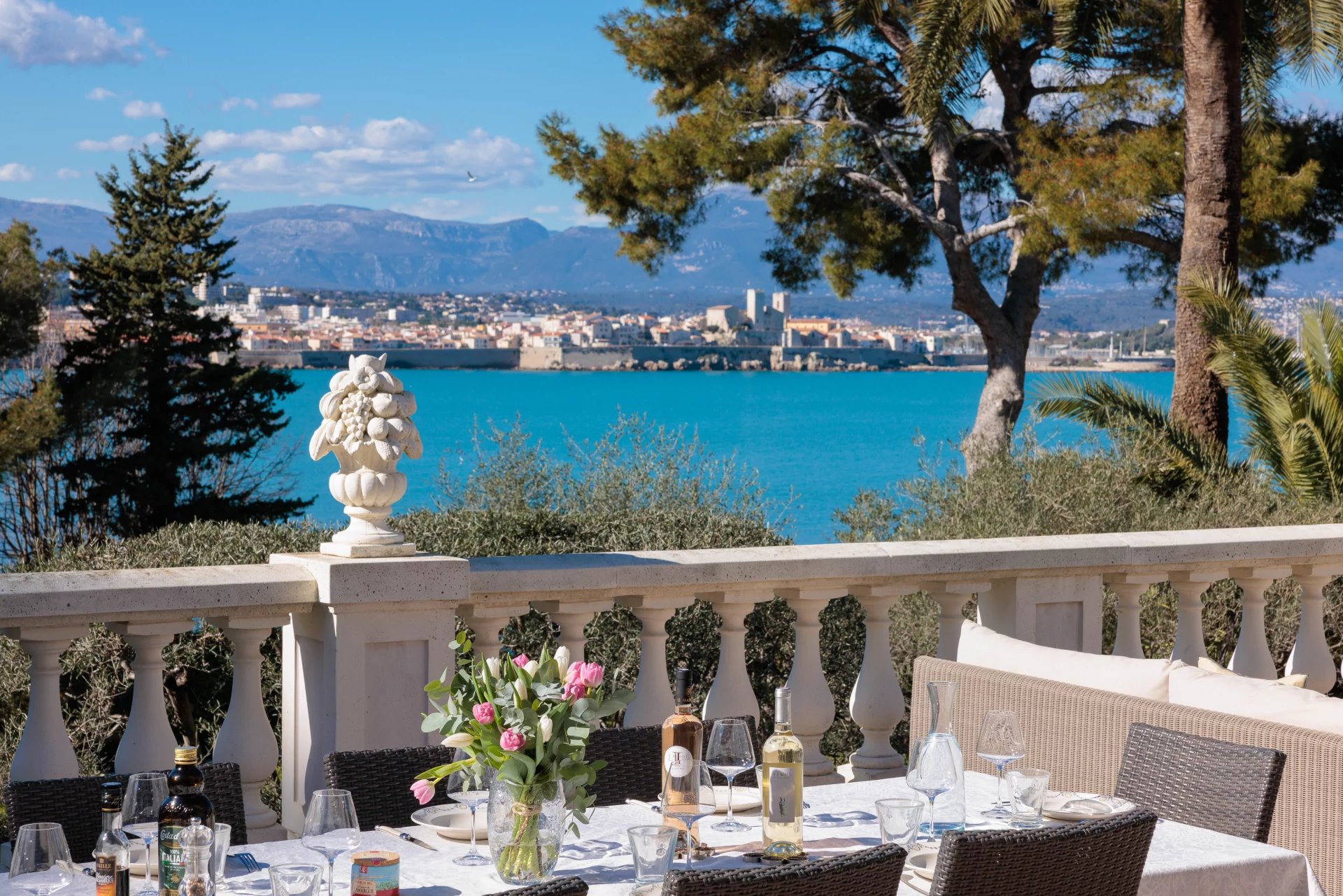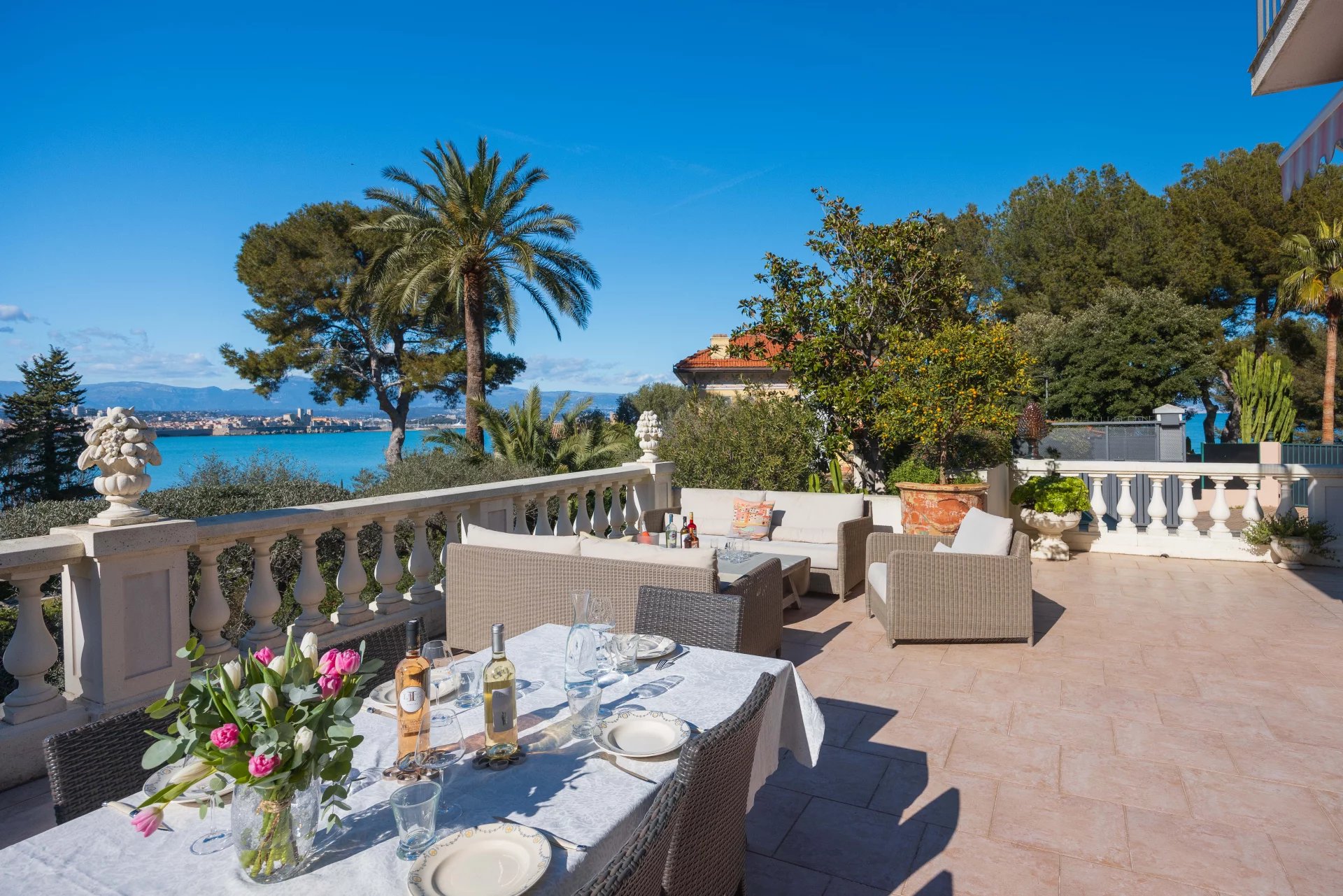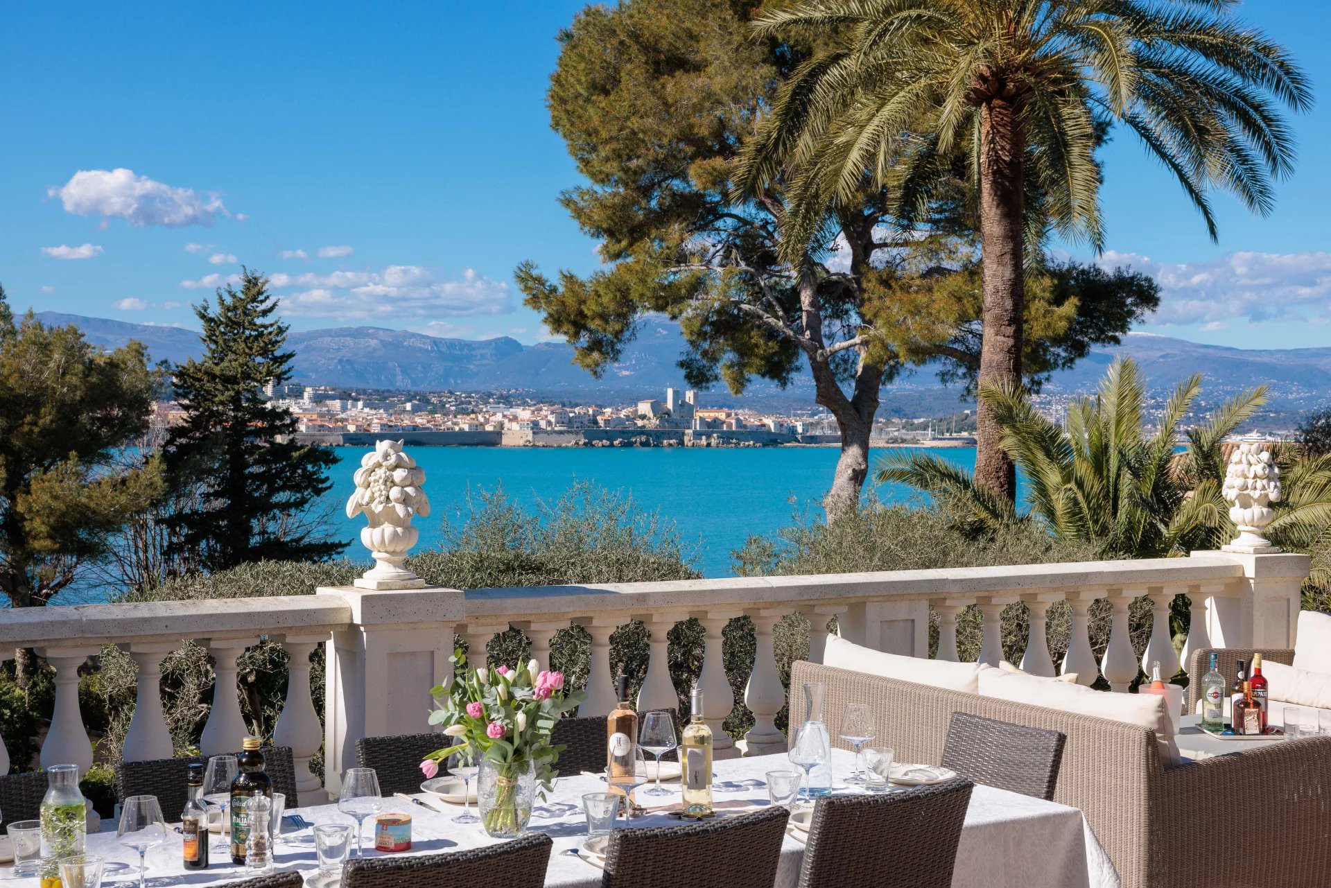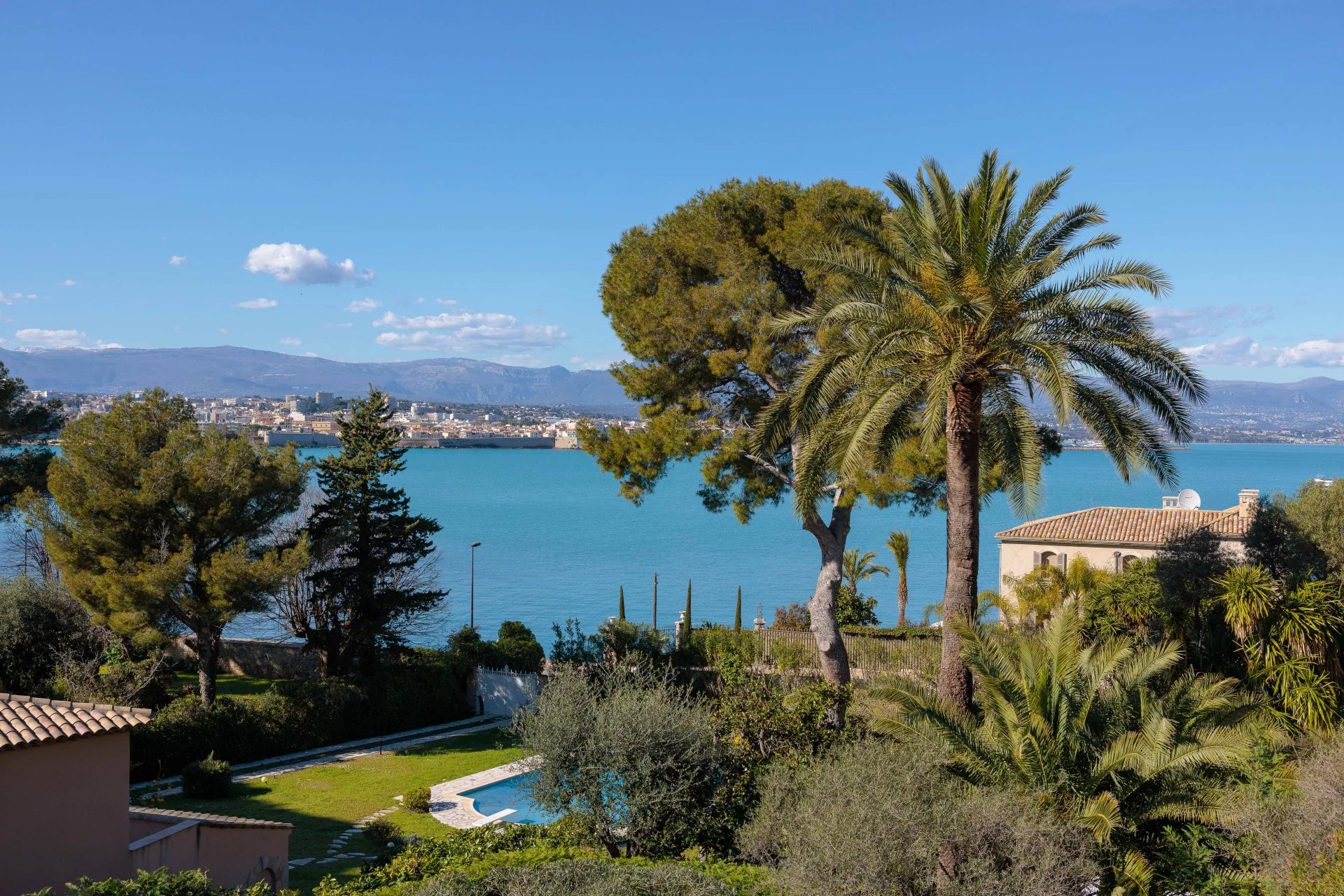 At the heart of a garden offering the essences of the Côte d'Azur such as citrus, olive trees, fig trees, myrtle, jasmine, but also cacti and large euphorbias, the villa enjoys superb views over Old Antibes and the Baie des Anges overlooked by the Alpes.