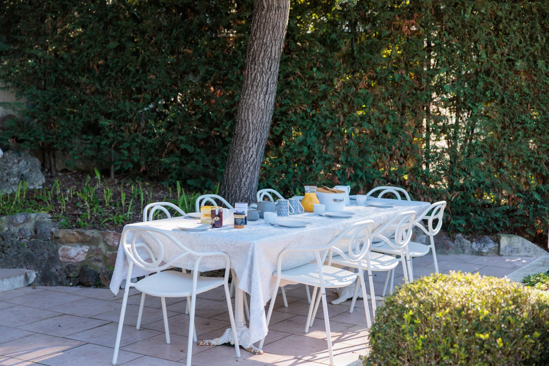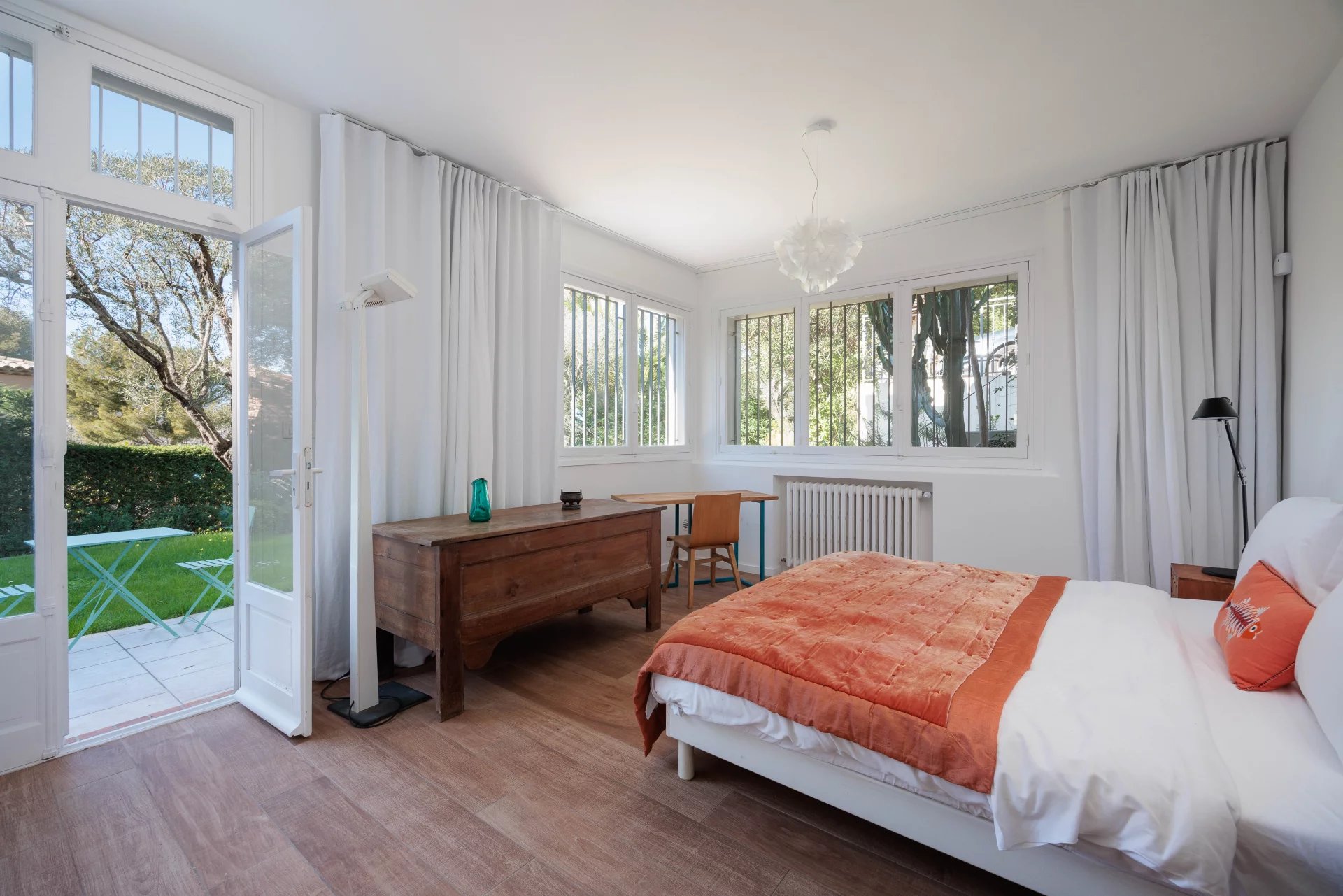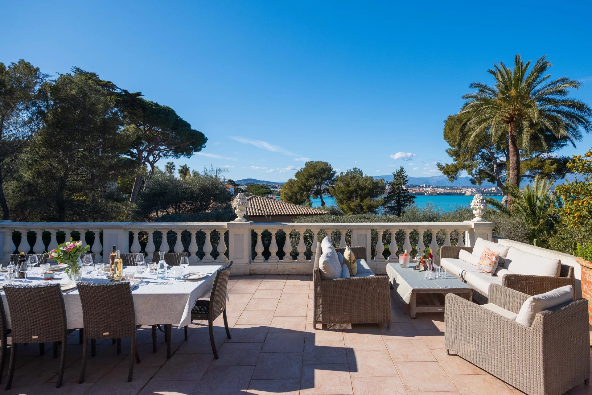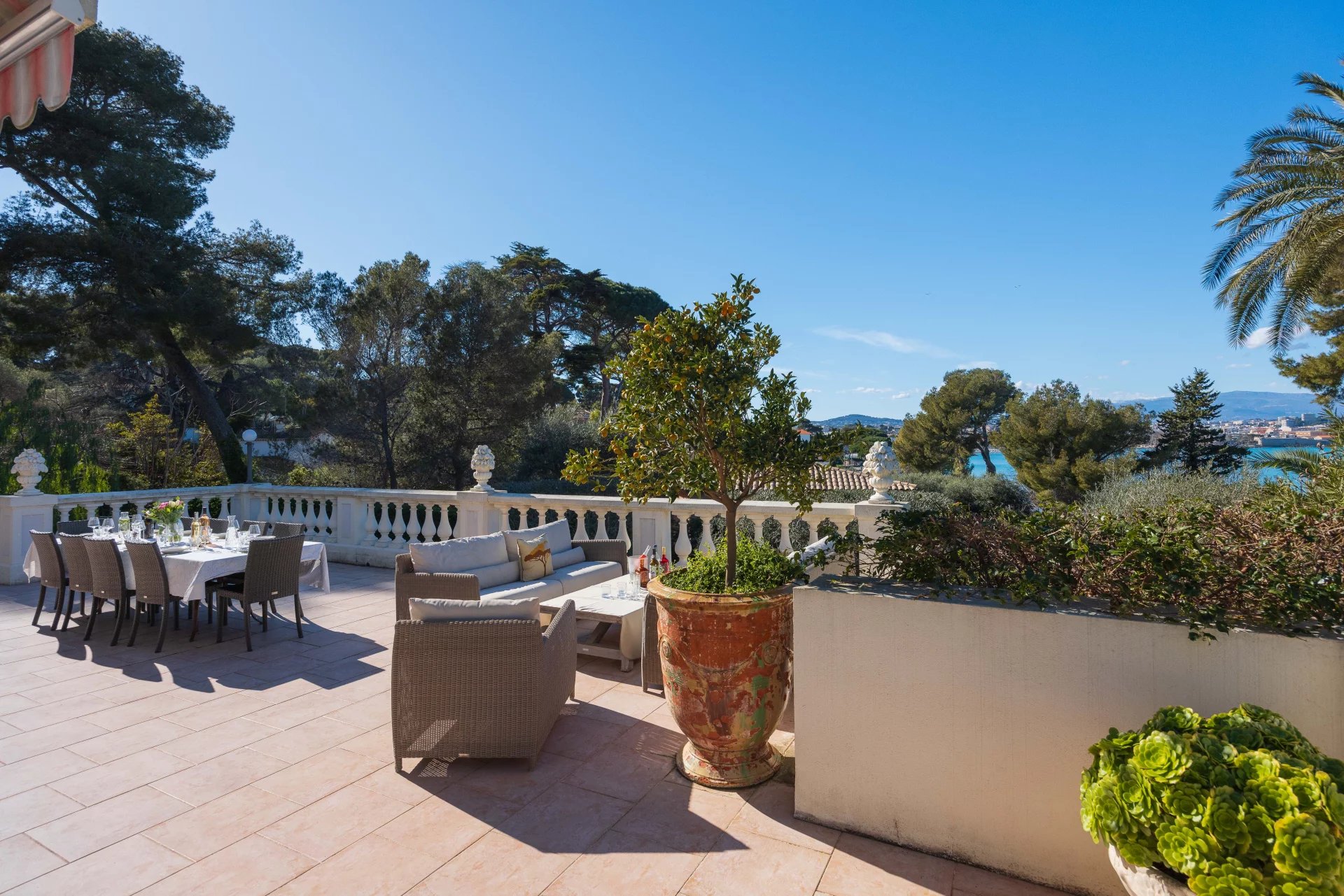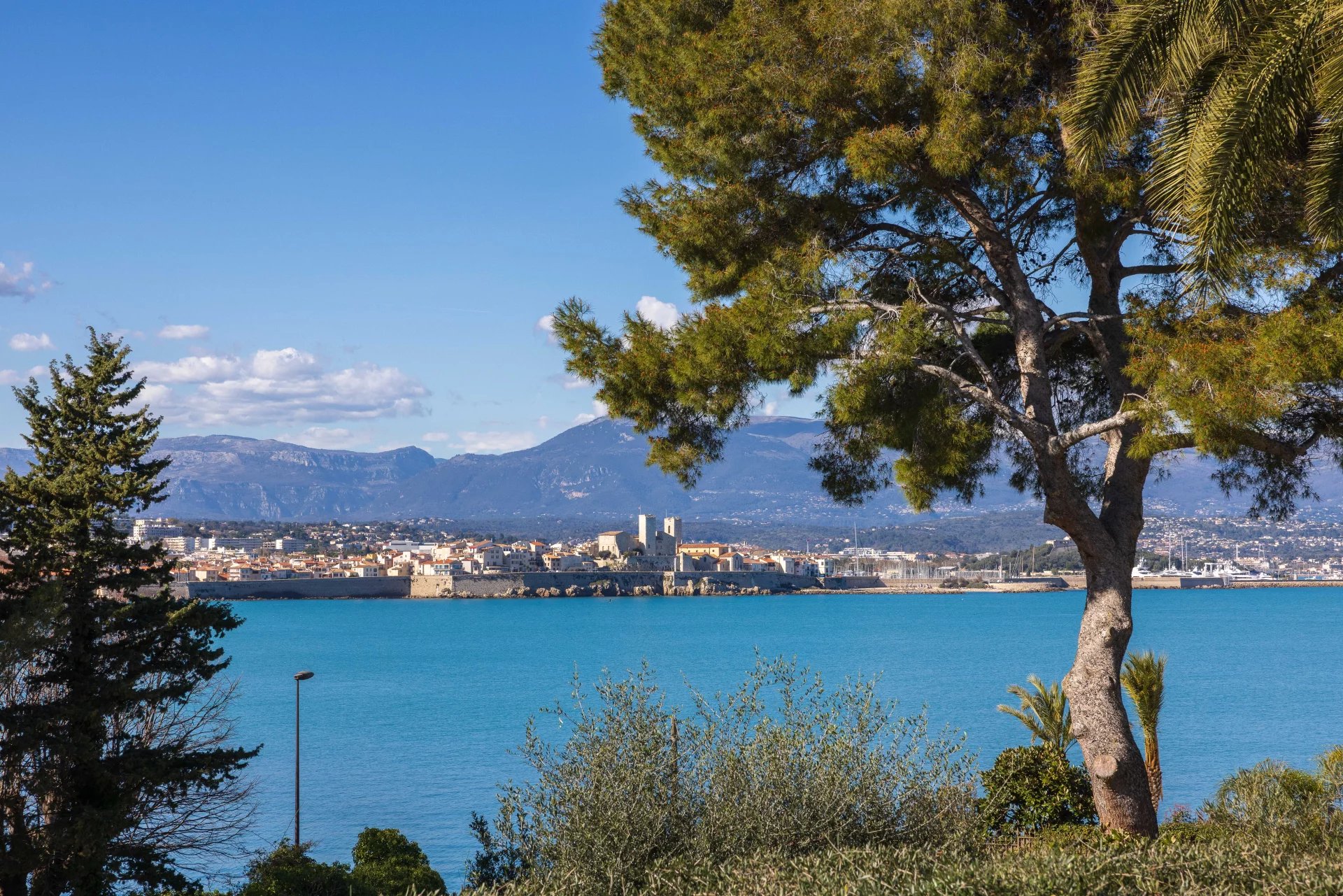 At the heart of a garden offering the essences of the Côte d'Azur such as citrus, olive trees, fig trees, myrtle, jasmine, but also cacti and large euphorbias, the villa enjoys superb views over Old Antibes and the Baie des Anges overlooked by the Alpes.