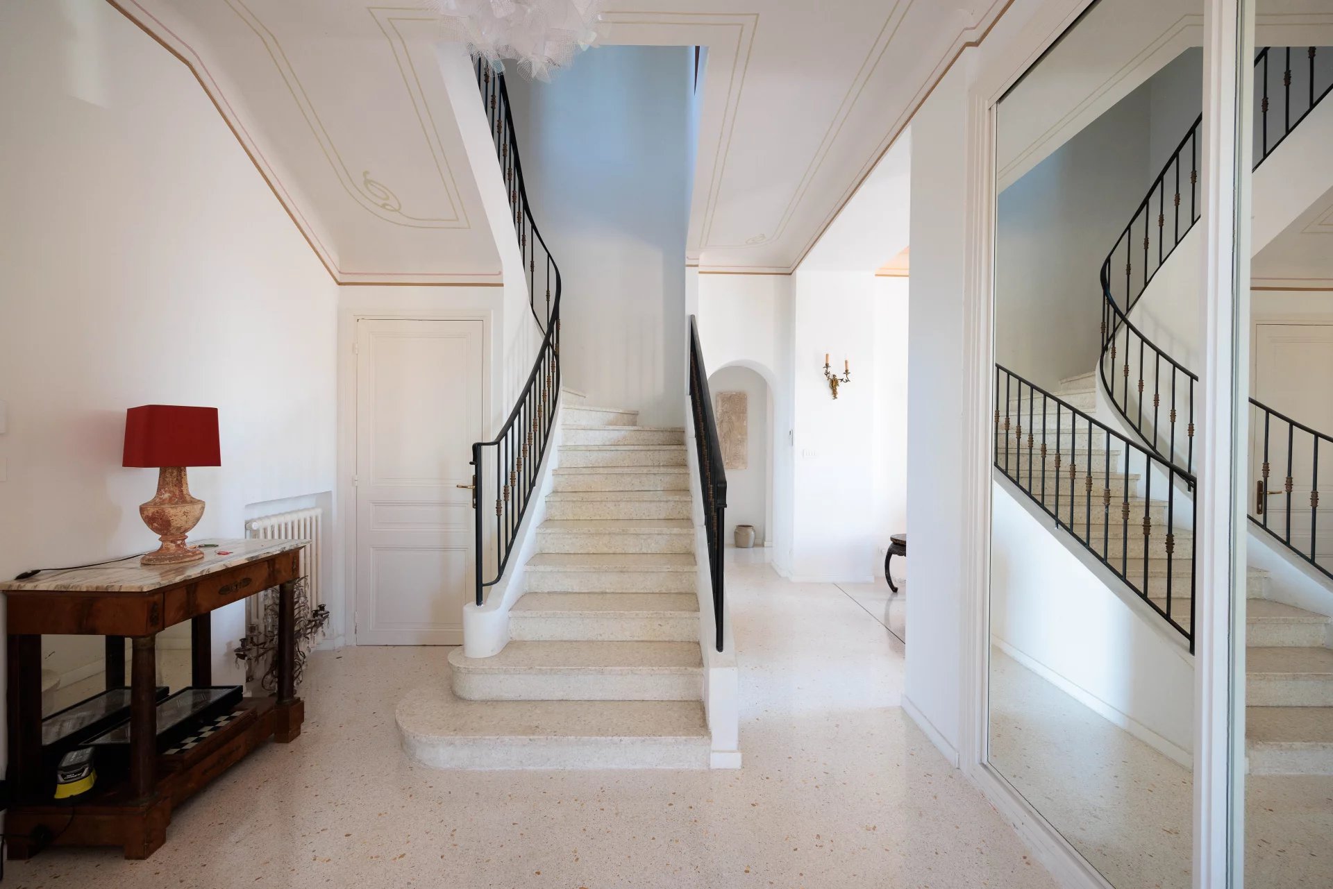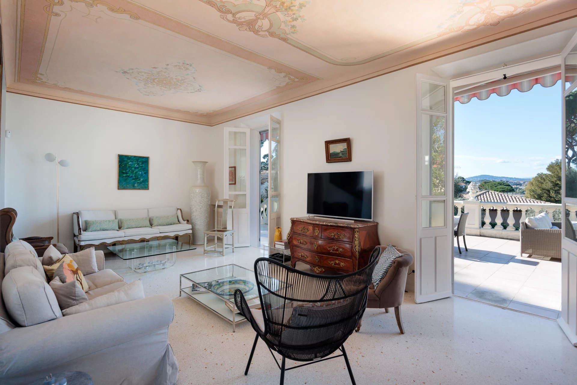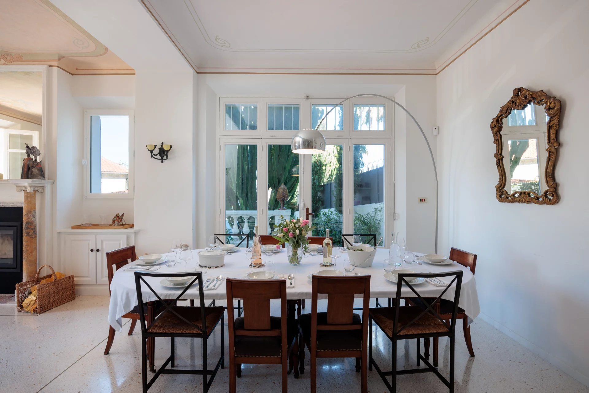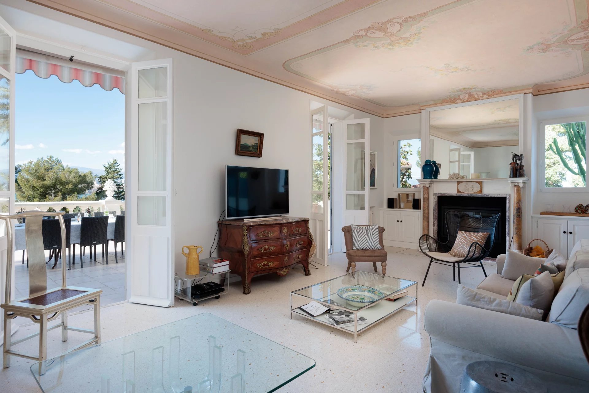 Close to the beaches of La Garoupe and La Salis, this villa dating from the 1930s was completely renovated in 2019 in a chic and contemporary style, respecting the style elements of its origins such as the frescoed ceiling in the living room.