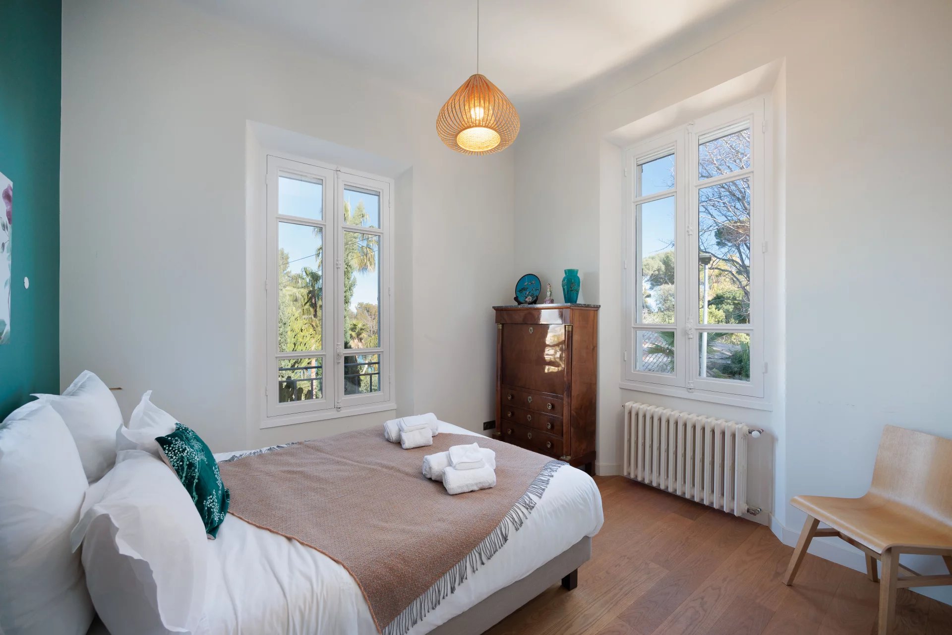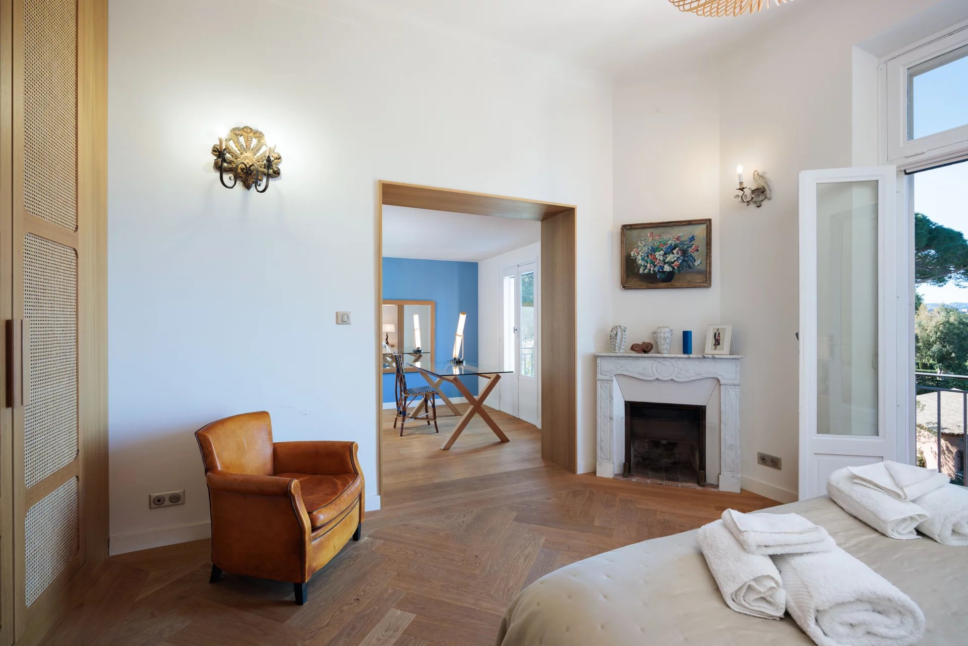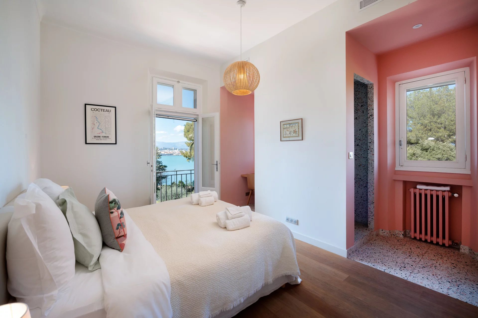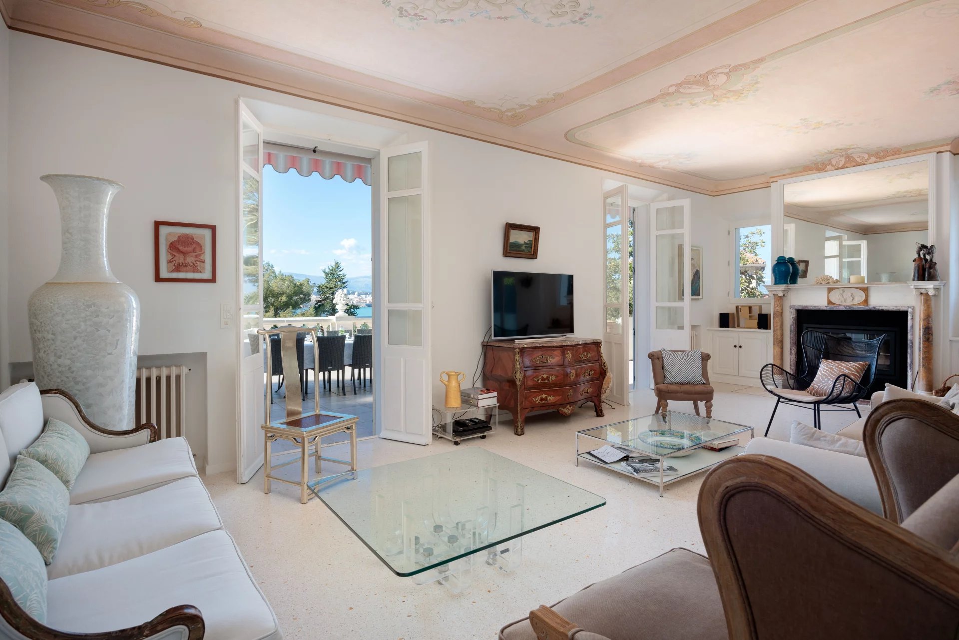 Close to the beaches of La Garoupe and La Salis, this villa dating from the 1930s was completely renovated in 2019 in a chic and contemporary style, respecting the style elements of its origins such as the frescoed ceiling in the living room.