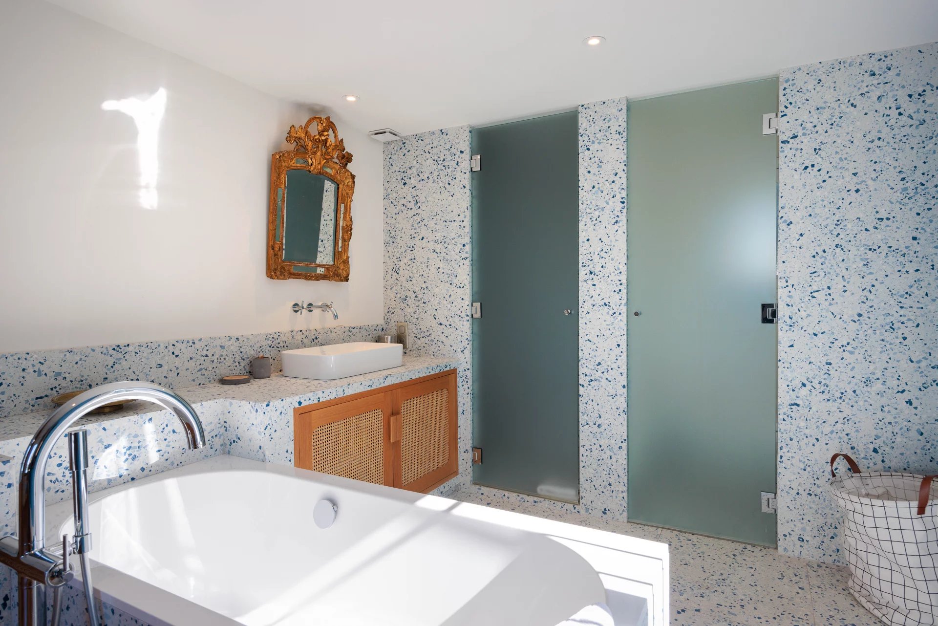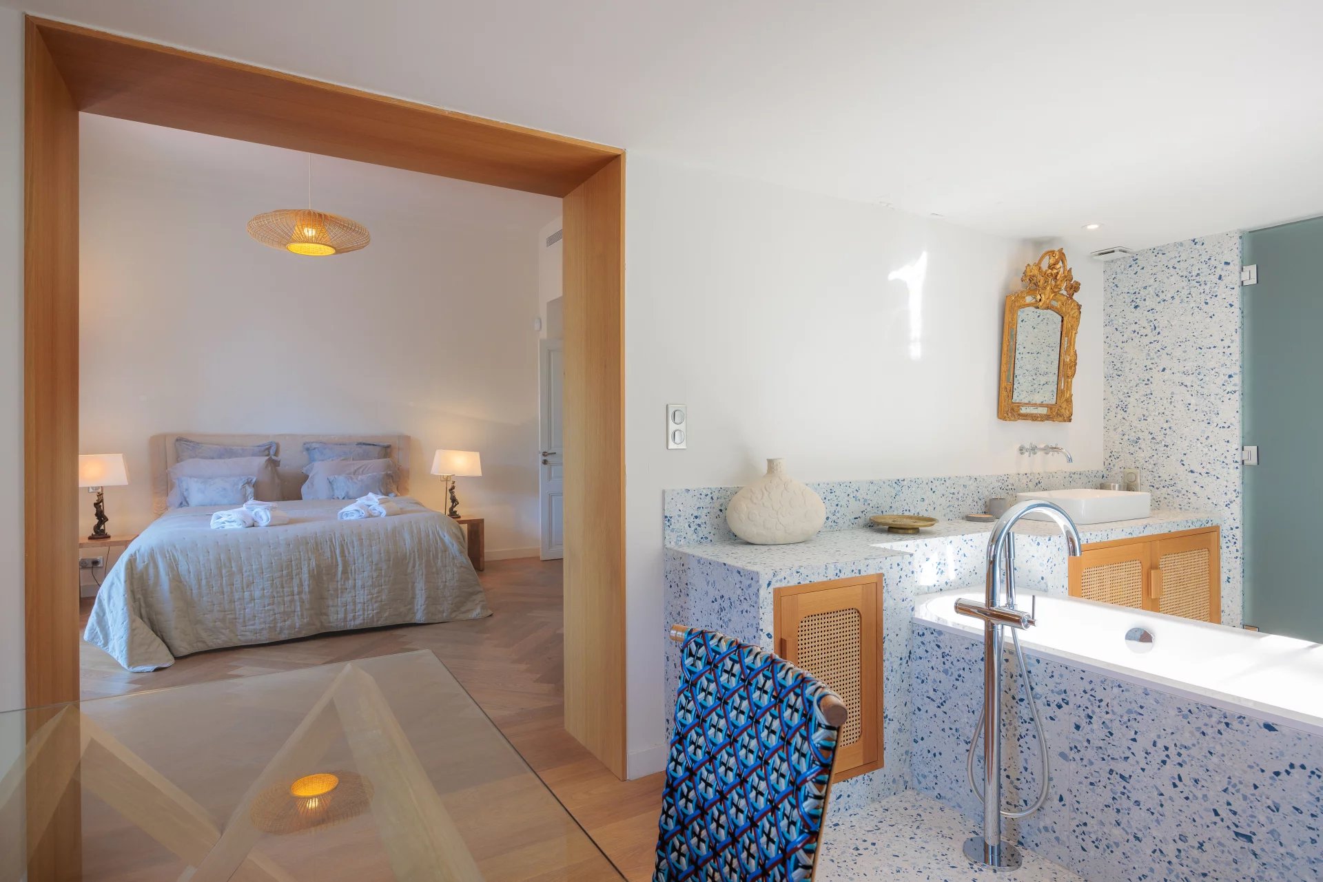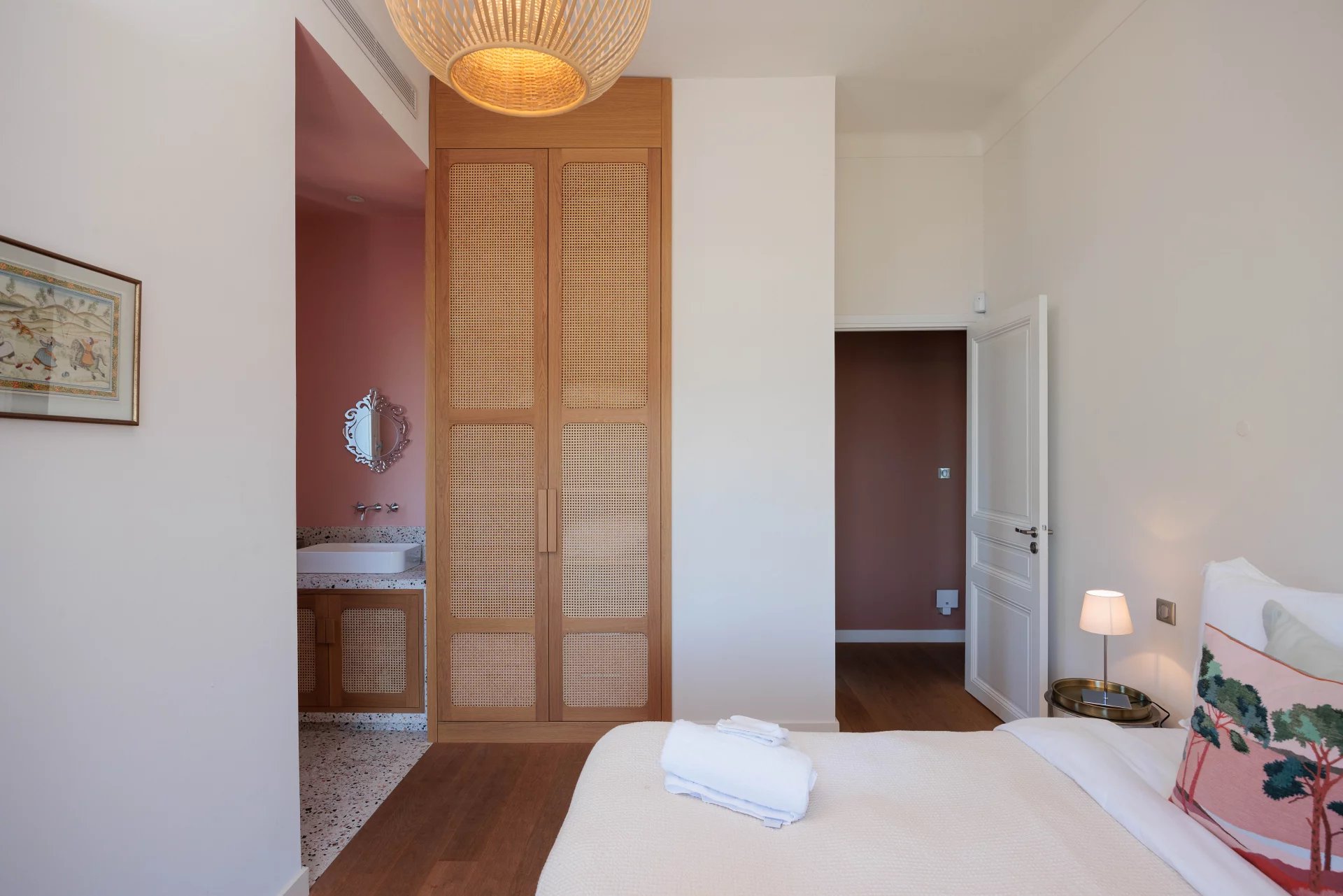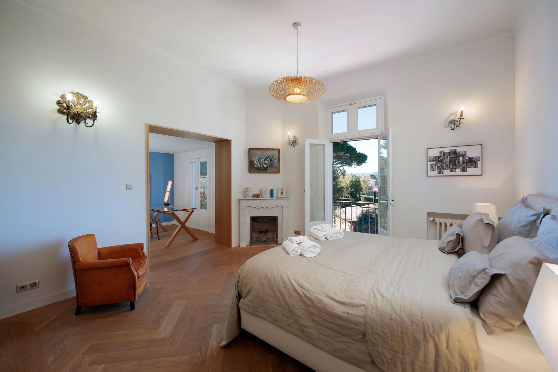 Close to the beaches of La Garoupe and La Salis, this villa dating from the 1930s was completely renovated in 2019 in a chic and contemporary style, respecting the style elements of its origins such as the frescoed ceiling in the living room.