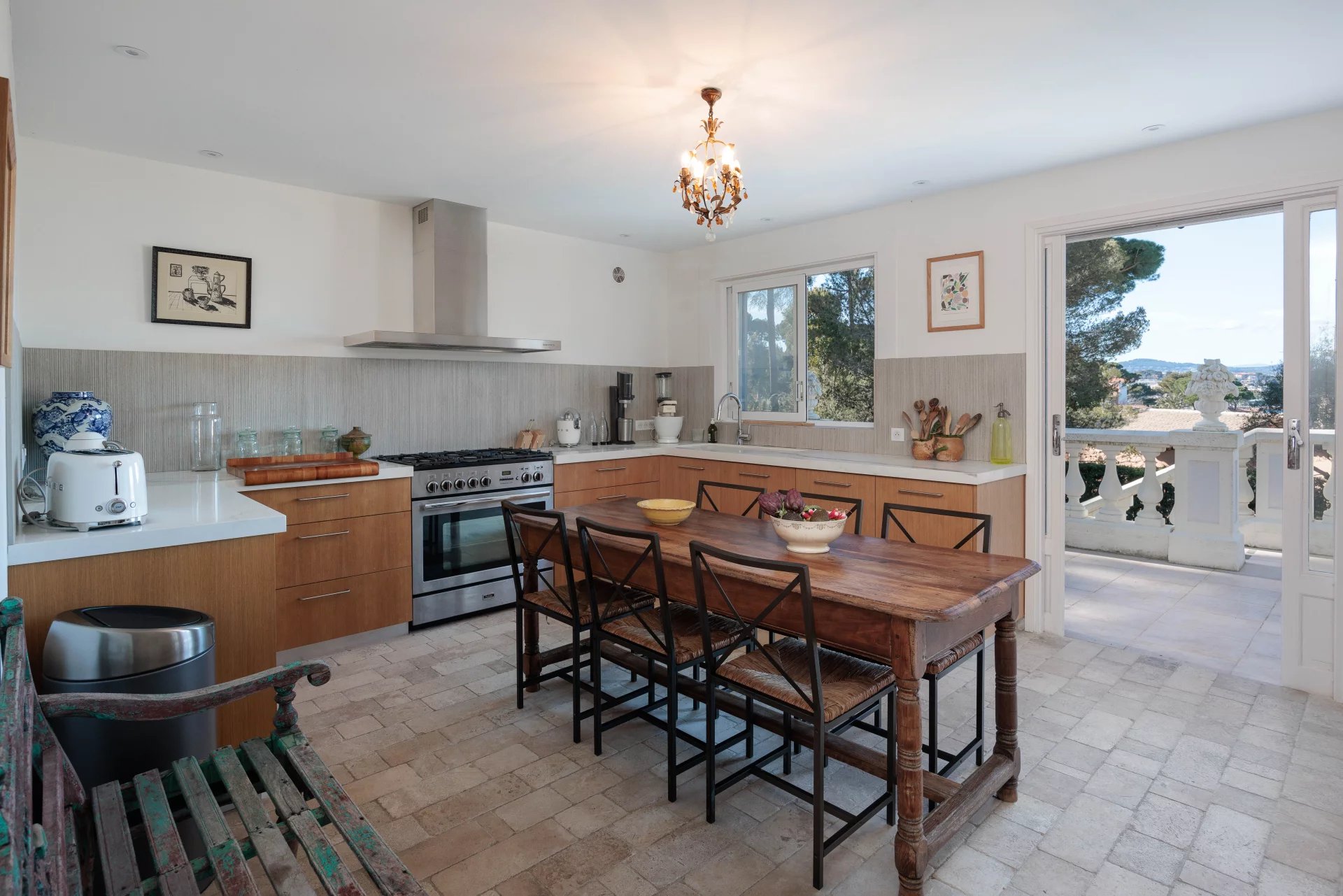 Fully equipped kitchen with professional piano, dining area, opening onto the terrace