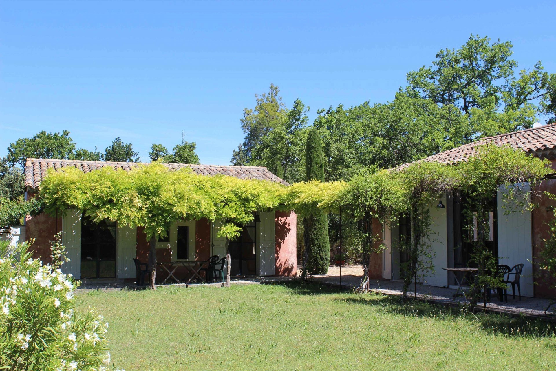 A few minutes drive from the center of Gordes and Cabrières-d'Avignon, you will spend authentic holiday in the Luberon in this beautiful house. It is located on a plot of land of approx. 3800 sqm, with white oaks, olive and cherry trees, lavender and rose bushes... Large secure swimming pool 12 x 6 m. In a warm atmosphere, the 100 sqm house offers a large and bright living-room , a fully equipped kitchen, a double bedroom with its bathroom. The annex of approx. 50 sqm has two bedrooms with a bathroom.