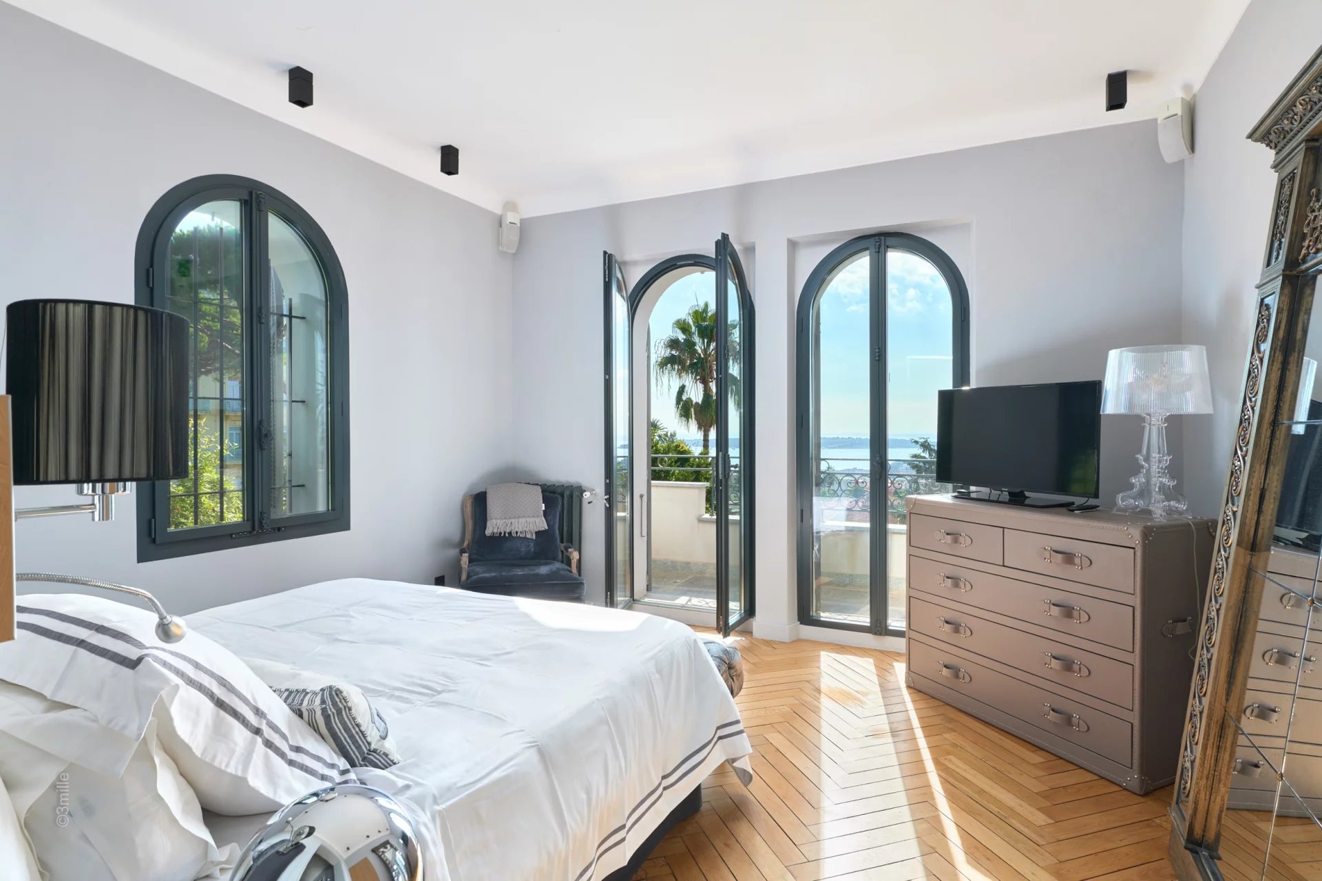 Master bedroom (king size bed or two single beds), TV, opening onto a balcony, sea view – Ensuite bathroom / shower / WC