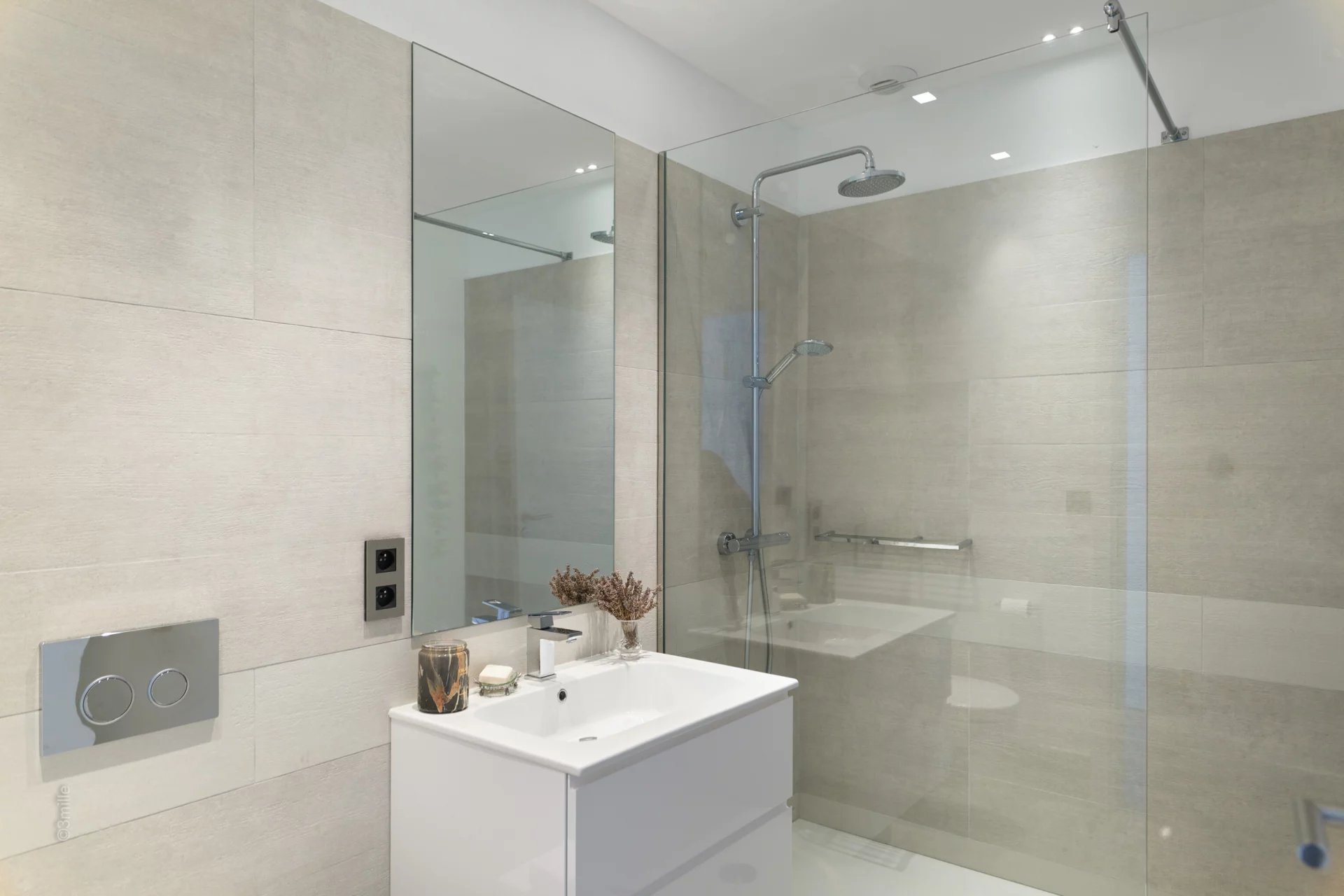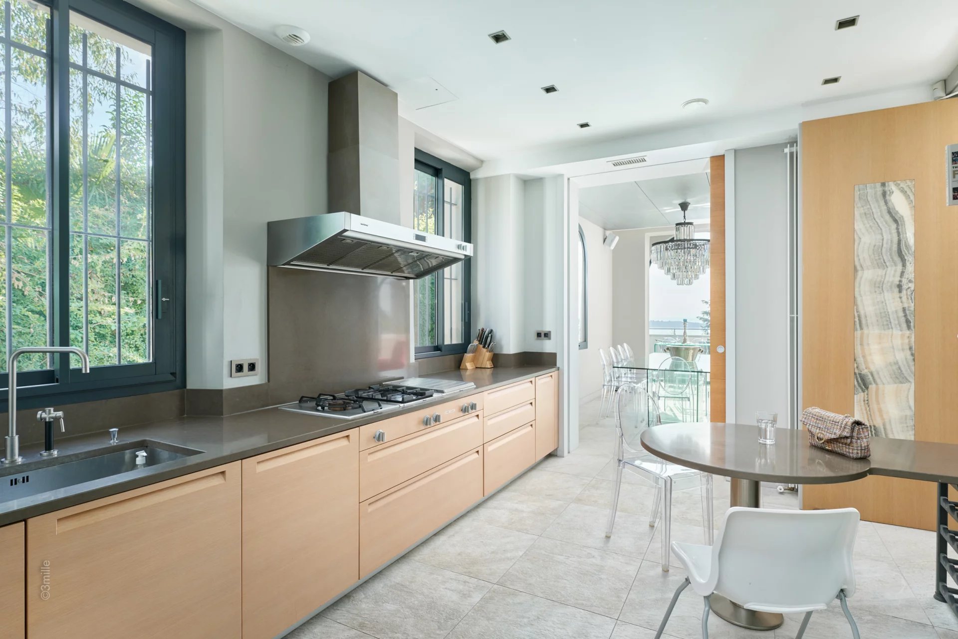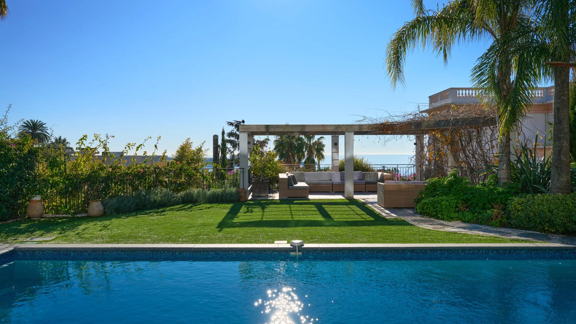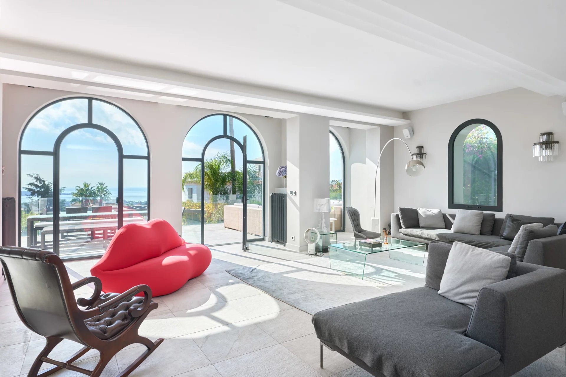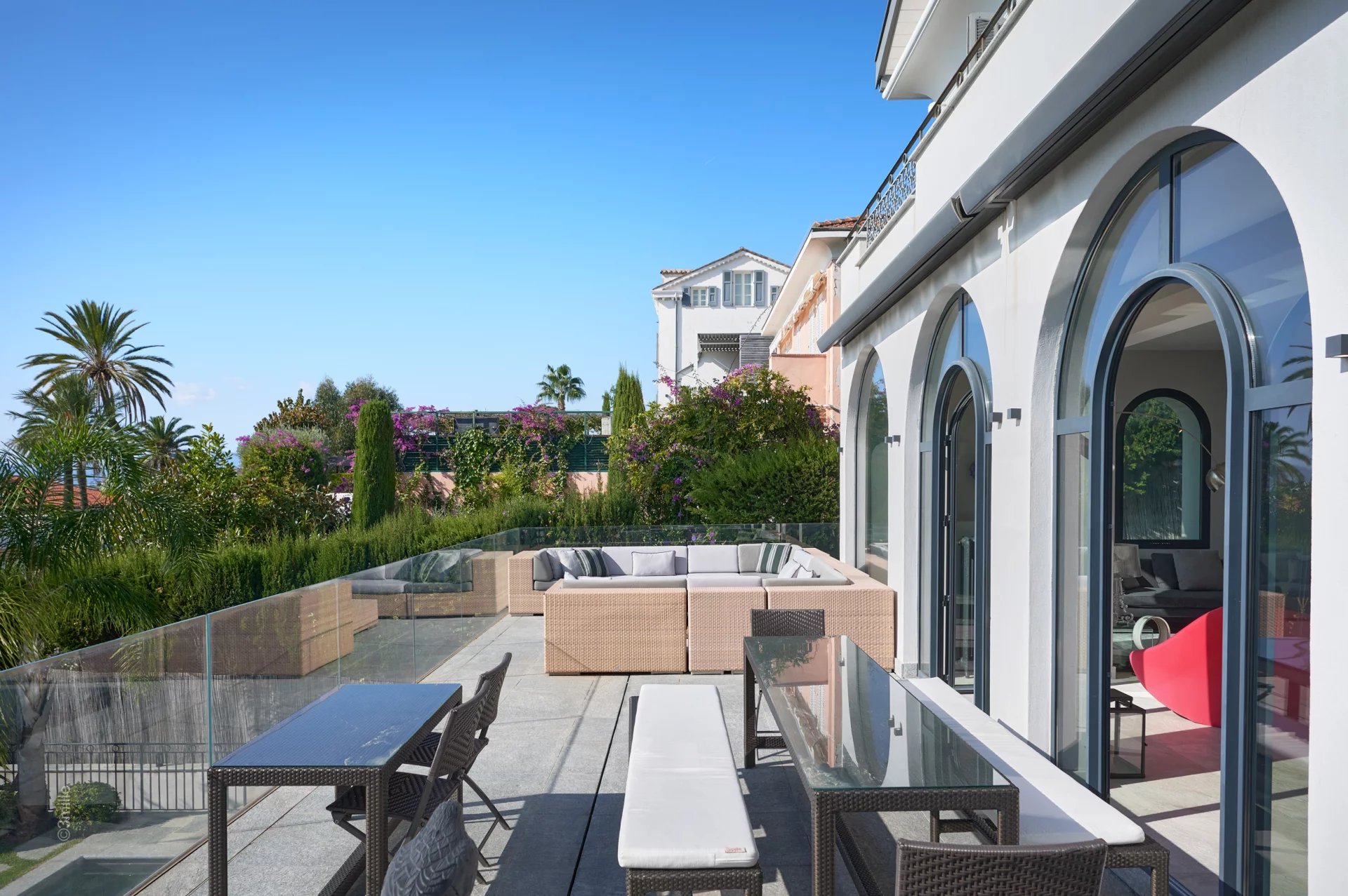 Attractive reception room with living room,very well equiped kitchen and dining area, opening onto a large terrace enjoying sea view with summer lounge and dining-table