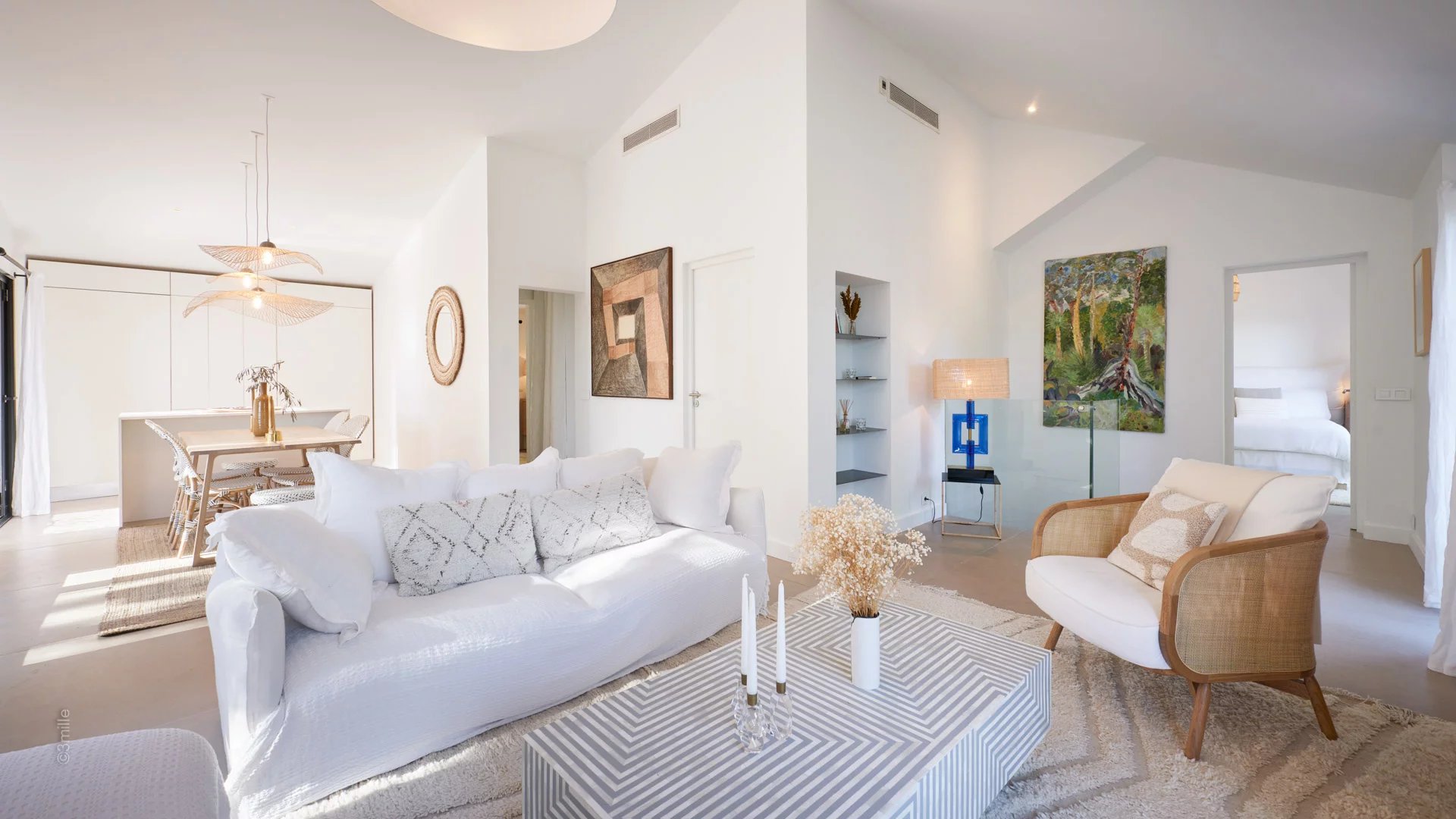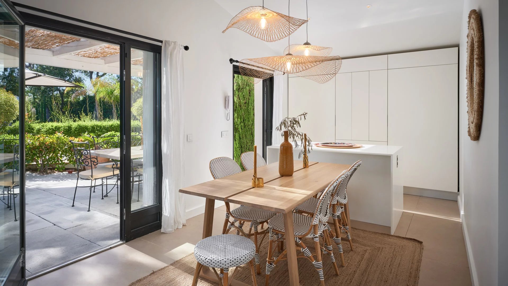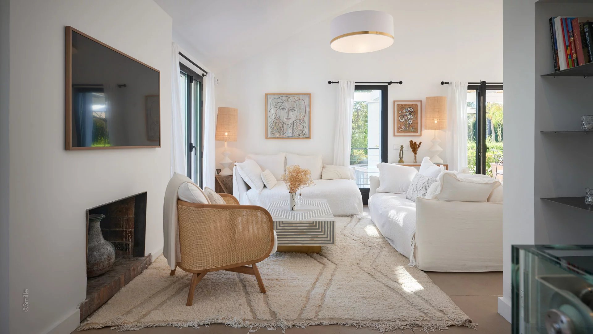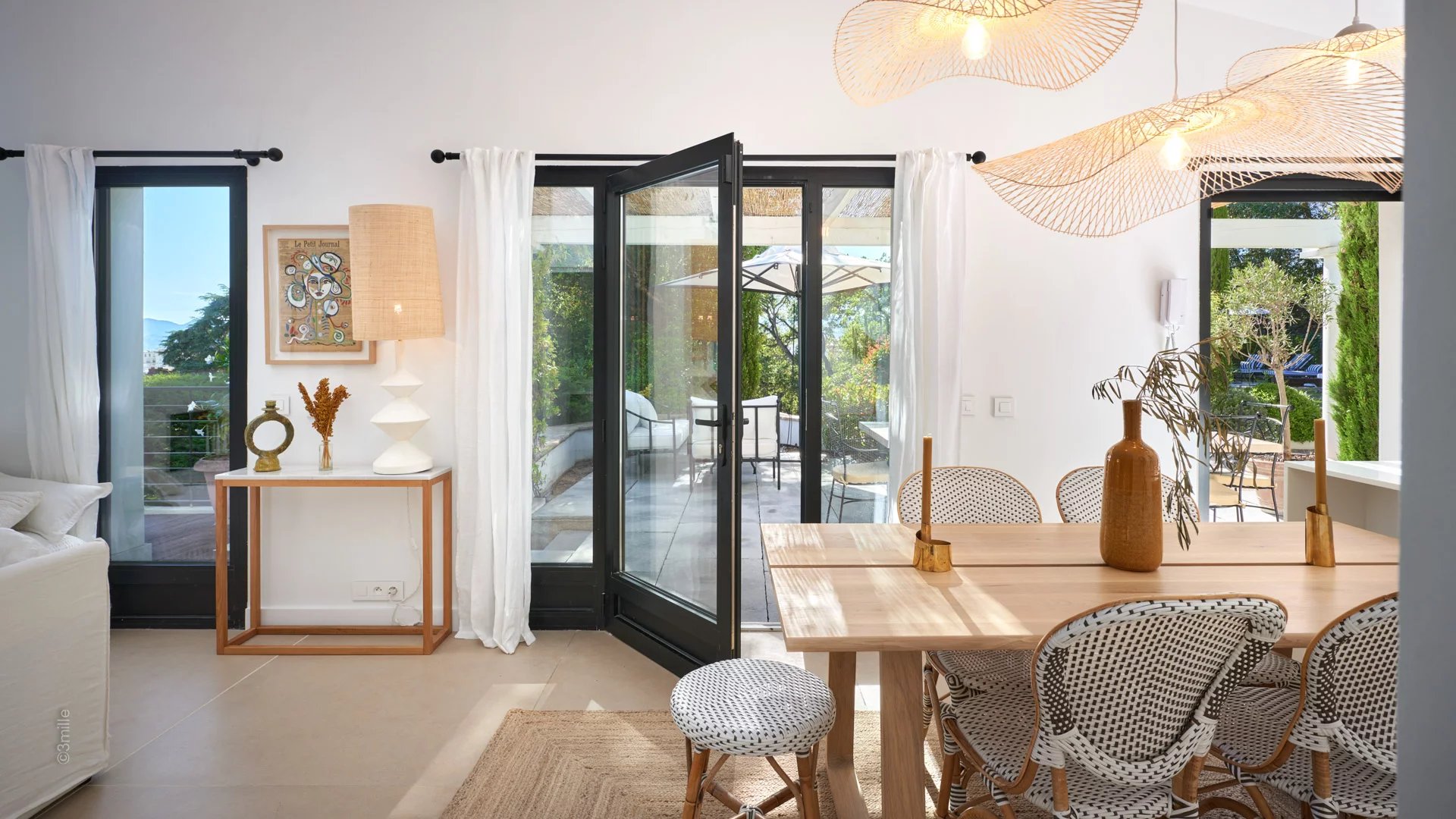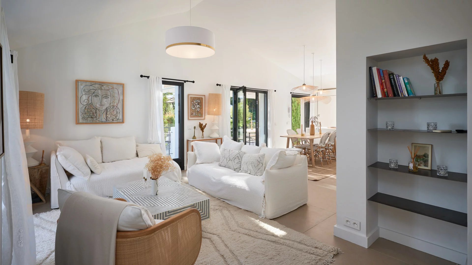 Reception room comprising living room with open plan kitchen, TV, fireplace, dining area, all opening onto a terrace and the garden