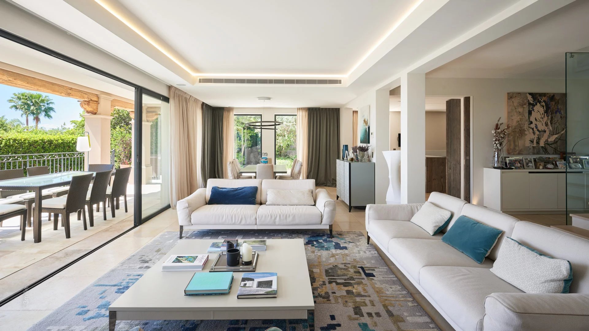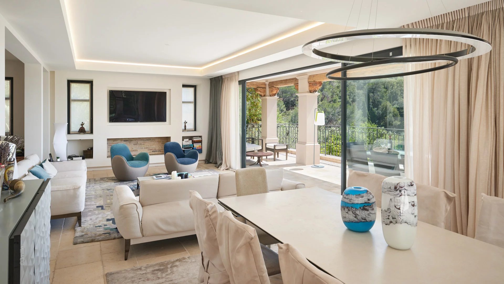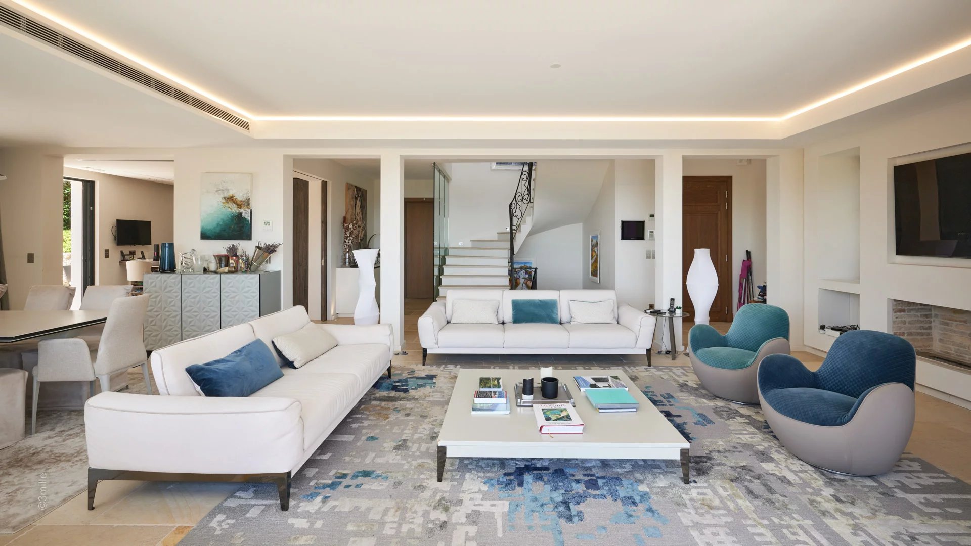 Entrance hall leading to the reception room including living room, dining room and open kitchen, all opening onto the terrace with a panoramic sea view over the bay of Cannes.