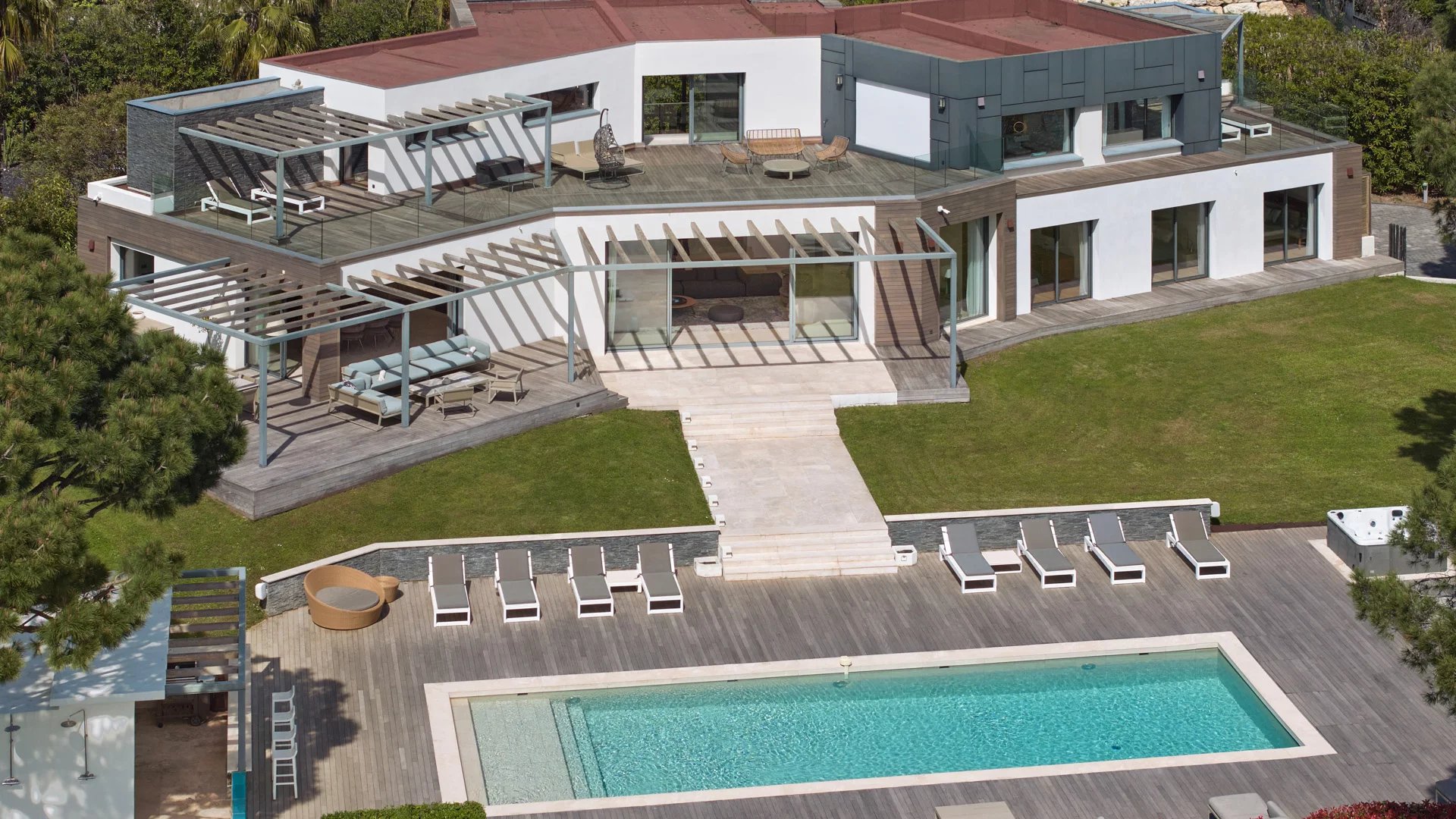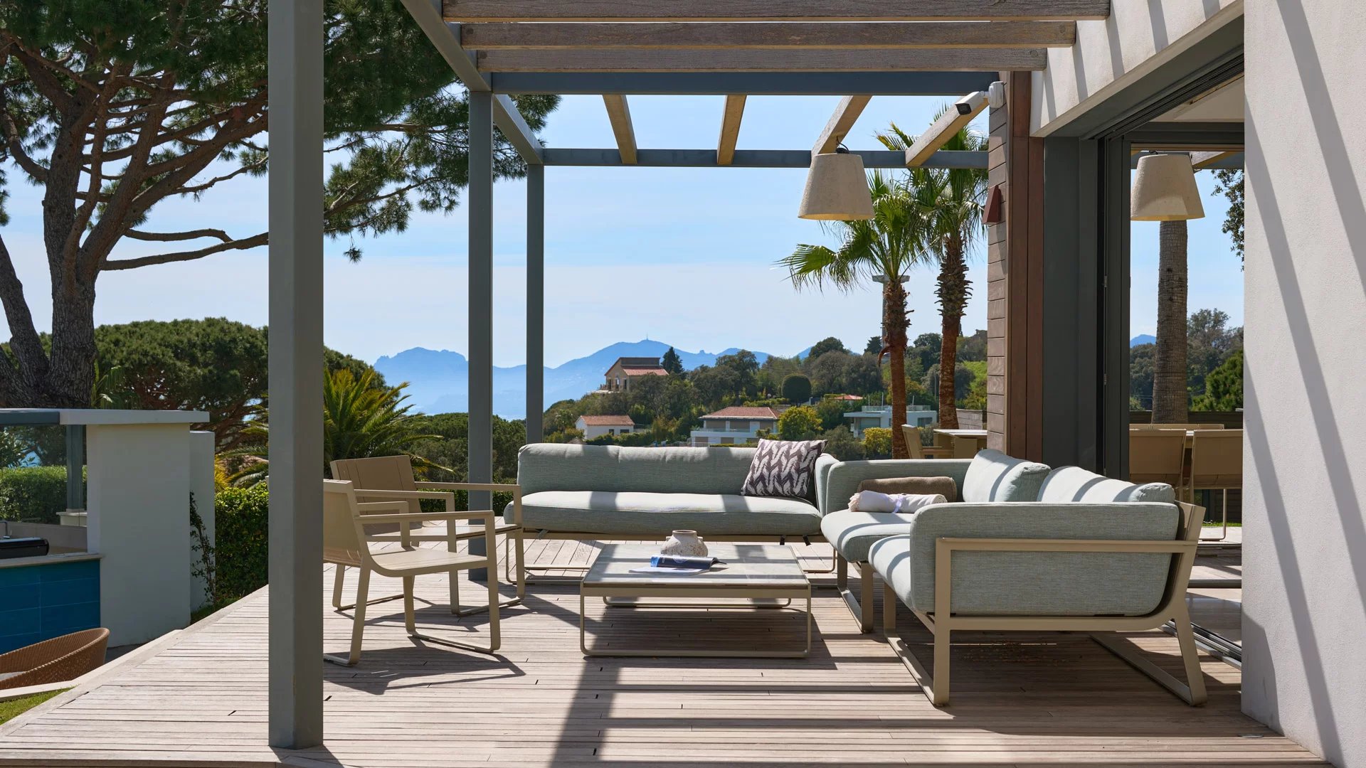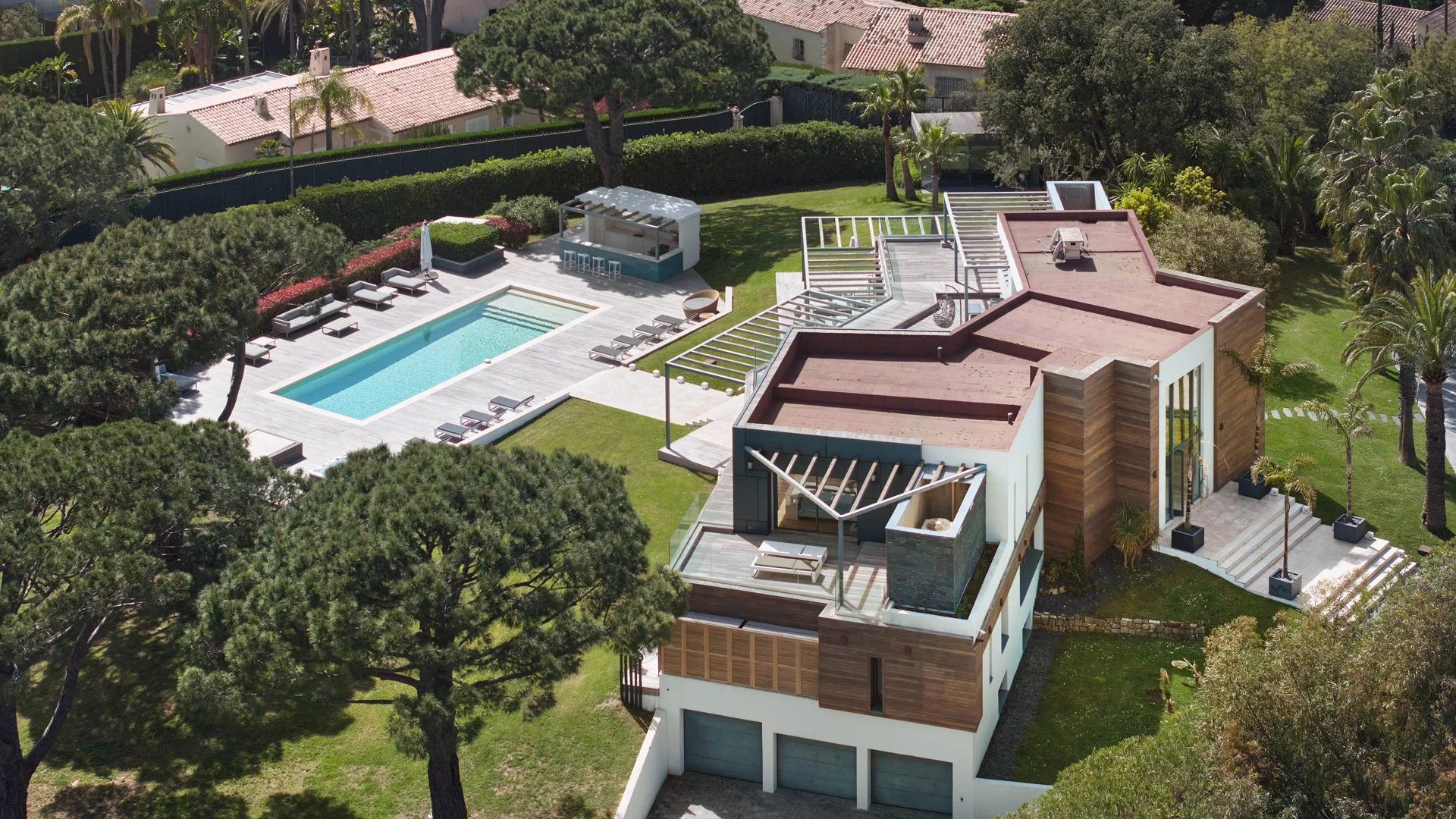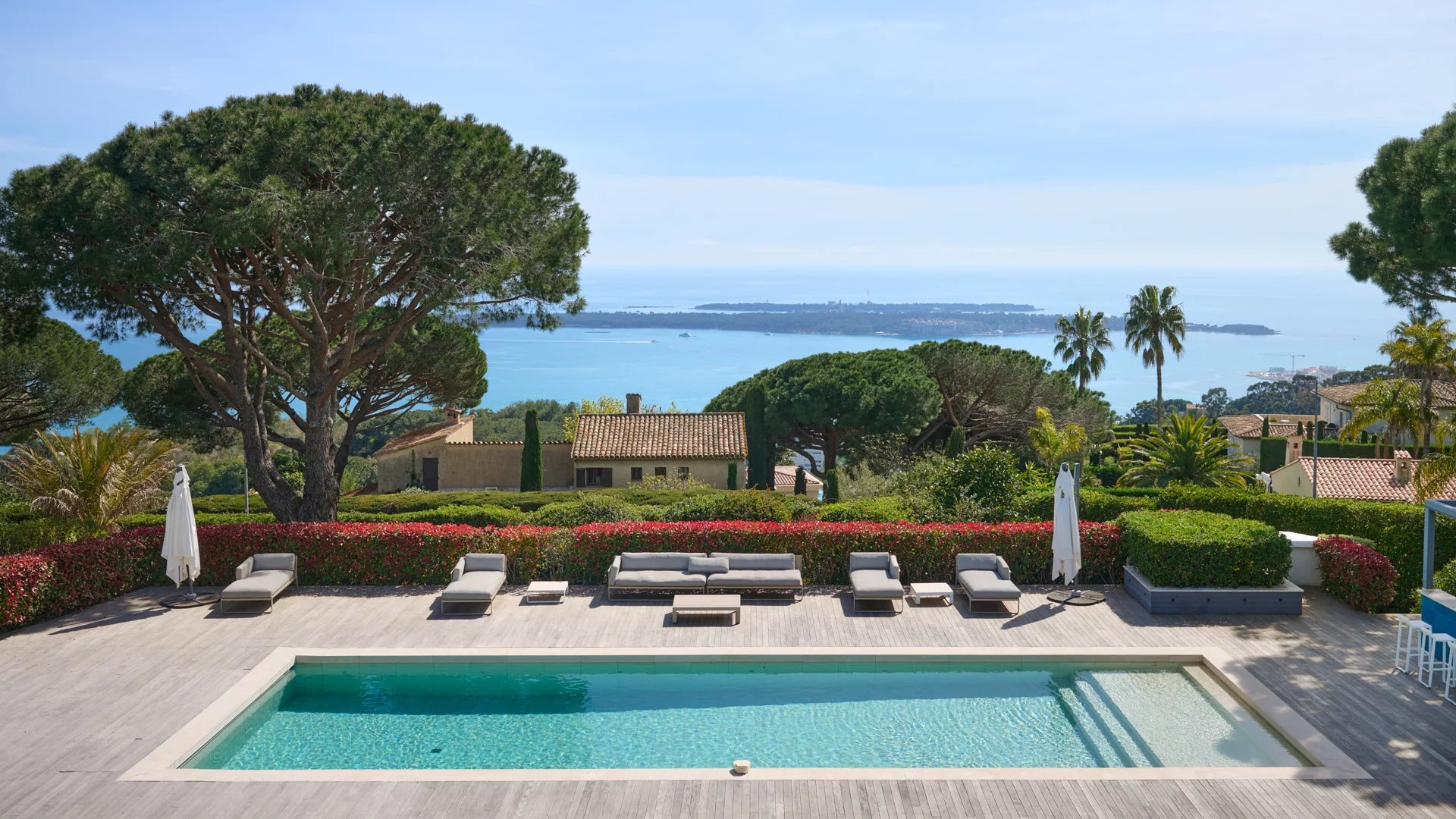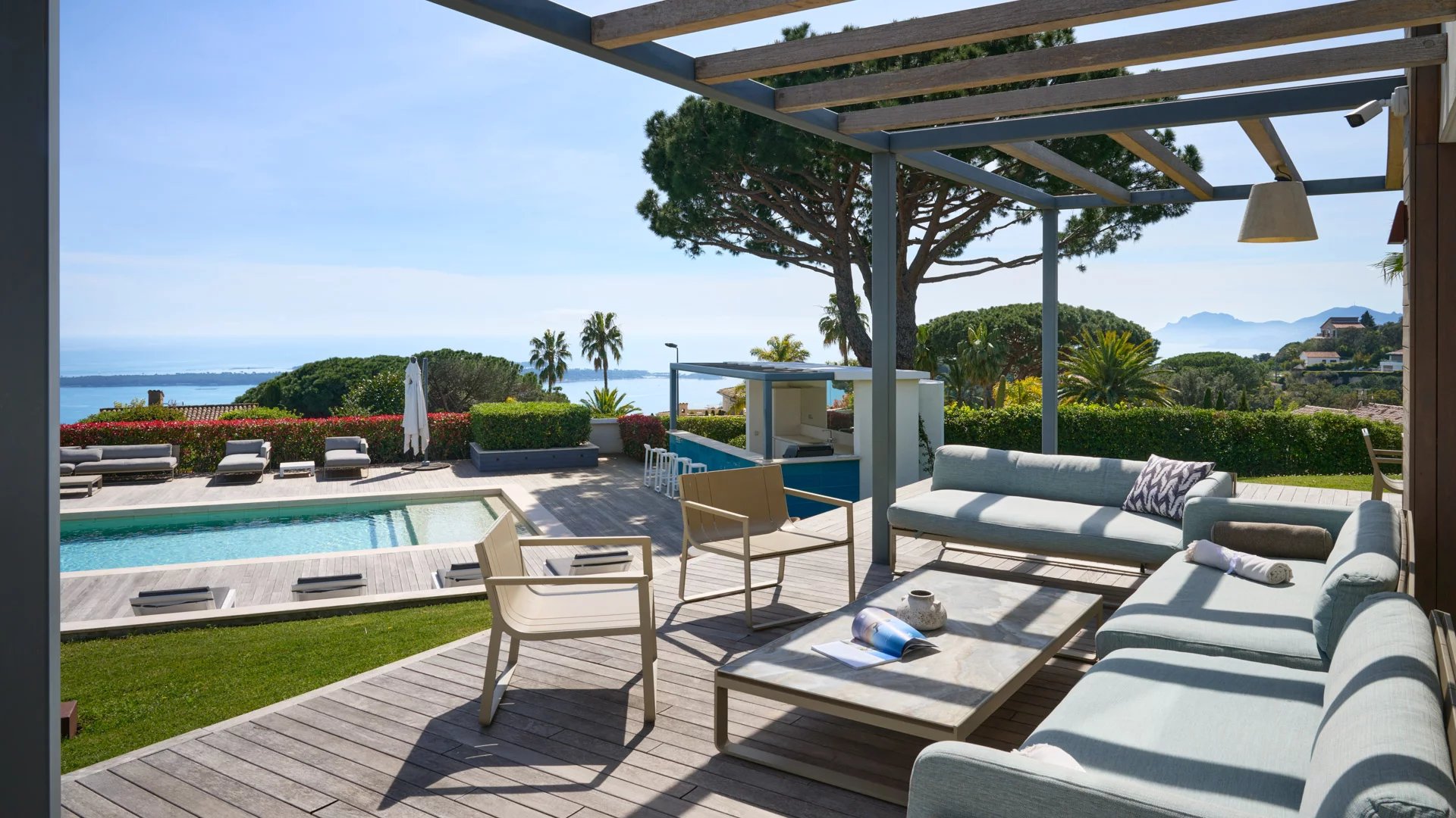 On the heights of Cannes, offering a unique view of the Lérins Islands, this magnificent contemporary villa combines wood and concrete in the heart of a park of about 6 200 sq.m. Completely renovated, the villa impresses with its generous volumes, the top of the range appointments throughout and three large terraces.