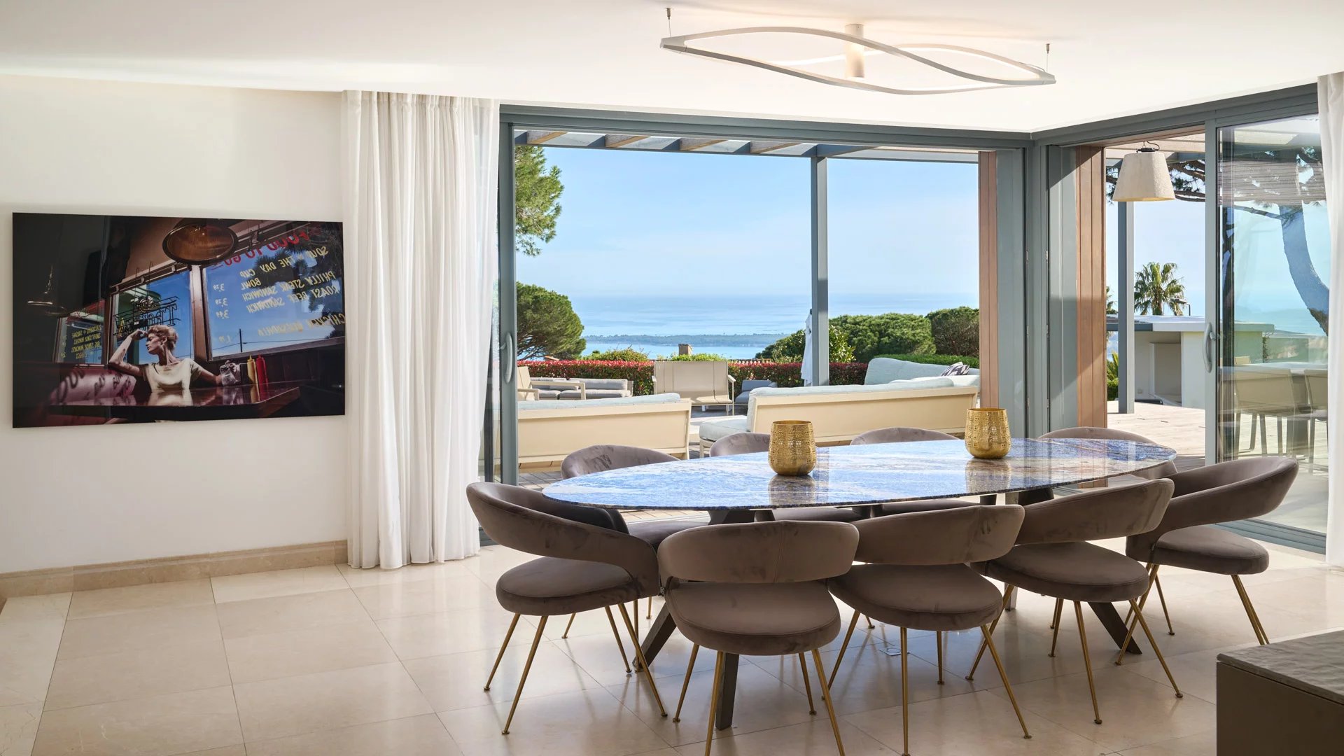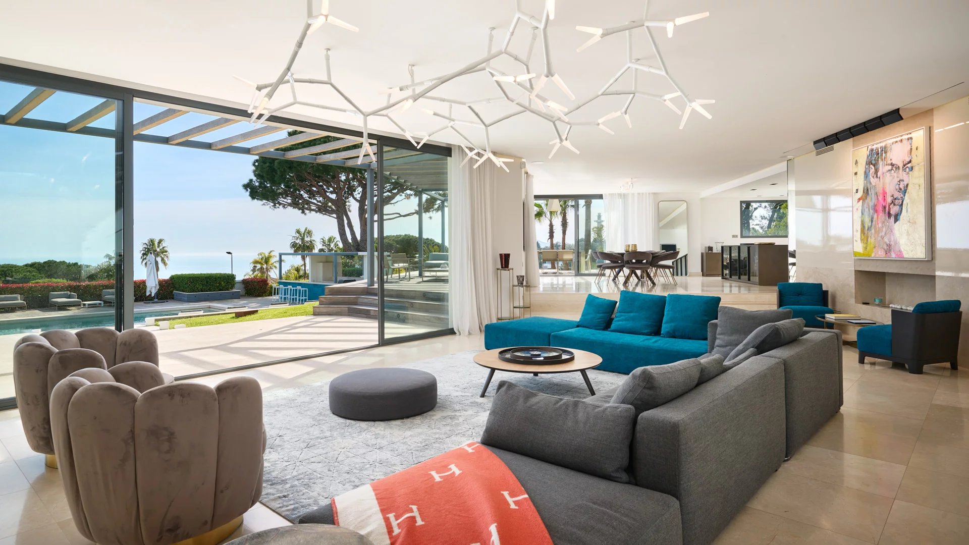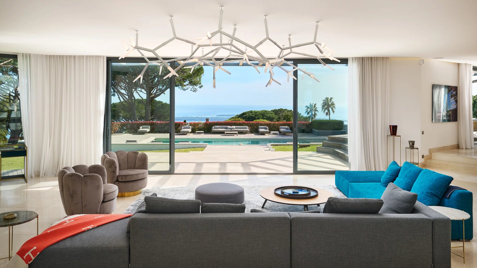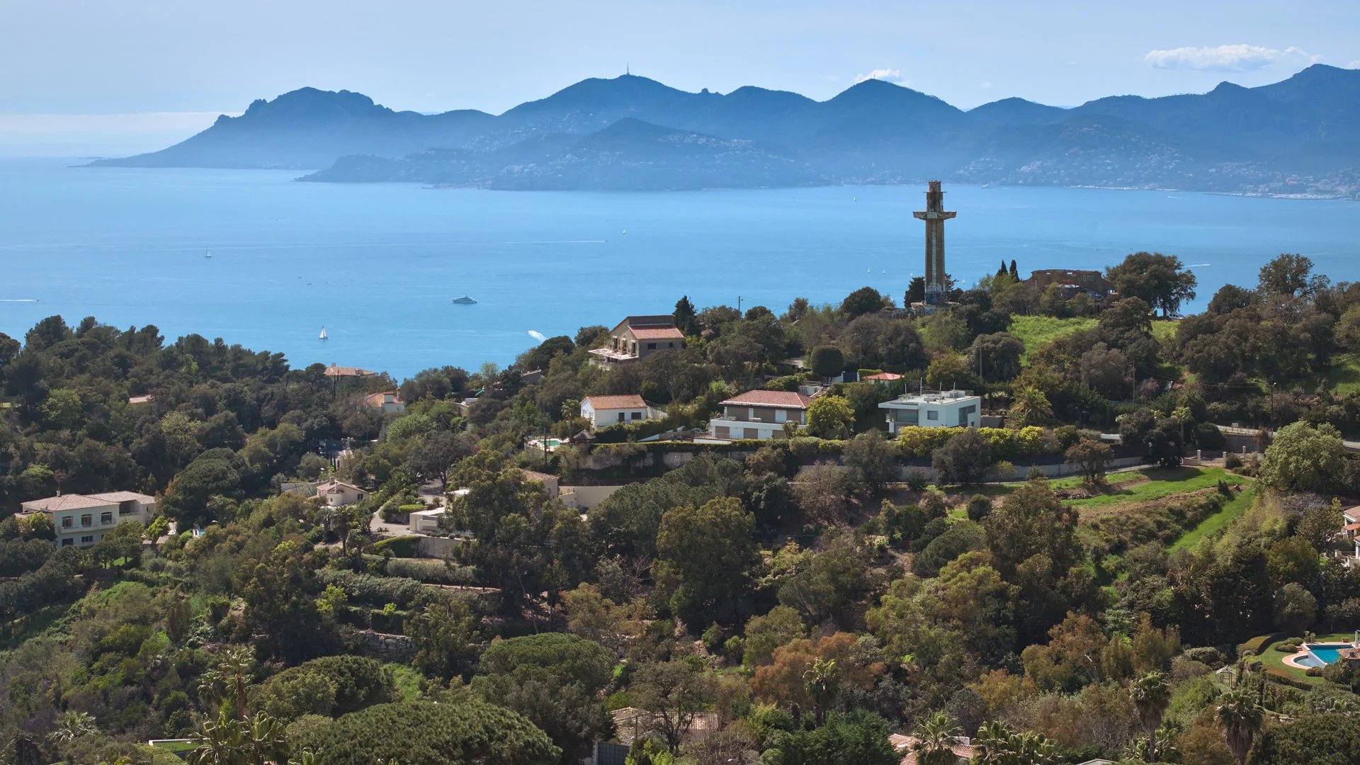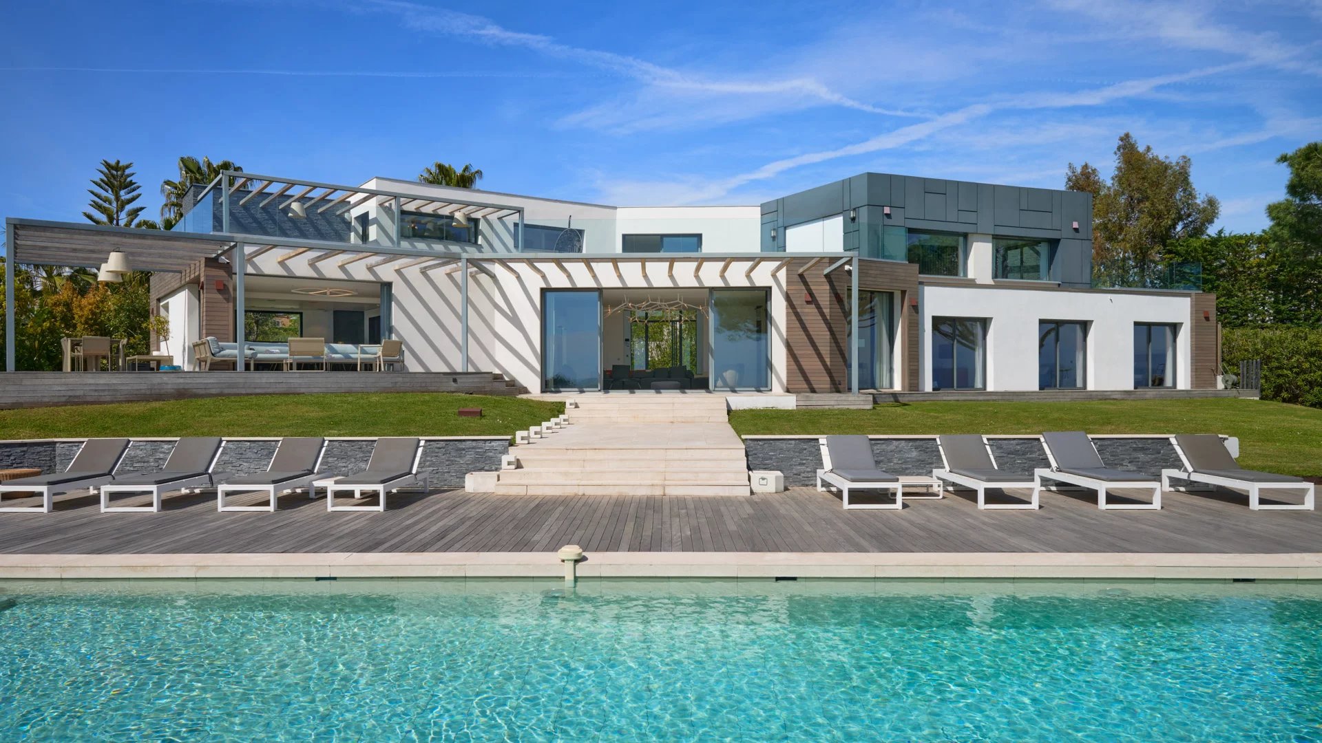 On the heights of Cannes, offering a unique view of the Lérins Islands, this magnificent contemporary villa combines wood and concrete in the heart of a park of about 6 200 sq.m. Completely renovated, the villa impresses with its generous volumes, the top of the range appointments throughout and three large terraces.