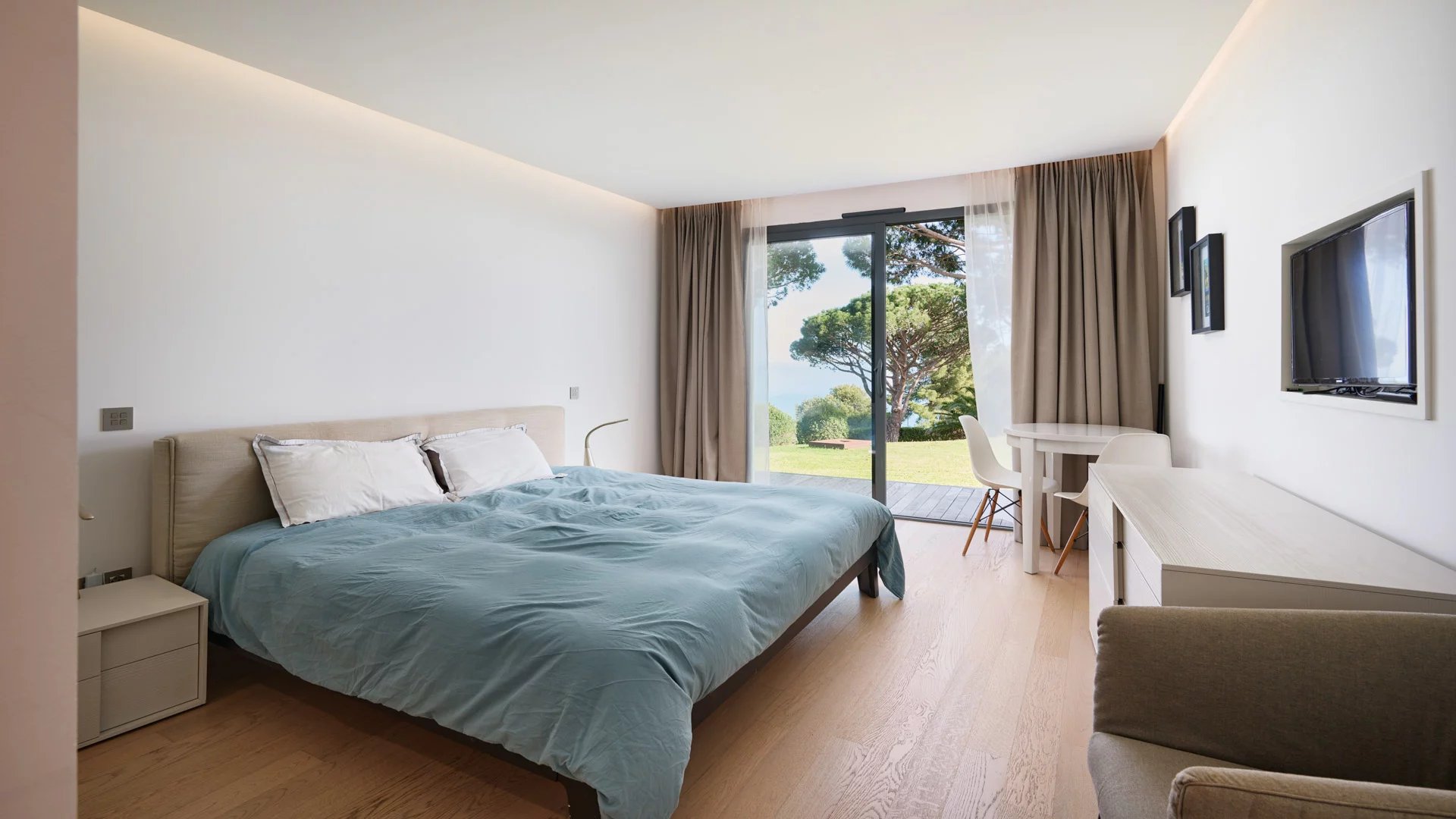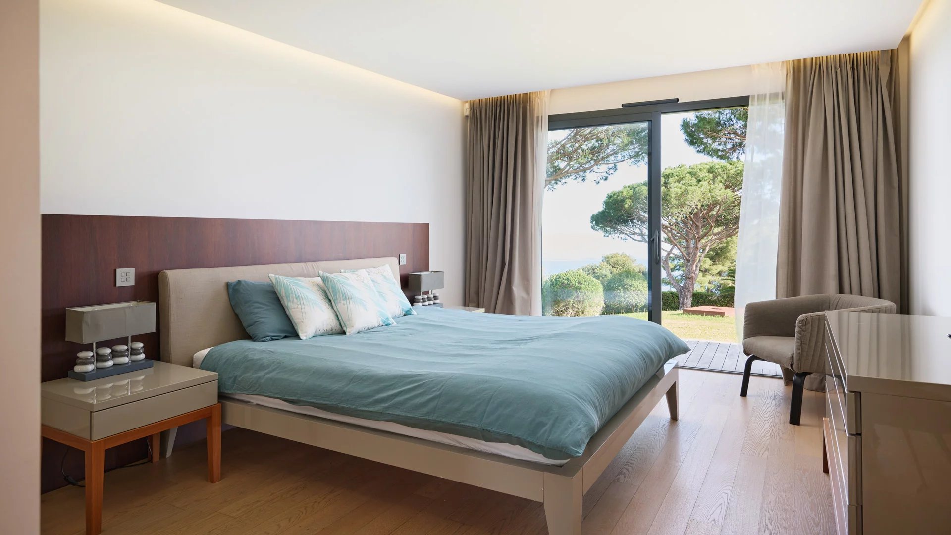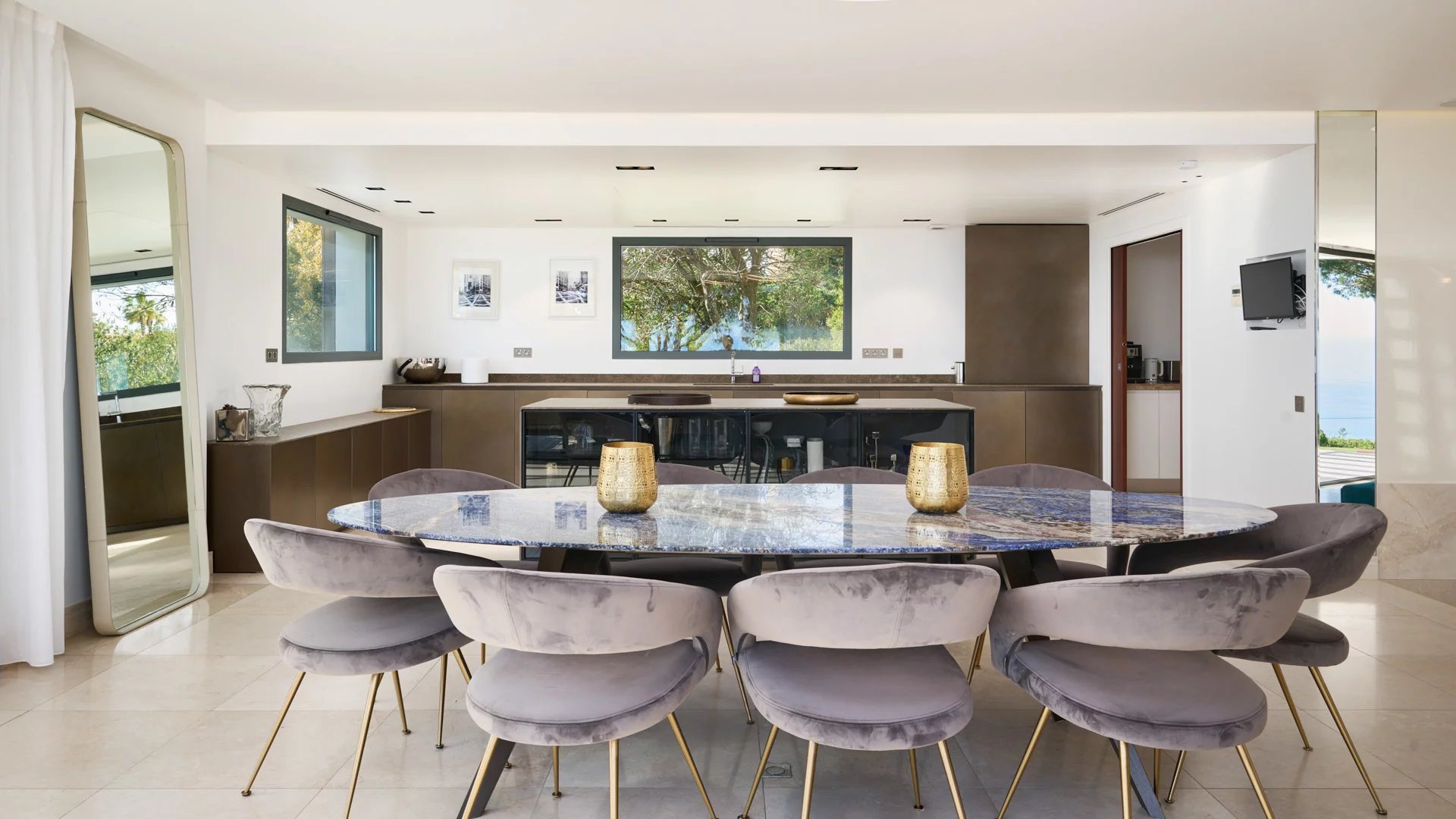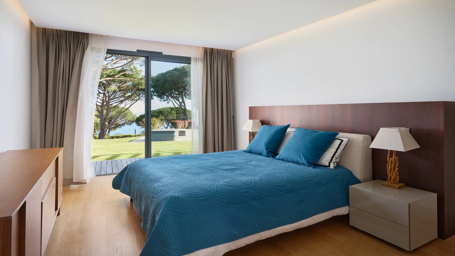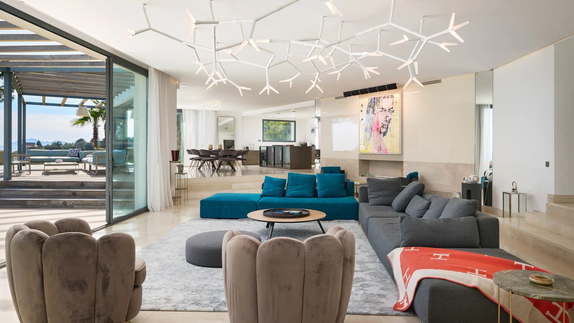 On the heights of Cannes, offering a unique view of the Lérins Islands, this magnificent contemporary villa combines wood and concrete in the heart of a park of about 6 200 sq.m. Completely renovated, the villa impresses with its generous volumes, the top of the range appointments throughout and three large terraces.
