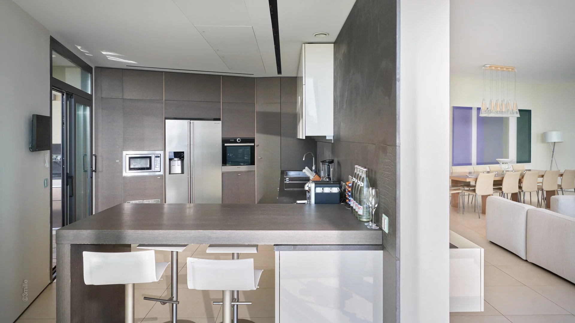 On arrival, you will be greeted by a majestic entrance, leading into a spacious reception room equipped with a TV, bar area, and fully equipped open-plan kitchen. A separate toilet and office area with sea views complete this space.
