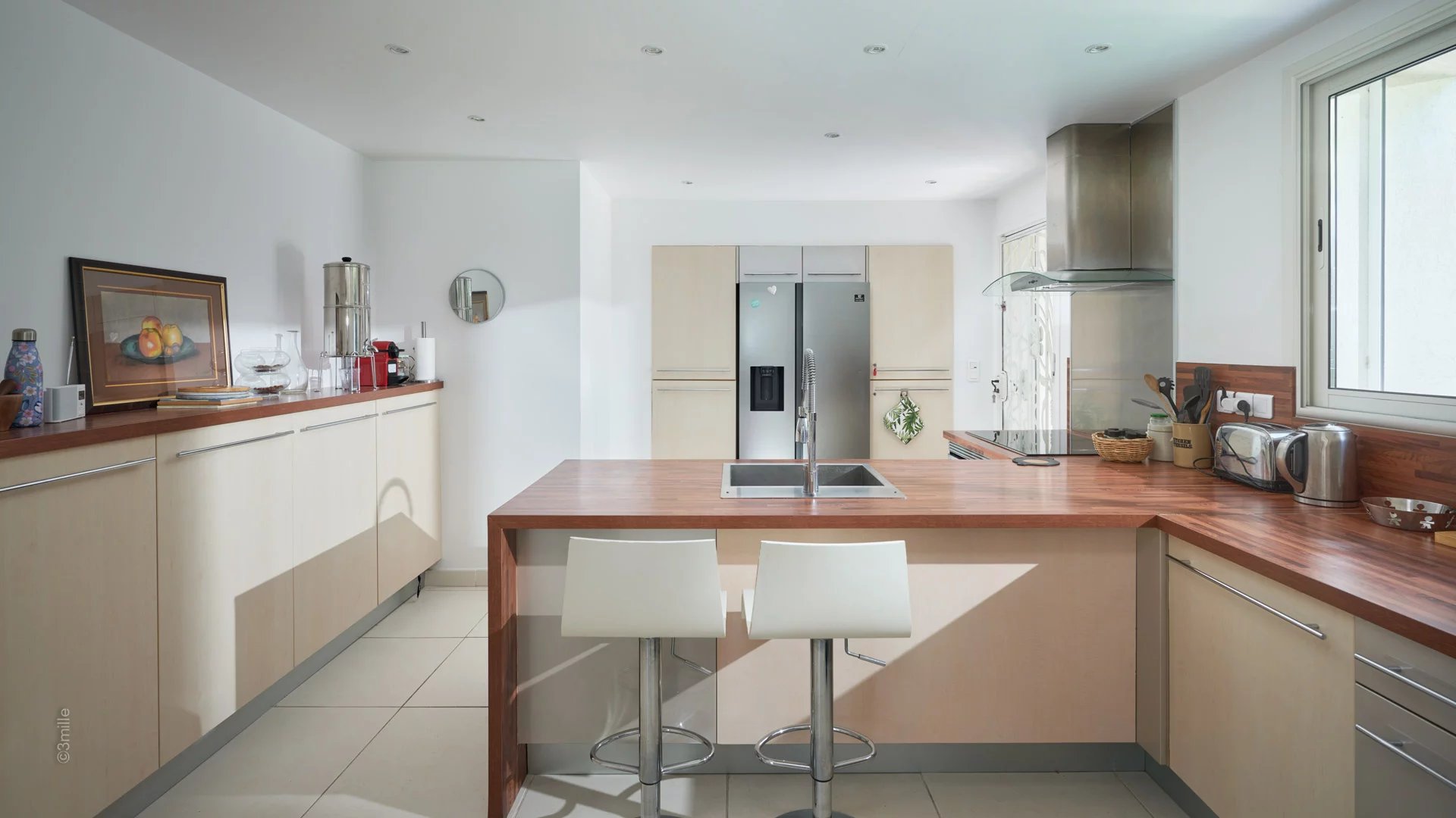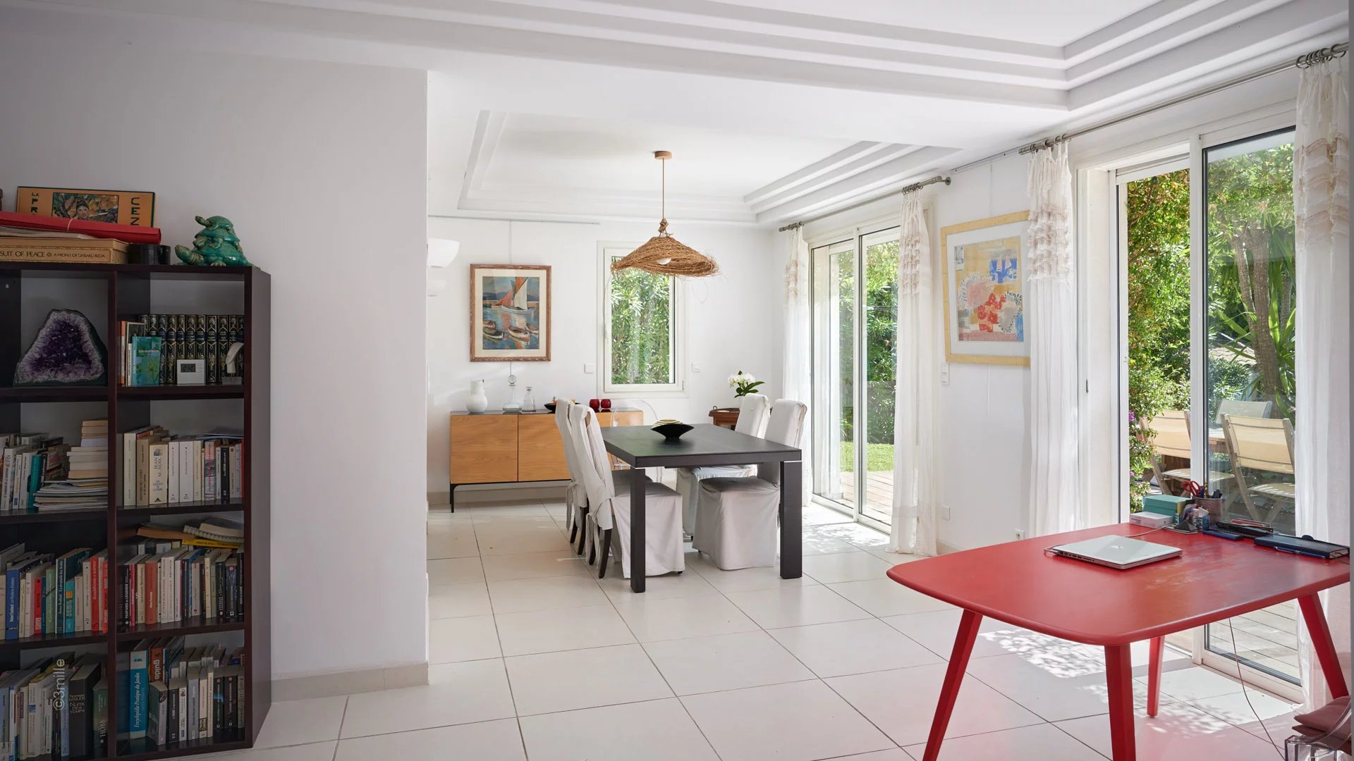 Learn moreEntrance hall giving onto the living-room opening onto the teck terrace, summer dining-room
