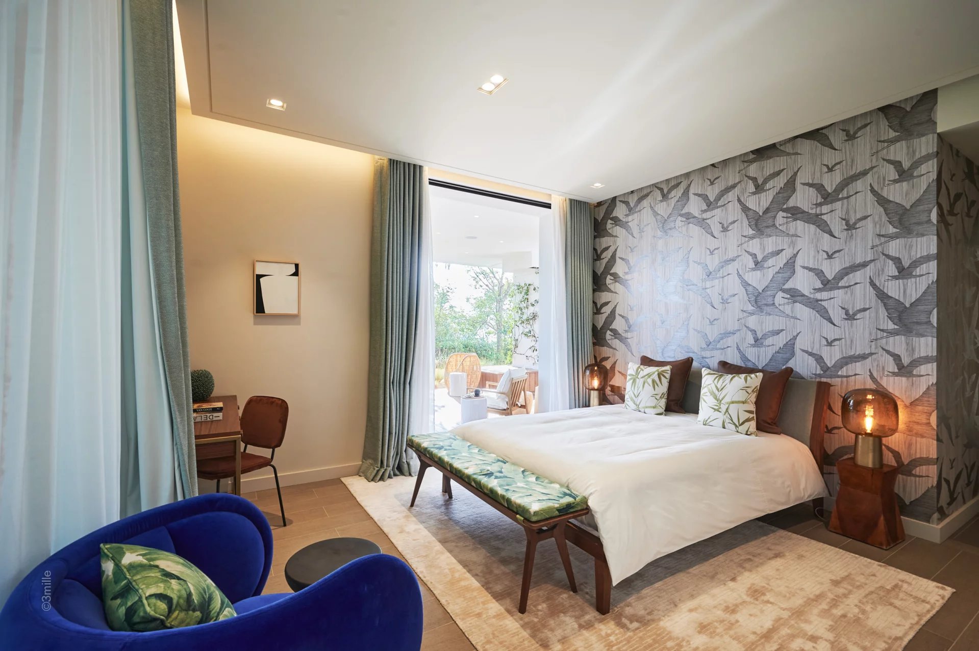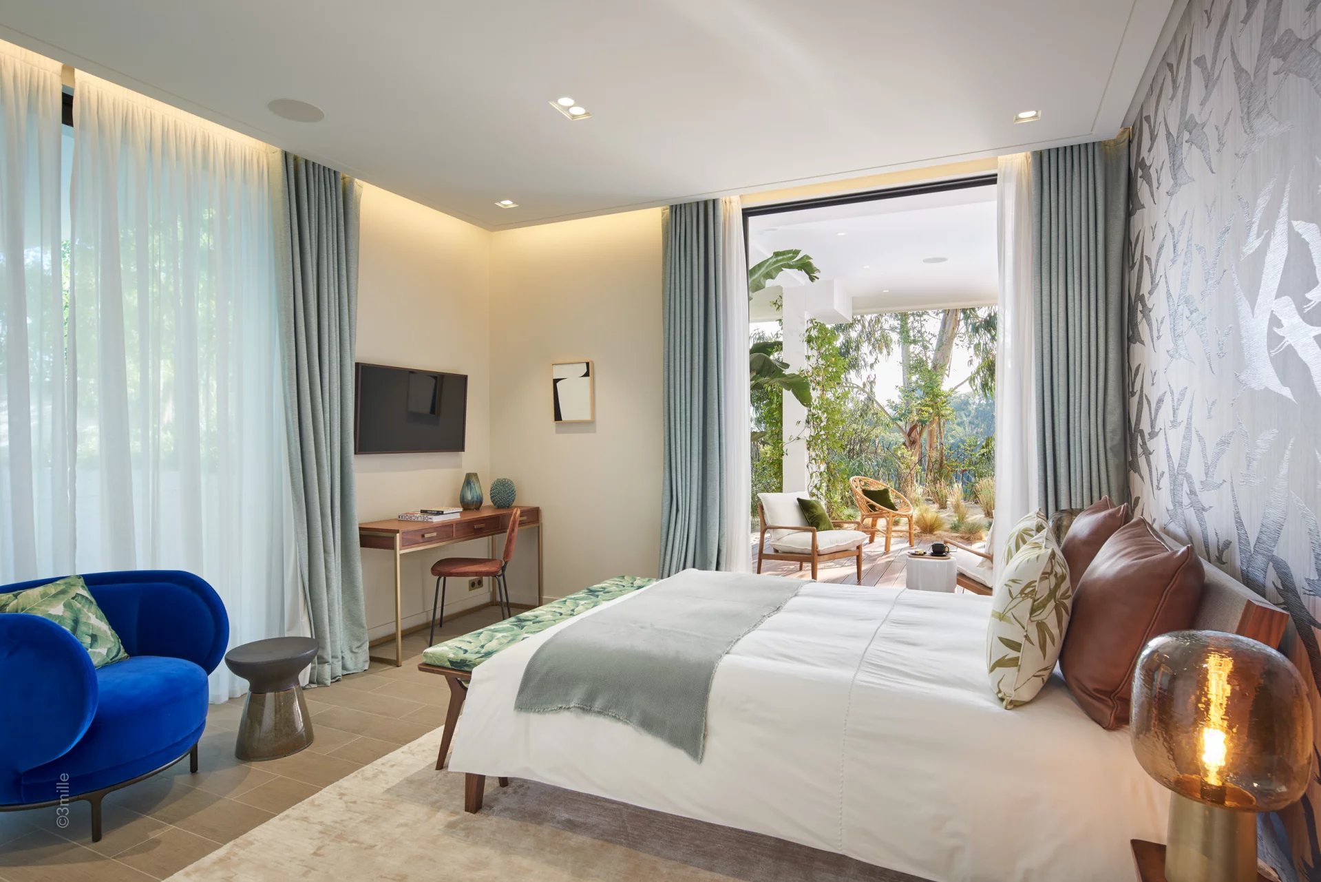 Divided into two distinct buildings, the main villa can accommodate up to 20 guests, spread across seven sumptuous suites, two additional bedrooms, and eight luxuriously appointed bathrooms. Two additional bedrooms for staff are located in the guest pavilion, ensuring discreet and attentive service.