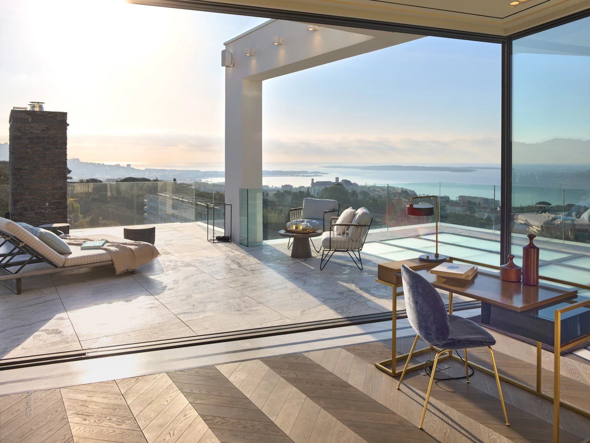 Luxury amenities abound, both indoors and outdoors, with a heated pool of 18 meters in length, outdoor fireplaces, landscaped gardens, sun loungers, an outdoor lounge, and a kitchen equipped with a barbecue. The rooftop offers breathtaking panoramic views of Cannes Bay, Le Suquet, and the Lérins Islands, while indoor amenities include a hammam, a sauna, a heated jacuzzi, a fitness room, a cinema/projection room, an aquarium, a panoramic elevator, two fireplaces, a fully equipped laundry room, two kitchens including a professional one, a dedicated internet line, iPads available, a centralized speaker system, video surveillance, and an alarm system for absolute peace of mind.