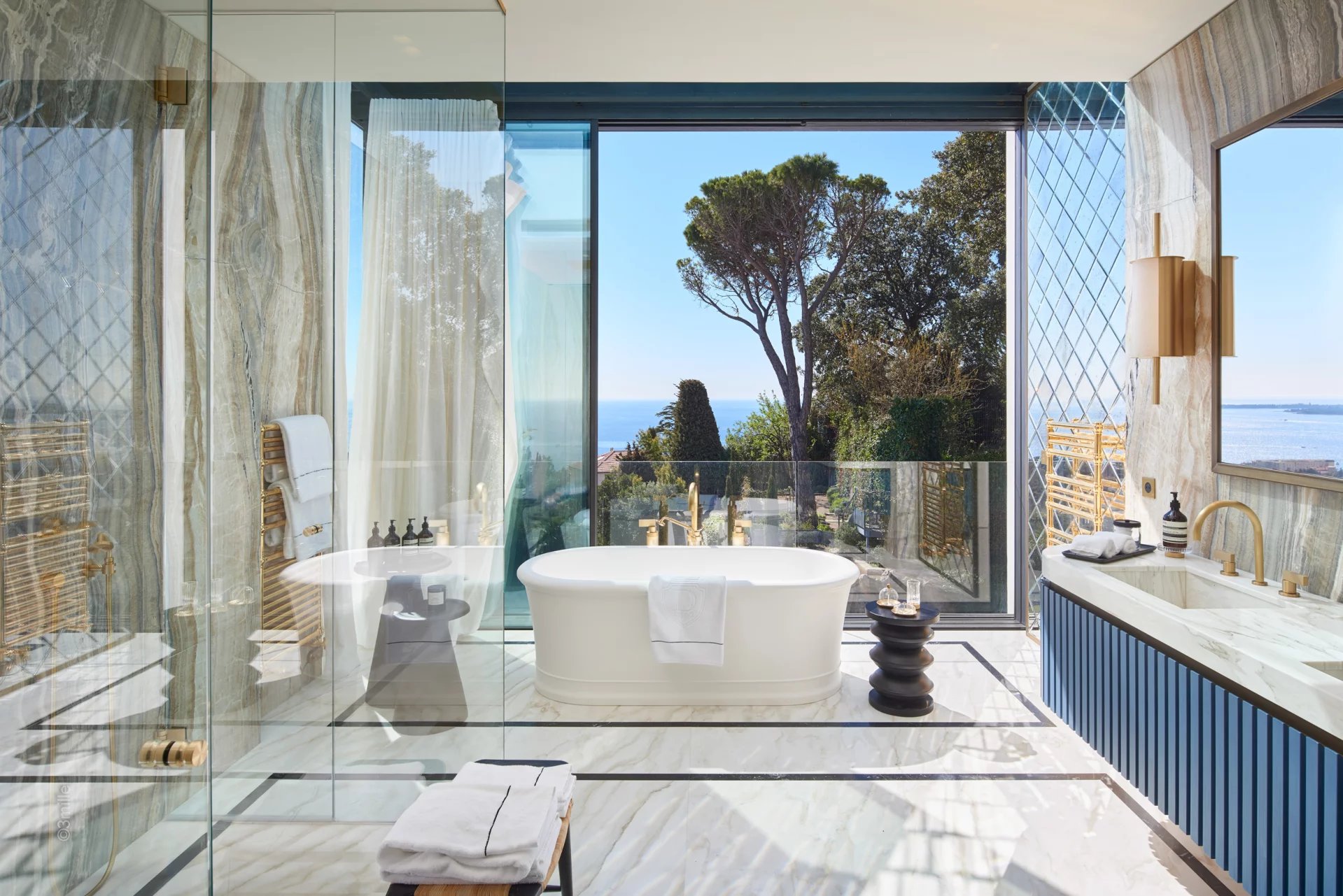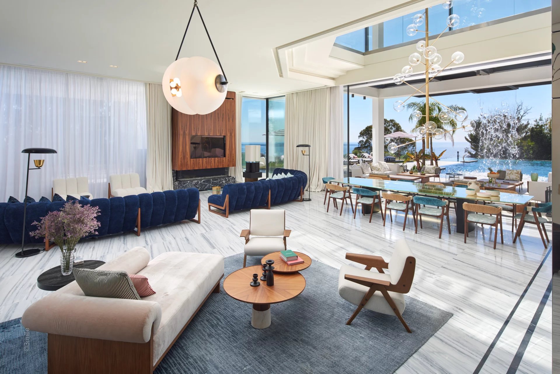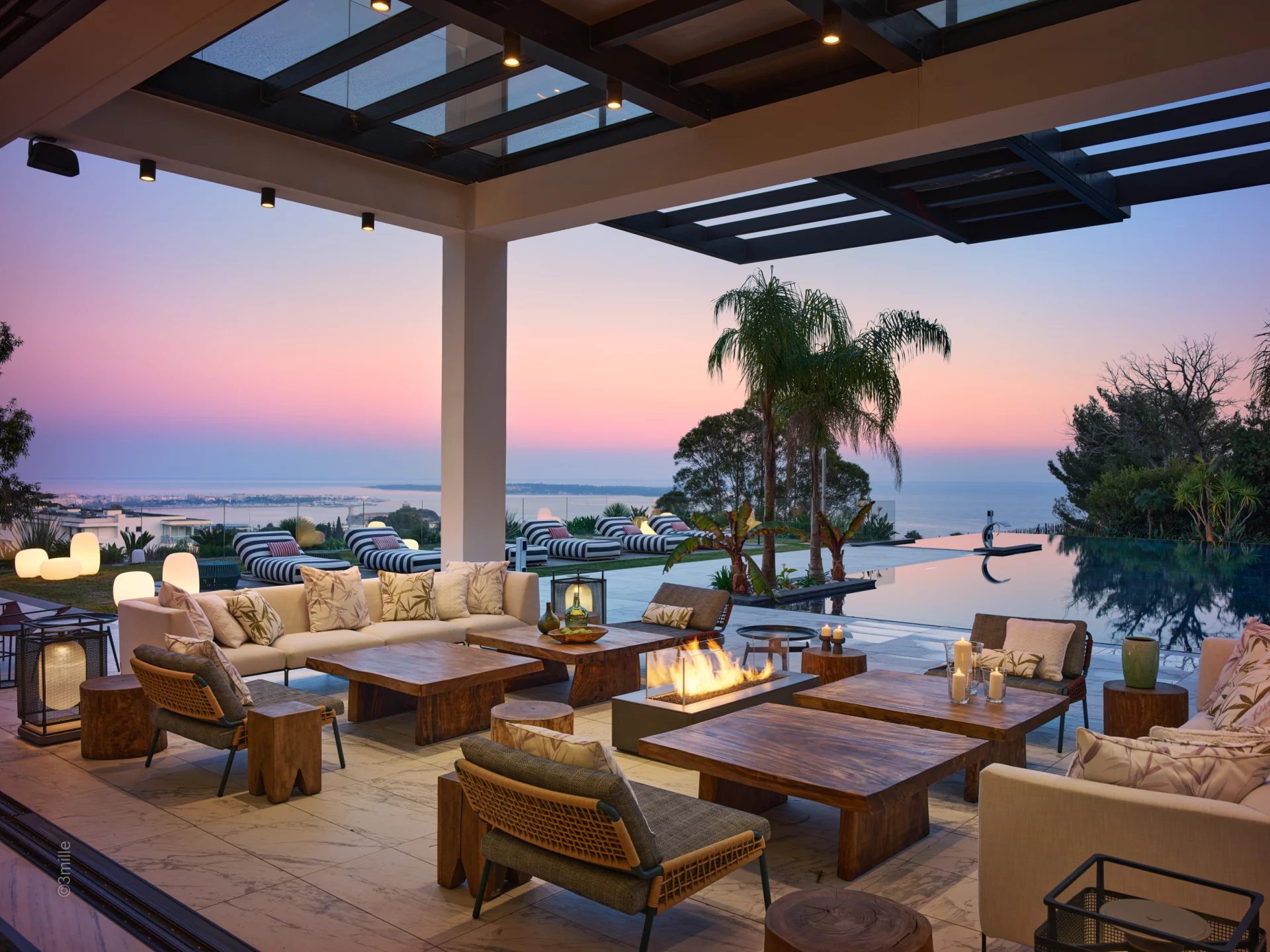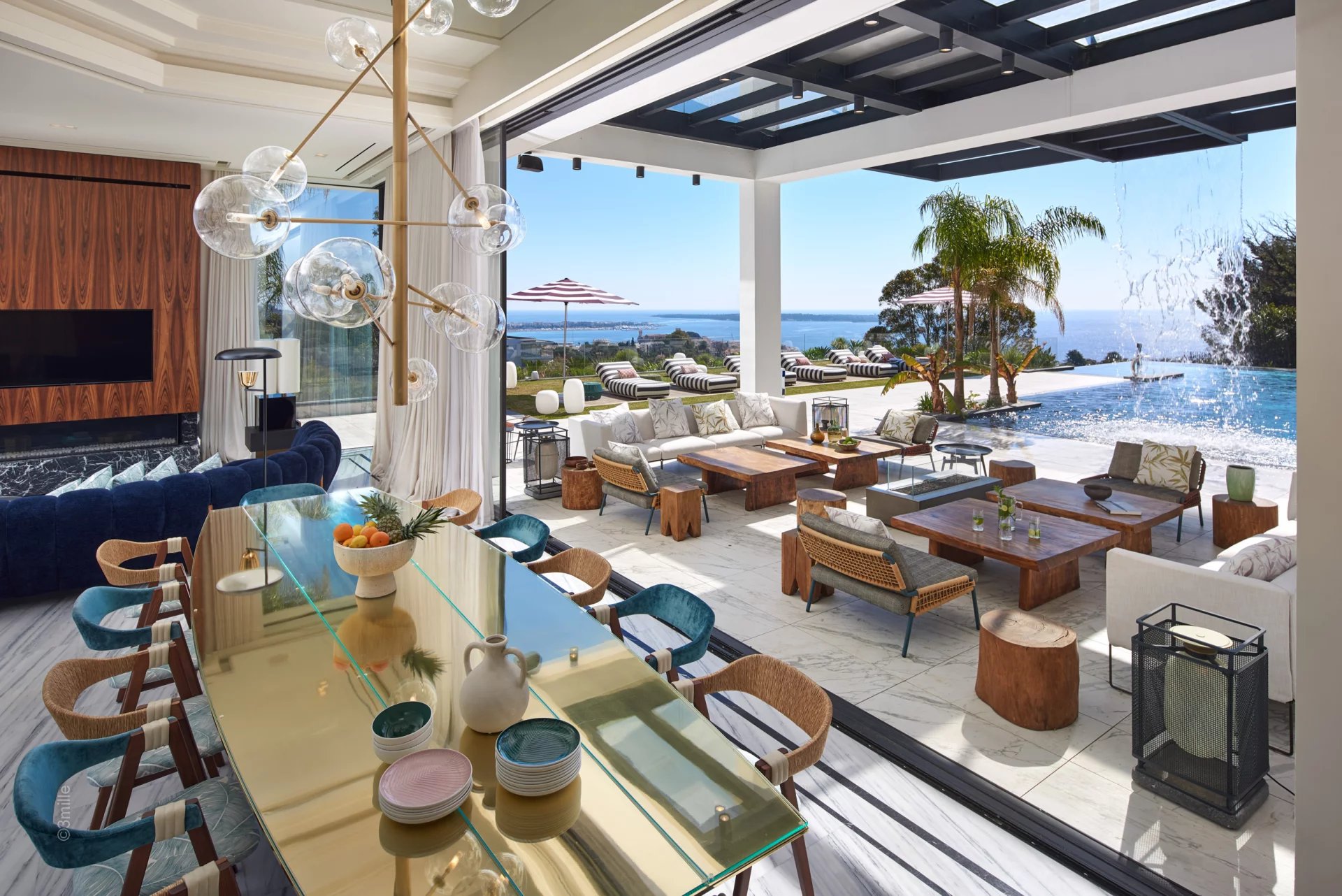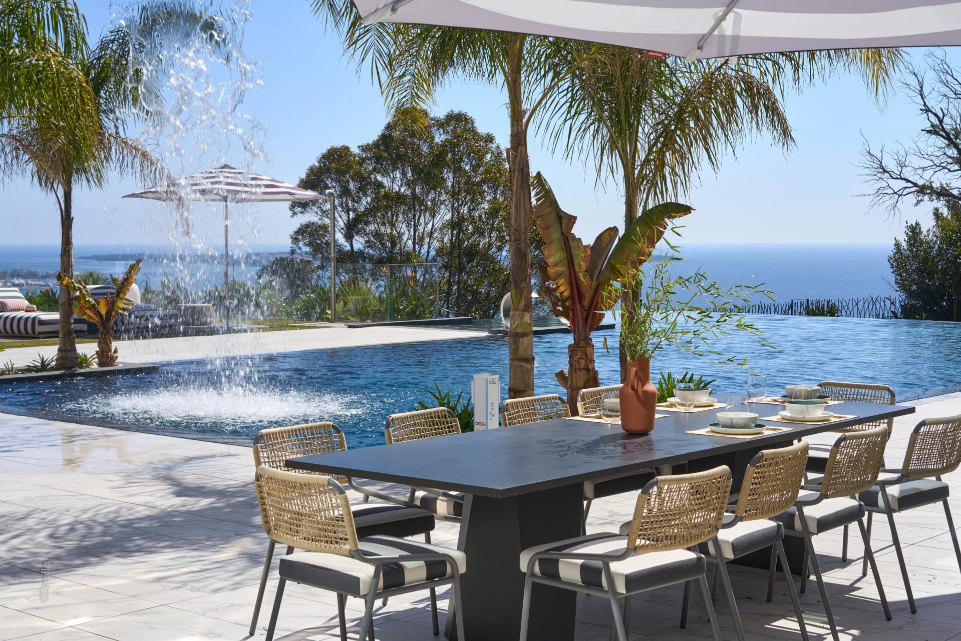 The outdoor spaces are equally magnificent, with a terrace on the ground floor equipped with a terrace around the pool with panoramic sea views, a fire pit, a barbecue, and a dining area, overlooking the heated pool and two cascades. The upper floors offer equipped panoramic terraces and relaxation areas with sun loungers and fire pits, while the Mediterranean garden on terraces includes a petanque court and a vegetable garden.
