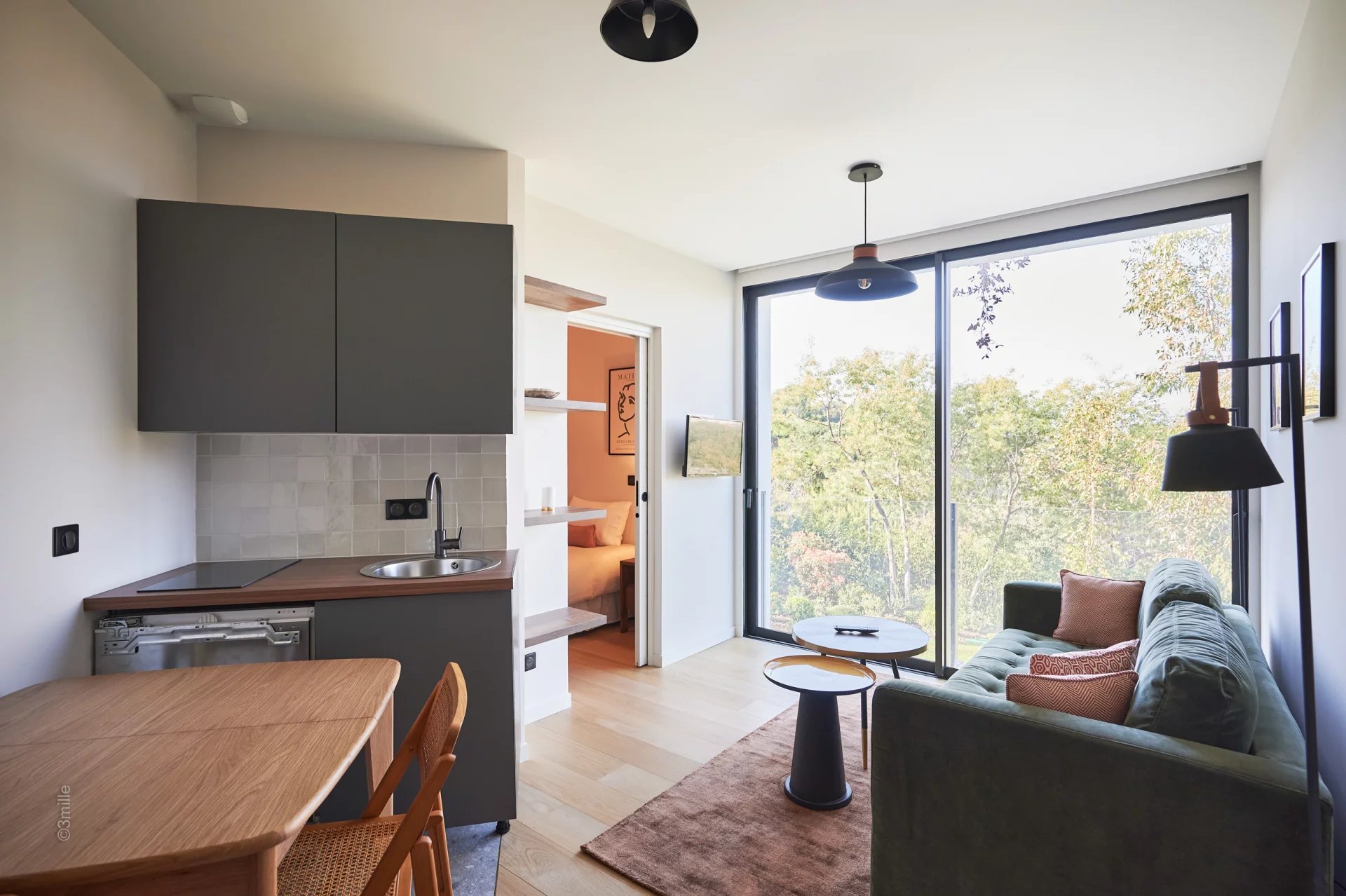 • On the ground floor, an elegant living room with fireplace and a fully equipped kitchen offer a welcoming living space.