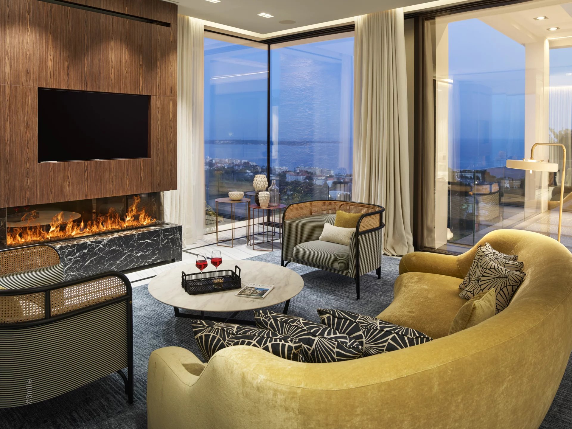 • The first floor hosts a lounge area with fireplace, opening onto a terrace with stunning sea views, an en-suite bedroom, and a family suite accommodating up to four people.