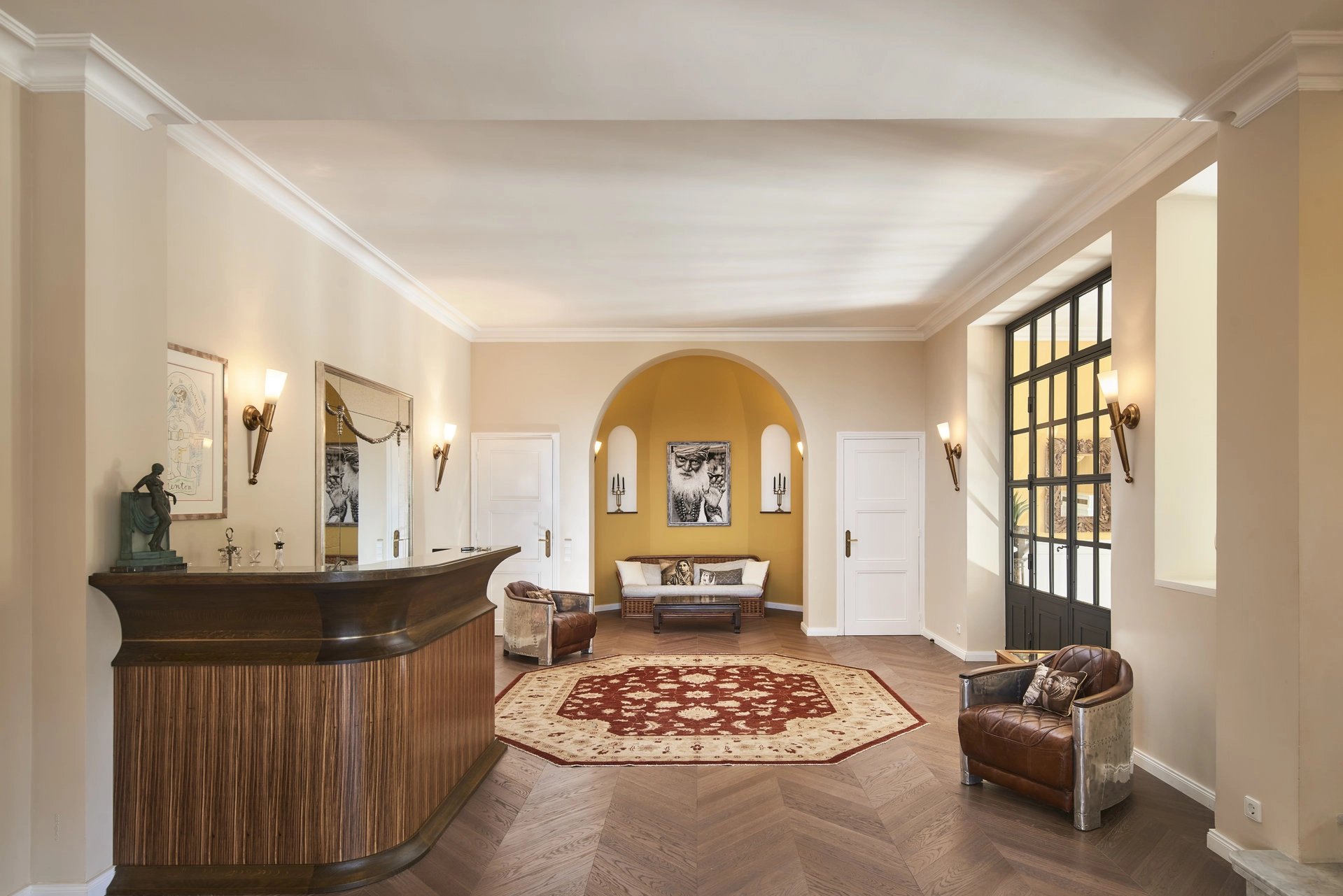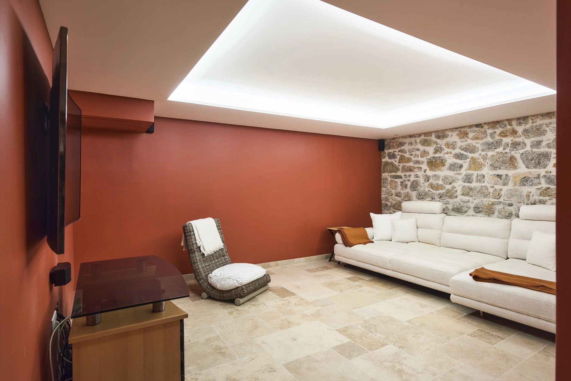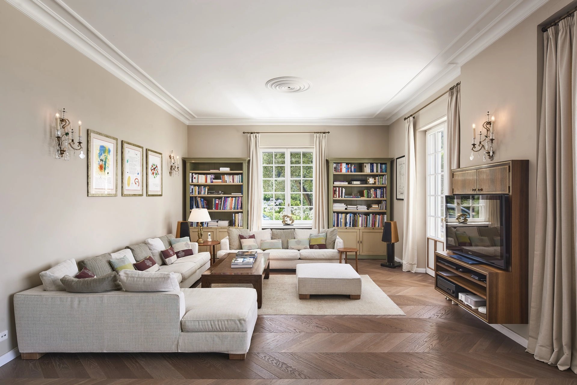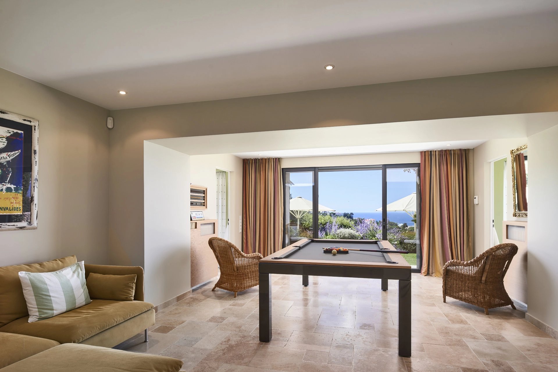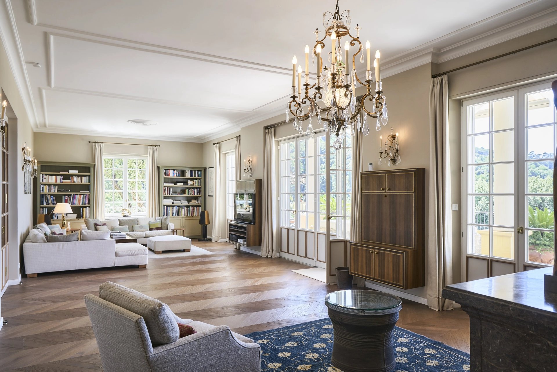 Double air conditioned living room of about 110 sq.m (flat screen TV, audio system Sonos) with fireplace, opening onto the main terrace, summer lounge, sea view