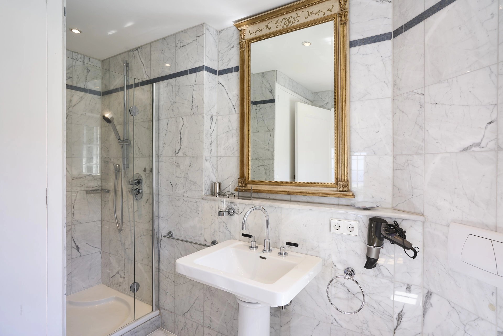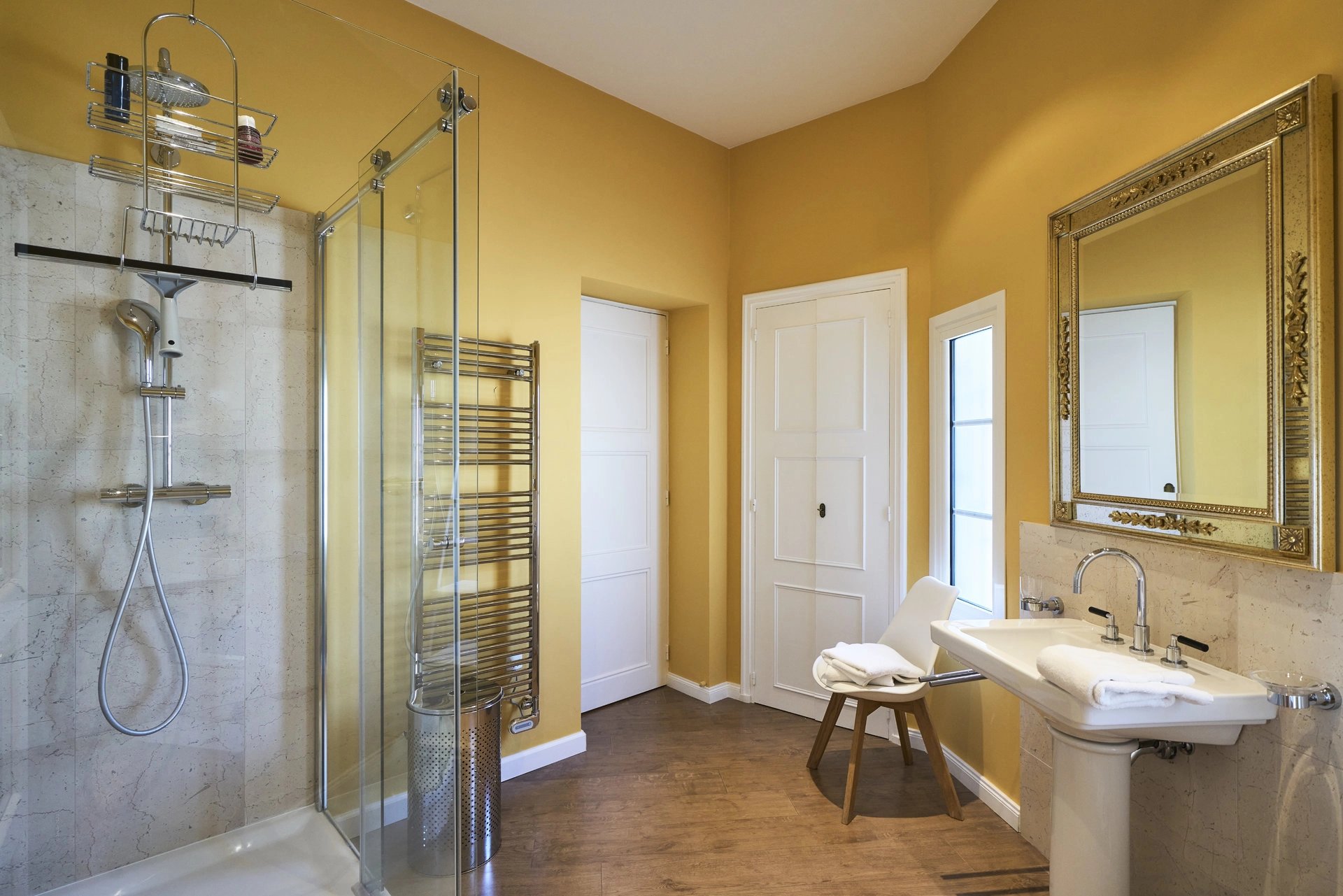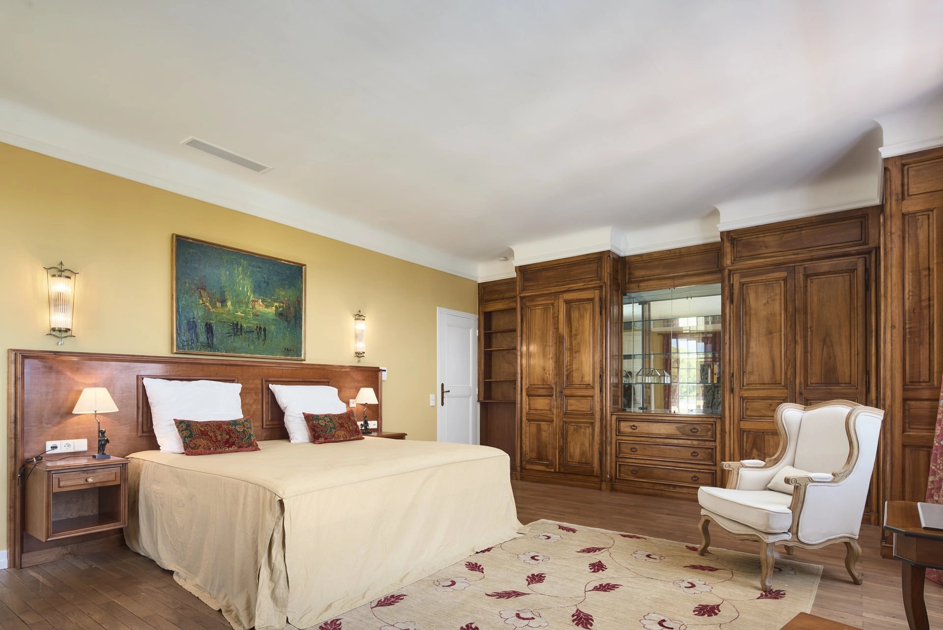 Air-conditioned Master bedroom (double bed, TV) with fireplace, bathroom / WC