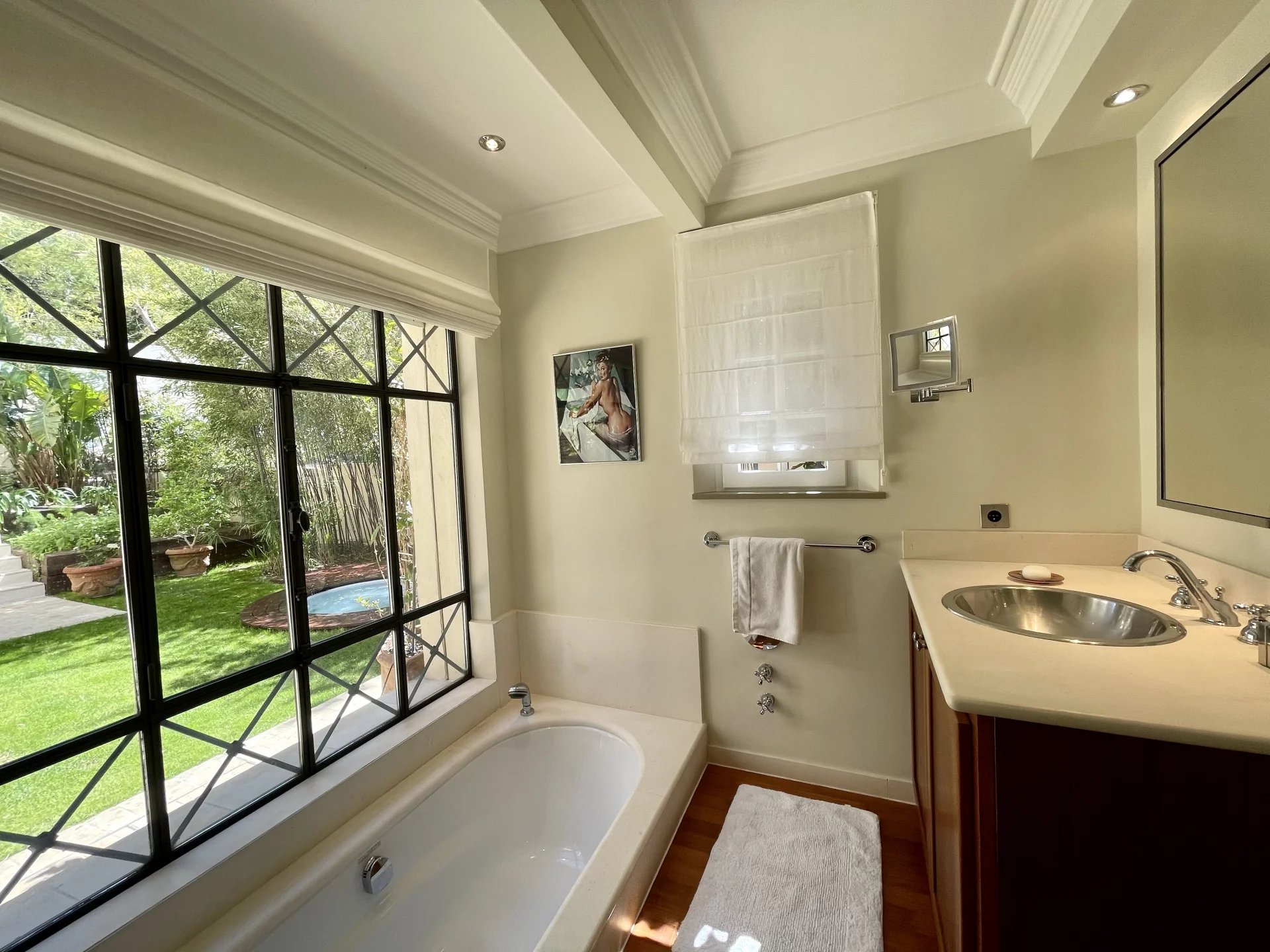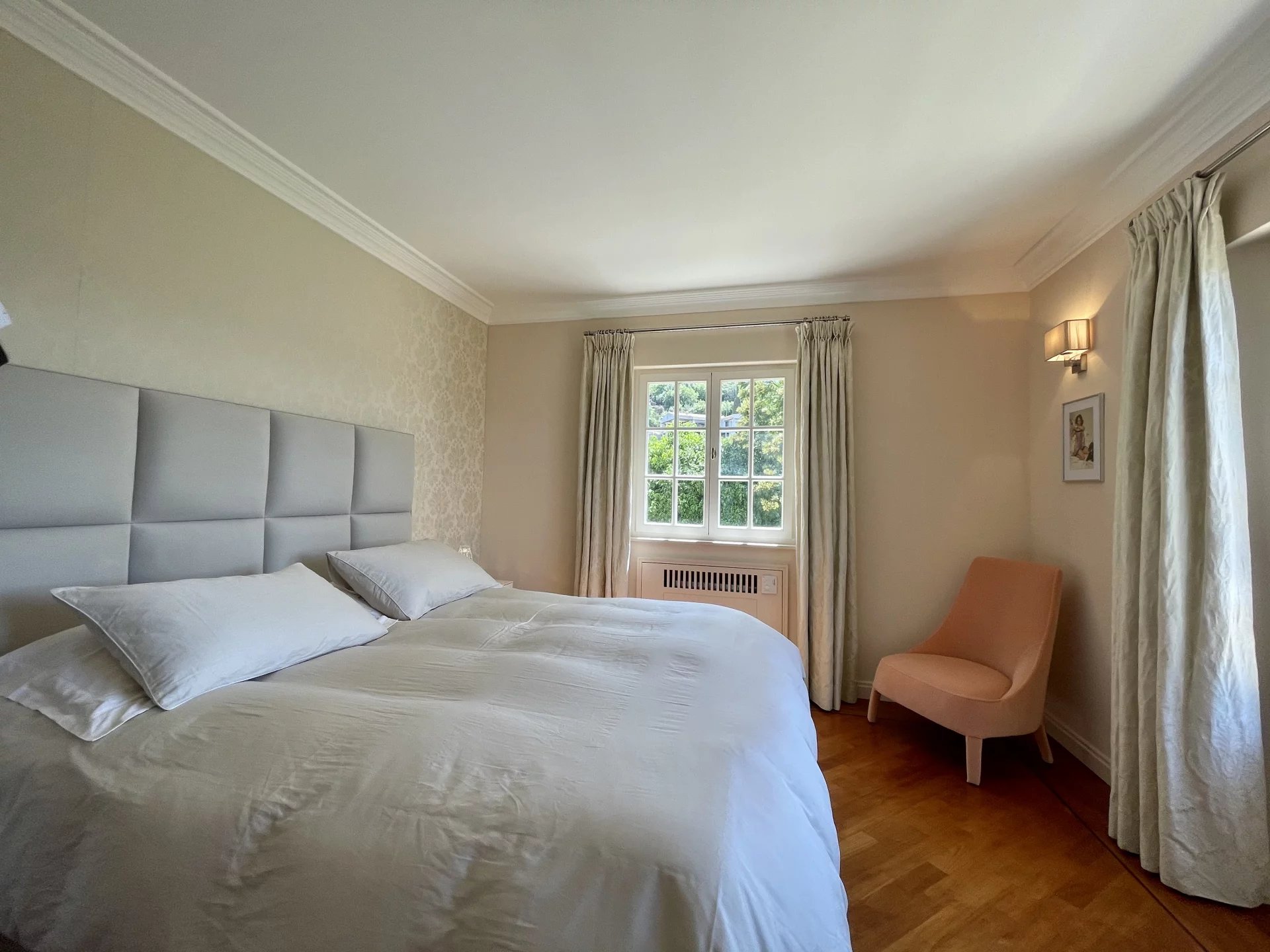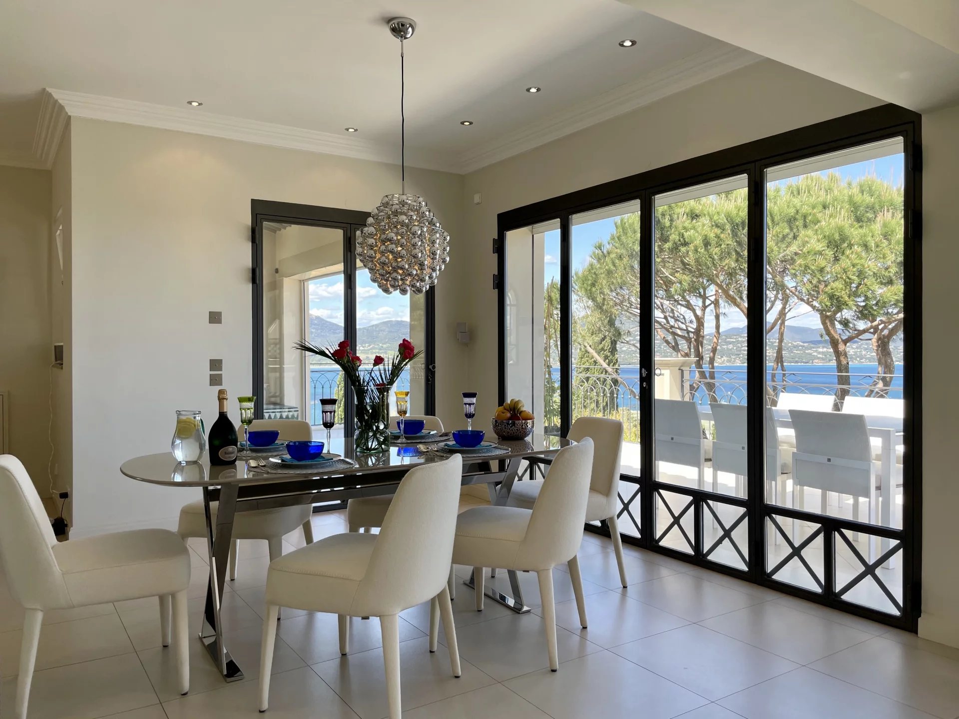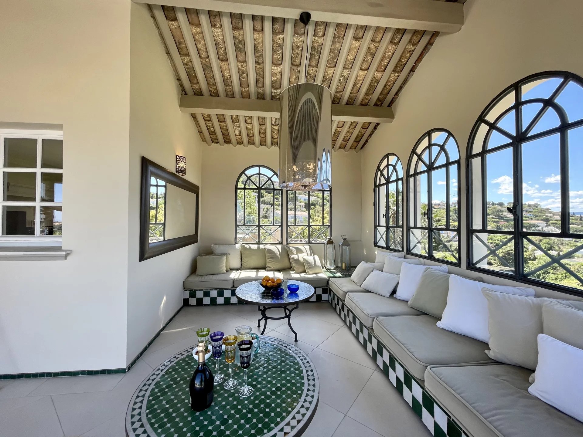 Located close to Saint-Tropez, in a private domain, this charming villa offers a great panoramic view over the harbor and the village of St Tropez and along the entire length of the Gulf.