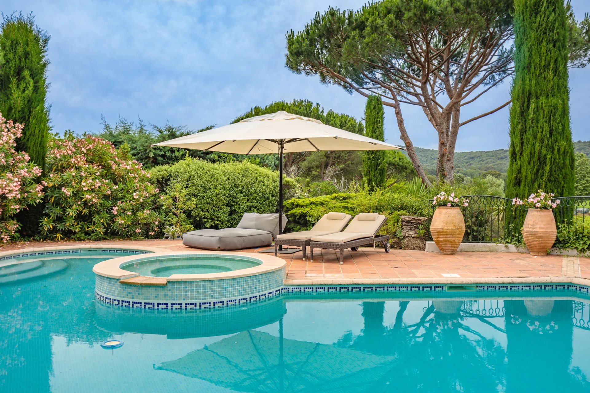 A swimming pool overlooking the vineyards invites you to relax while enjoying the surrounding quiet and landscaped garden.