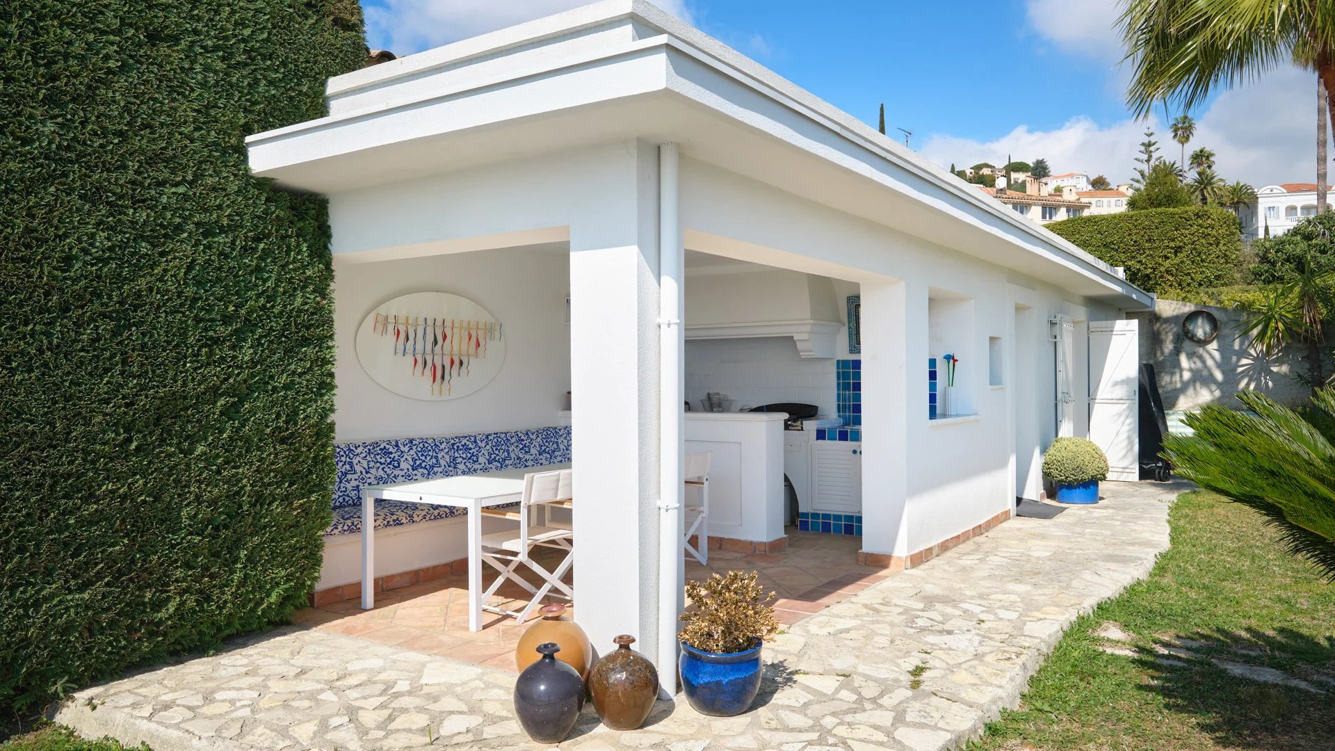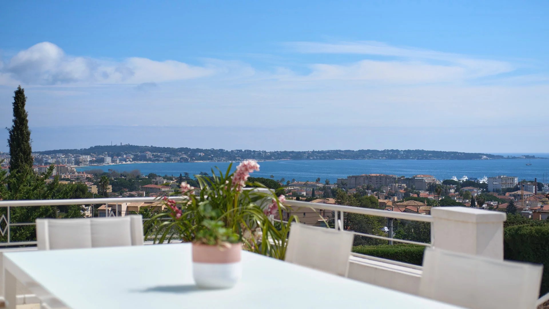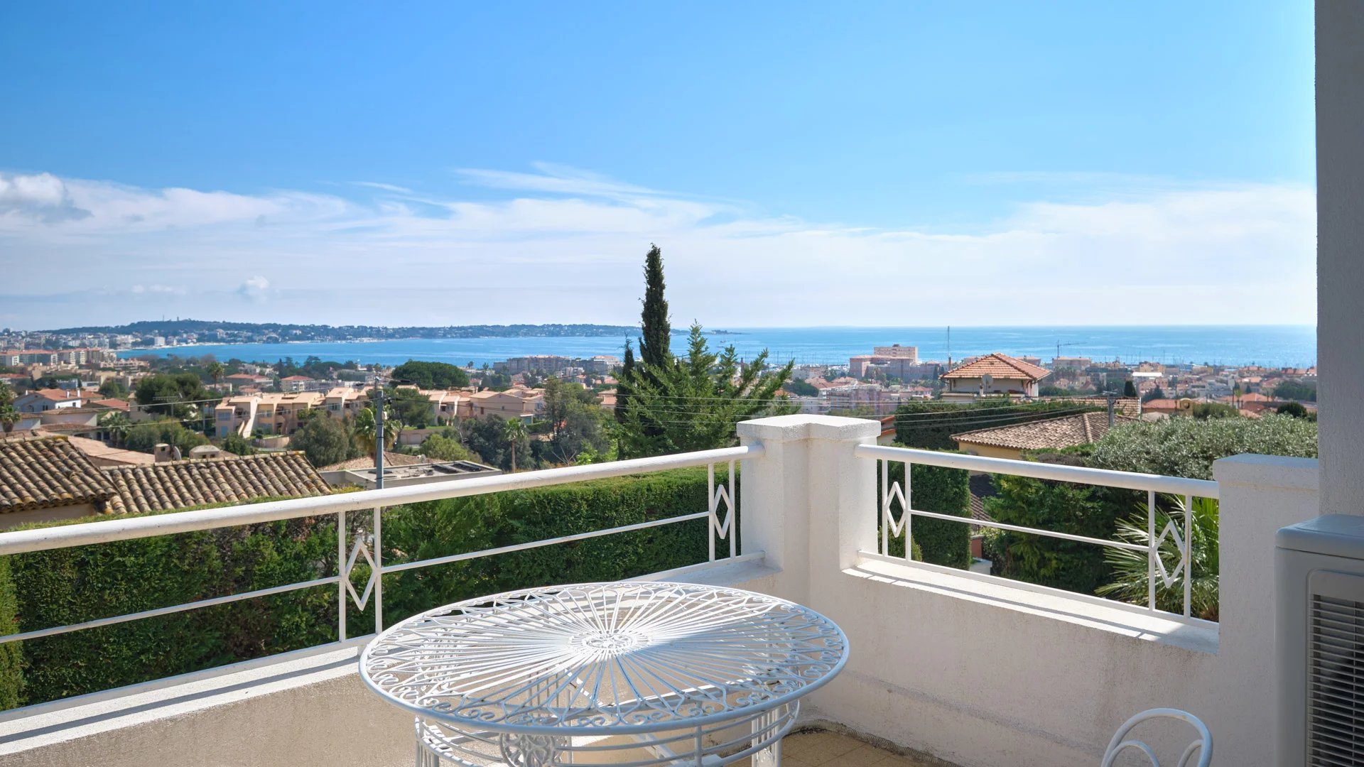 On the heights of Golfe-Juan and 800 m from the beaches, in the heart of a garden of 1,000 sq.m, modern villa of about 180 sq.m living area enjoying beautiful sea views.